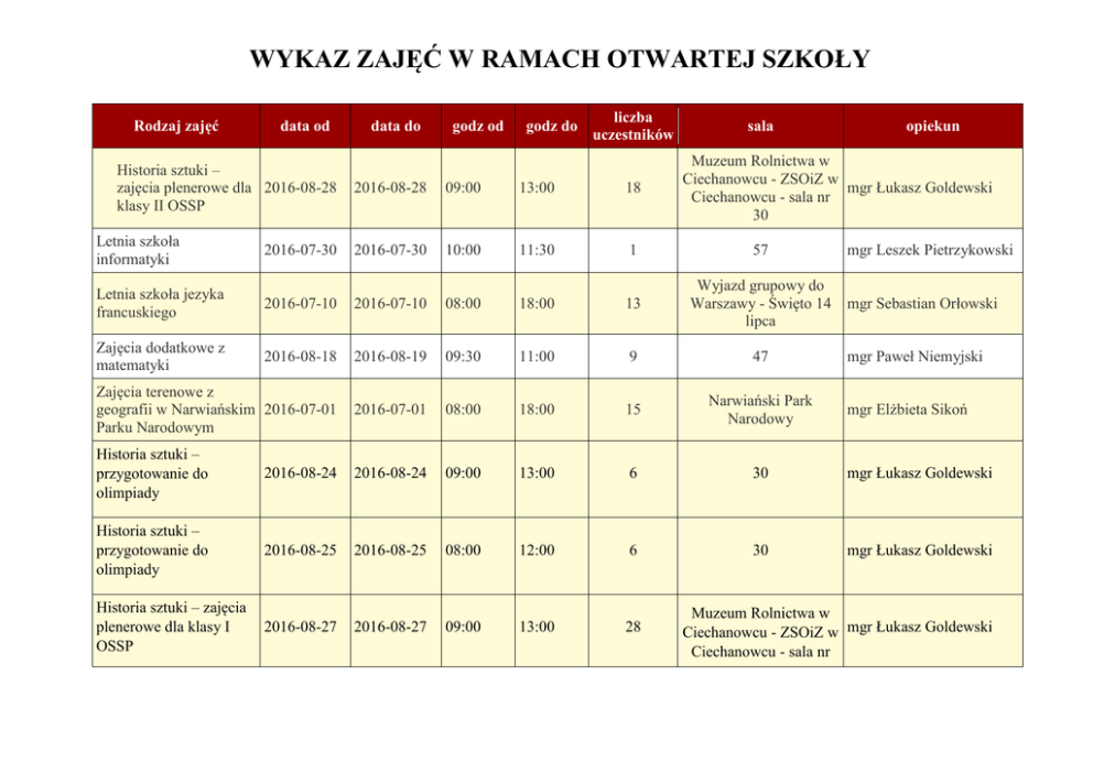 WYKAZ ZAJĘĆ W RAMACH OTWARTEJ SZKOŁY Rodzaj zajęć data od Historia sztuki – zajęcia plenerowe dla 2016-08-28 klasy II OSSP Letnia szkoła informatyki 2016-07-30 data do godz od godz do liczba uczestników sala opiekun Muzeum Rolnictwa w Ciechanowcu - ZSOiZ w mgr Łukasz Goldewski Ciechanowcu - sala nr 30 2016-08-28 09:00 13:00 18 2016-07-30 10:00 11:30 1 57 mgr Leszek Pietrzykowski Letnia szkoła jezyka francuskiego 2016-07-10 2016-07-10 08:00 18:00 13 Wyjazd grupowy do Warszawy - Święto 14 lipca Zajęcia dodatkowe z matematyki 2016-08-18 2016-08-19 09:30 11:00 9 47 Zajęcia terenowe z geografii w Narwiańskim 2016-07-01 Parku Narodowym 2016-07-01 08:00 18:00 15 Narwiański Park Narodowy Historia sztuki – przygotowanie do olimpiady 2016-08-24 2016-08-24 09:00 13:00 6 30 mgr Łukasz Goldewski Historia sztuki – przygotowanie do olimpiady 2016-08-25 2016-08-25 08:00 12:00 6 30 mgr Łukasz Goldewski Historia sztuki – zajęcia plenerowe dla klasy I OSSP 2016-08-27 2016-08-27 09:00 13:00 28 mgr Sebastian Orłowski mgr Paweł Niemyjski mgr Elżbieta Sikoń Muzeum Rolnictwa w Ciechanowcu - ZSOiZ w mgr Łukasz Goldewski Ciechanowcu - sala nr 30 Historia sztuki – zajęcia plenerowe dla klasy III OSSP 2016-08-29 2016-08-29 09:00 13:00 10 Muzeum Rolnictwa w Ciechanowcu - ZSOiZ w mgr Łukasz Goldewski Ciechanowcu - sala nr 30 Piłka siatkowa 2016-07-04 2016-07-07 10:30 12:00 8 Sala gimnastyczna w mgr Grażyna Panas ZSOiZ w Ciechanowcu Letnia szkoła informatyki 2016-08-28 2016-08-28 10:00 11:30 1 57 mgr Leszek Pietrzykowski Letnia szkoła informatyki 2016-07-05 2016-07-05 10:00 11:30 1 57 mgr Leszek Pietrzykowski Letnia szkoła informatyki 2016-07-07 2016-07-07 10:00 11:30 1 57 mgr Leszek Pietrzykowski Zajęcia laboratoryjne z chemii 2016-08-29 2016-08-30 10:00 14:00 4 53 - Laboratorium chemiczne Turystyka wodna dla młodzieży ( kajaki, rowery wodne) 2016-06-30 2016-07-05 09:30 12:30 25 Turystyka rowerowa dla młodzieży 2016-07-01 2016-07-06 09:30 12:30 15 Gry i zabawy ruchowe 2016-07-04 2016-07-07 09:30 12:30 15 mgr inż. Wojciech Kazimierz Cieszkowski Zalew w Ciechanowcu, mgr Tomasz Chomicz, mgr Rzeka Nurzec, Rzeka Arkadiusz Kędzierski, mgr Bug. Magdalena Kujawska Przebieg trasy wg programu. mgr Jacek Pietkiewicz, mgr Elżbieta Sikoń mgr Artur Jacek Szymoniak, Mała sala gimnastyczna mgr Irina Szymoniak Letnia szkoła fizyki na 2016-08-29 poziomie podstawowym. 2016-08-30 09:00 12:00 15 Laboratorium fizyczne nr 1 mgr Elżbieta Jakubowska Letnia szkoła fizyki dla gimnazjalistów. 2016-08-30 2016-08-30 12:00 15:00 15 Laboratorium fizyczne nr 1 mgr Elżbieta Jakubowska Wycieczka plenerowa do 2016-06-29 Drohiczyna 2016-06-29 08:00 18:00 20 mgr Cecylia Szmurło, Wyjazd do Drohiczyna mgr Ewa Skorupska, mgr Magda Załuska Rajdy rowerowe: Ciechanowiec- Koryciny 2016-07-11 - Ciechanowiec Hodyszewo Ciechanowiec - Granne 2016-07-15 08:00 18:00 10 Wyjazd grupowy. Warsztaty muzyczne dla 2016-08-23 młodzieży 2016-08-30 09:00 14:00 25 Aula – nr 7 mgr Karolina Faszczewska Dr Monika Ilczuk