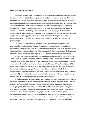 Józef Kopijasz – wspomnienia W drugiej połowie 1968 r. powierzono mi stanowisko kierownika walcowni w budowie. Zadaniem moim, oprócz bieżącej współpracy ze służbami inwestycyjnymi i projektowymi, reprezentując interesy przyszłego użytkownika, było przygotowanie walcowni do rozruchu i eksploatacji (nabór i szkolenie załogi, organizacja służb technologicznych i utrzymania ruchu, zabezpieczenie ruchu maszyn i urządzeń oraz potrzeb technologicznych). Szczególnie ważnym, ale i trudnym zadaniem do wykonania, było przygotowani załogi, ponieważ w rejonie Konina brak było tradycji walcowniczych, ale i przemysłowych. W budowanej walcowni blach i taśm instalowane walcarki i linie technologiczne obróbki końcowej nie miały odpowiednika w pracujących walcowniach blach aluminium. Dlatego w koncepcji przygotowania załogi przyjęto różnorodne formy i miejsca szkolenia teoretycznego i praktycznego. Trudnym do rozwiązania problemem było wcześniejsze przyjęcie załogi dla przeprowadzenia odpowiednio długiego (ale potrzebnego) szkolenia, ze względu na przydzielane odgórnie etaty. Zbiegiem okoliczności walcownia w Łabędach posiadała wolne etaty i zgodziła się przyjąć absolwentów konińskiego technikum Mechaniczno-Elektrycznego oraz Zasadniczej szkoły Zawodowej już w 1970 r. z zapewnieniem miejsc hotelowych. Pionierami tego przedsięwzięcia byli między innymi Leokadia Hyś, Marian Kamiński, Józef Topolski, Bogumił Perkowski, Tadeusz Jańczak, Józef Kantarowski, Ryszard Talaga, Tadeusz Wójkowski. Wytrzymali dłużej niż zakładano okres pracy poza Koninem. Grupa ta, wzmocniona doświadczonymi walcownikami: Longin Olearski (WMŁ), Antoni Zając (ZML Kęty), po przeszkoleniu praktycznym w walcowniach zagranicznych stanowiła trzon załogi technologicznej. Znaczna grupa ślusarzy i elektryków huty (wśród nich: Bolesław Wojciechowski, Stanisław Mietliński, Ryszard Durski, Bogdan Kowalkowski, Leon Tokłowicz, Jan Krzyżak) wzmocniła służby utrzymania ruchu, które zapoznawały się z urządzeniami, biorąc udział w końcowym montażu i rozruchu mechanicznym. Podobna sytuacja wystąpiła wśród kadry inżynieryjno-technicznej zarówno w dozorze wyższym, jak i średnim. Pracę w walcowni podejmowali głównie absolwenci lat 70. z AGH i Politechniki Poznańskiej: Stanisław Płoszek, Mieczysław Bąk, Eugeniusz Andrzejewski, Andrzej Rogulski, Stanisław Molo, Jan Kózka, Marek Matuszak. Szkoląc się praktycznie w tych samych zakładach, uczestniczyli bezpośredni w przygotowaniu załogi i walcowni do rozruchu. Aktywnie w pracach organizacyjnych i szkoleniowych uczestniczył trochę wcześniejszy absolwent AGH, od kilku lat pracujący w hucie mgr inż. Waldemar Wasiczek. Kadra ta została uzupełniona o pracowników z innych walcowni, którzy wyrazili chęć przejścia do ,,Konina”. Byli wśród nich: Zbigniew Jop, Emil Kilian z ZML, Józef Kózka z WMD, Jan Wątorek – HiL, Alfons Mazurek – Huta Częstochowa oraz z huty – Jerzy Królikowski i Jerzy Lange. Tę grupę z dużym zaangażowaniem wzmacniał główny energetyk huty mgr inż. Kazimierz Furman (razem podejmowaliśmy pracę w hucie, chodząc z kartą obiegową). Przyszedł z Huty Częstochowa, gdzie przez wiele lat pracował na stanowisku kierownika utrzymania ruchu walcowni. Tam zdobył duża wiedze oraz praktykę zawodową. Potrafił pracować z ludźmi, niejednokrotnie łagodząc ostre starcia. Był zapalonym kibicem sportowym. Do przeglądania prasy sportowej wykorzystywał czas przeznaczony na drogę między wydziałami, którą codziennie musiał przejść. Rozruch technologiczny prowadzony już był przez załogę walcowni, wcześniej przygotowana organizacyjnie i technologicznie (programy i harmonogramy, instrukcje technologiczne i obsługi) przez kadrę. W okresie tym sprawdzane i doprowadzane były urządzenia walcownicze, ale także załoga z kadrą włącznie. Młodzież zdobywała ostrogi doświadczonej kadry. Na przykład na walcarce gorącej, przy koledze Kazimierzu Furmanie koledzy Lajos Nagy, Stanisław Płoszek, Stanisław Molo, Eugeniusz Kniat. Wspomagali ich projektanci walcarki inż. Bartman i inż. Panz – hydraulika. Stronę elektryczną załatwiała sprawnie grupa rozruchowa z Krakowa. Walcarki zimne – grupie rozruchowej szefował inż. Marian Nowak i – z walcowni inż. inż. Zbigniew Jop, Eugeniusz Andrzejewski, Marek Matuszak, Mieczysław Bak oraz grupa specjalistów radzieckich z inż. Kiriaczenką. Wystąpiły tu poważne problemy ze ,,zmuszeniem” do współpracy walcarek radzieckich z nowoczesnym olejowym chłodzeniem i smarowaniem technologicznym walców z Anglii. Linie obróbki końcowej taśm i blach (cięcie, prostowanie, konserwacja) zostały opanowane przez nasza kadrę. Szef grupy rozruchowej inż. Waldemar Wasiczek wspomagany przez inż. Andrzeja Krogulskiego oraz Stanisława Mietlińskiego, Jana Krzyżaka i czeska grupę rozruchowa, bardzo sprawnie i szybko doprowadzili wszystkie linie do poprawnej pracy. Uczestniczyli w tym koledzy z Biprometu – Baranowski, Galubiński, Ziętkiewicz oraz dyrektor techniczny huty Roman Łopata, chcący nawet ,,brechą” pomagać wejściu wlewka między walce, główny inżynier energio-mechaniczny Hipolit Dragan – sprawnie władający ostrym językiem, szef zaopatrzeniowców Jaremi Godziszewski i inspektor nadzoru inż. Antoni Hejnowicz oraz wielu innych. Po latach pamięć może zawodzić w ocenie wielu faktów i zdarzeń, dlatego do oceny przygotowania i pracy młodej załogi walcowni niechaj posłuży fakt, że już w dziewiątym miesiącu eksploatacji została osiągnięta zdolność produkcyjna walcowni.