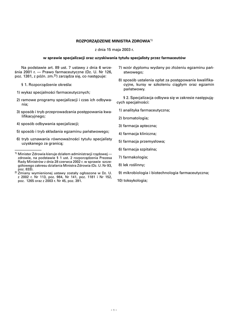 ROZPORZÑDZENIE MINISTRA ZDROWIA1) z dnia 15 maja 2003 r. w sprawie specjalizacji oraz uzyskiwania tytu∏u specjalisty przez farmaceutów 7) wzór dyplomu wydany po z∏o˝eniu egzaminu paƒstwowego; Na podstawie art. 89 ust. 7 ustawy z dnia 6 wrzeÊnia 2001 r. — Prawo farmaceutyczne (Dz. U. Nr 126, poz. 1381, z póên. zm.2)) zarzàdza si´, co nast´puje: 8) sposób ustalenia op∏at za post´powanie kwalifikacyjne, kursy w szkoleniu ciàg∏ym oraz egzamin paƒstwowy. § 1. Rozporzàdzenie okreÊla: 1) wykaz specjalnoÊci farmaceutycznych; 2) ramowe programy specjalizacji i czas ich odbywania; § 2. Specjalizacja odbywa si´ w zakresie nast´pujàcych specjalnoÊci: 3) sposób i tryb przeprowadzania post´powania kwalifikacyjnego; 4) sposób odbywania specjalizacji; 1) analityka farmaceutyczna; 2) bromatologia; 3) farmacja apteczna; 5) sposób i tryb sk∏adania egzaminu paƒstwowego; 4) farmacja kliniczna; 6) tryb uznawania równowa˝noÊci tytu∏u specjalisty uzyskanego za granicà; 5) farmacja przemys∏owa; 6) farmacja szpitalna; ——————— 1) Minister Zdrowia kieruje dzia∏em administracji rzàdowej — zdrowie, na podstawie § 1 ust. 2 rozporzàdzenia Prezesa Rady Ministrów z dnia 28 czerwca 2002 r. w sprawie szczegó∏owego zakresu dzia∏ania Ministra Zdrowia (Dz. U. Nr 93, poz. 833). 2) Zmiany wymienionej ustawy zosta∏y og∏oszone w Dz. U. z 2002 r. Nr 113, poz. 984, Nr 141, poz. 1181 i Nr 152, poz. 1265 oraz z 2003 r. Nr 45, poz. 391. -1- 7) farmakologia; 8) lek roÊlinny; 9) mikrobiologia i biotechnologia farmaceutyczna; 10) toksykologia; 11) zdrowie publiczne; b) pisanie zgodnie z zasadami ortografii, 12) zdrowie Êrodowiskowe. c) porozumiewanie si´ z pacjentami, farmaceutami i przedstawicielami innych zawodów medycznych; § 3. 1. Ustala si´ ramowy program specjalizacji, który okreÊla: 8) zakres egzaminu paƒstwowego, który musi odpowiadaç zakresowi wiedzy teoretycznej i umiej´tnoÊci praktycznych okreÊlonych w programie odbywanej specjalizacji. 1) cele kszta∏cenia specjalizacyjnego: a) cele edukacyjne, b) uzyskane kompetencje zawodowe; 2) czas trwania specjalizacji nie krótszy ni˝ 3 lata, b´dàcy sumà czasu trwania podstawowego sta˝u specjalizacyjnego, sta˝y kierunkowych oraz kursów; 3) szczegó∏owy zakres wymaganej wiedzy teoretycznej i szczegó∏owy wykaz umiej´tnoÊci praktycznych b´dàcych przedmiotem kszta∏cenia specjalizacyjnego, w tym prawne i etyczne aspekty pracy farmaceuty; 4) podstawowy sta˝ specjalizacyjny, odbywany w miejscu pracy farmaceuty w∏aÊciwym dla danej specjalnoÊci, obejmujàcy szczegó∏owo okreÊlony zakres wiedzy teoretycznej i umiej´tnoÊci praktycznych, b´dàcych przedmiotem kszta∏cenia specjalizacyjnego, oraz czas trwania i sposób zaliczenia sta˝u specjalizacyjnego; 5) modu∏y specjalizacji oraz formy i metody kszta∏cenia stosowane w ramach modu∏ów, w tym: a) kursy, b´dàce jednà z form ciàg∏ego szkolenia, o którym mowa w art. 89e ustawy z dnia 6 wrzeÊnia 2001 r. — Prawo farmaceutyczne, obejmujàce szczegó∏owo zakres wiedzy teoretycznej i umiej´tnoÊci praktycznych b´dàcych przedmiotem kursu, oraz ich wymiar godzinowy, zwane dalej „kursami”, b) sta˝e kierunkowe, obejmujàce okreÊlony zakres wymaganych umiej´tnoÊci praktycznych b´dàcych przedmiotem sta˝u kierunkowego, oraz miejsce, czas trwania i sposób zaliczenia poszczególnych sta˝y kierunkowych, c) formy i metody samokszta∏cenia, w tym przygotowanie i publiczne zaprezentowanie pracy poglàdowej lub pracy oryginalnej, której temat odpowiada programowi danej specjalizacji; 6) metody oceny wiedzy teoretycznej i nabytych umiej´tnoÊci praktycznych, w tym: kolokwia z zakresu wiedzy teoretycznej, sprawdziany umiej´tnoÊci praktycznych oraz ocena pracy poglàdowej lub pracy oryginalnej dokonana przez kierownika specjalizacji; 7) sposób wykazania si´ praktycznà znajomoÊcià przynajmniej jednego z nast´pujàcych j´zyków: angielskiego, francuskiego, niemieckiego lub rosyjskiego, w stopniu umo˝liwiajàcym: a) rozumienie tekstu pisanego, w szczególnoÊci literatury fachowej, 2. Ramowy program specjalizacji uzupe∏niajàcej w odniesieniu do farmaceuty posiadajàcego pierwszy stopieƒ specjalizacji w okreÊlonej specjalnoÊci, uzyskany na podstawie dotychczasowych przepisów, dostosowany jest do zakresu wiedzy teoretycznej i umiej´tnoÊci obj´tych programem specjalizacji pierwszego stopnia. 3. Ustala si´ ramowy program specjalizacji uzupe∏niajàcej, który okreÊla: 1) czas odbywania specjalizacji nie d∏u˝szy ni˝ 1,5 roku; 2) elementy, o których mowa w ust. 1 pkt 2—6. § 4. 1. Farmaceuta odbywa specjalizacj´ zgodnie z programem specjalizacji albo programem specjalizacji uzupe∏niajàcej, opracowanym na podstawie ramowego programu, o którym mowa w § 3 ust. 1 albo ust. 3, przez zespó∏ ekspertów powo∏any przez ministra w∏aÊciwego do spraw zdrowia. 2. W sk∏ad zespo∏u ekspertów, o którym mowa w ust. 1, powo∏uje si´: 1) konsultanta krajowego w dziedzinie w∏aÊciwej dla danej specjalizacji lub w dziedzinie pokrewnej, je˝eli w danej dziedzinie nie ma powo∏anego konsultanta krajowego; 2) dwie osoby posiadajàce tytu∏ specjalisty w dziedzinie w∏aÊciwej dla danej specjalizacji lub legitymujàce si´ dorobkiem naukowym i zawodowym w tej dziedzinie. 3. Program specjalizacji opracowany jest wed∏ug wzoru stanowiàcego za∏àcznik nr 1 do rozporzàdzenia. 4. Opracowany przez zespó∏ ekspertów program specjalizacji i program specjalizacji uzupe∏niajàcej, po zaopiniowaniu przez w∏aÊciwe dla danej specjalizacji towarzystwo naukowe i Naczelnà Rad´ Aptekarskà, zatwierdza minister w∏aÊciwy do spraw zdrowia. 5. Programy specjalizacji, o których mowa w ust. 4, og∏asza si´ w dzienniku urz´dowym ministra w∏aÊciwego do spraw zdrowia oraz podaje do publicznej wiadomoÊci na stronie internetowej Centrum Medycznego Kszta∏cenia Podyplomowego, zwanego dalej „
