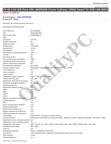 Informacje o produkcie Utworzono 02-03-2017 TV 48 LCD LED Sony KDL-48W585B (Tuner Cyfrowy 100Hz Smart TV USB LAN WiFi) Cena : 2.533 zł Nr katalogowy : KDL-48W585B Producent : Sony Gwarancja: 24 miesiące gwarancji fabrycznej Kod Produktu: RTVSONTLC0400 Kod Producenta: KDL-48W585B P/N:: 4905524967951 Numer części EAN:: 4905524967951 48" Proporcje ekranu: 16:9 Rozdzielczość: 1920x1080 Standard HD: Full HD Kąt oglądania: 178° Odświeżanie w trybie optymalizacji: 100Hz Tryb 3D: Nie Konwersja 2D-3D: Nie Moc wyjściowa (bez subwoofera): 2x8W Ilość głosników (bez subwoofera): 2szt. Głośnik niskotonowy (subwoofer): Nie yP LCD LED Długość przekątnej: ua lit Typ panelu: C Opis: Moc wyjściowa subwoofera: Nie dotyczy Funkcje i systemy audio: Dolby Digital , Dolby Digital Plus , Dolby Digital Pulse , NICAM Tuner satelitarny: Tak Tuner Analogowy: Tuner Cyfrowy: Tak Tak Obsługiwane systemy odbioru: DVB-C , DVB-S , DVB-S2 , DVB-T Moduły komunikacyjne: LAN , WiFi Wewnętrzny dysk twardy lub pamięć: Nie Pojemność wewnętrznej pamięci: Nie dotyczy Wbudowana kamera: Nie Wbudowany odtwarzacz DVD: Nie HDMI: 4szt. USB: 2szt. RJ-45: Q SCART: 1szt. 1szt. Wyjście słuchawkowe (mini-jack): 1szt. Cyfrowe optyczne: 1szt. MHL: 1szt. Złącze komponentowe (Pr/Pb/Y): 1szt. Złącze kompozytowe: 1szt. DVB Common Interface (CI): 1szt. Wejście antenowe RF (naziemne): 1szt. Wejście antenowe RF (satelitarne): 1szt. Technologie: X-Reality PRO , Advanced Contrast Enhhancer Funkcje użytkowe: Elektroniczny przewodnik po programach (EPG) , Wyłacznik czasowy , Blokada rodzicielska , WiFi Direct , DLNA Nagrywanie na zew. nośnikach pamięci: Tak Odtwarzanie z zew. nośników pamięci: Tak Obsługiwane pliki obrazu: 3GPP , AVCHD , AVI , MKV , MPEG2 , Motion JPEG , MOV , MP4 , MPEG , MPEG4, WMV , Xvid , JPEG Obsługiwane pliki audio: MP3 , WMA Smart TV: Tak Obsługiwane aplikacje: Skype , Przeglądarka internetowa Funkcje Eko: Tryb energooszczędny , Wyłączenie podświetlania podczas słuchania muzyki Kolor obudowy: Czarny Klasa energetyczna: A++ Wygenerowano w programie www.oscGold.com 45W Roczne zużycie energii: 66kWh/rok Pobór mocy w trybie czuwania: 0,5W Min. napięcie zasilania: 220V Maks. napięcie zasilania: 230V Waga z podstawą: 10,2kg Wymiary opakowania (Szer/Wys/Gł): 1385x735x135mm Wymiary z podstawą (Szer/Wys/Gł): 1086x674x196mm Wymiary bez podstawy (Szer/Wys/Gł): 1086x646x90mm Pilot: Tak Instrukcja obsługi: Tak Język instrukcji obsługi: polski Karta gwarancyjna: Tak Kraje objęte gwarancją: Polska Okres gwarancji: 24mies. W komplecie: Uchwyt ścienny , Przewód MHL Zgodność z normami: Odbiornik cyfrowy jest zgodny z wymaganiami określonymi w przepisach dotyczących wymagań technicznych i eksploatacyjnych dla urządzeń konsumenckich służących do odbioru cyfrowych naziemnych transmisji telewizyjnych w tym na terytorium RP. Strona www produktu: http://www.sony.pl/electronic... Waga z opakowaniem: 13kg Q ua lit yP C Średni pobór mocy w czasie pracy: