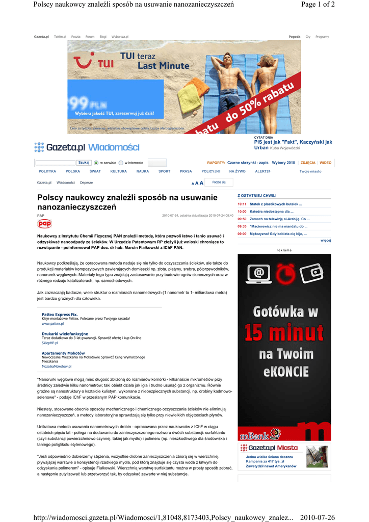 Polscy naukowcy znaleźli sposób na usuwanie nanozanieczyszczeń Gazeta.pl Tokfm.pl Poczta Forum Blogi Page 1 of 2 Wyborcza.pl Pogoda Gry Programy CYTAT DNIA PiS jest jak "Fakt", Kaczyński jak Urban Kuba Wojewódzki Szukaj POLITYKA Gazeta.pl POLSKA Wiadomości w serwisie ŚWIAT RAPORTY: Czarne skrzynki - zapis w internecie KULTURA NAUKA Depesze SPORT PRASA A POLICYJNI AA NA ŻYWO ZDJĘCIA WIDEO Twoje miasto Podziel się Polscy naukowcy znaleźli sposób na usuwanie nanozanieczyszczeń PAP Wybory 2010 ALERT24 2010-07-24, ostatnia aktualizacja 2010-07-24 08:40 Naukowcy z Instytutu Chemii Fizycznej PAN znaleźli metodę, która pozwoli łatwo i tanio usuwać i odzyskiwać nanoodpady ze ścieków. W Urzędzie Patentowym RP złożyli już wnioski chroniące to rozwiązanie - poinformował PAP doc. dr hab. Marcin Fiałkowski z IChF PAN. Z OSTATNIEJ CHWILI 10:11 Statek z plastikowych butelek ... 10:00 Katedra niedostępna dla ... 09:50 Zamach na telewizję al-Arabiję. Co ... 09:35 "Macierewicz nie ma mandatu do ... 09:00 Mężczyzno! Gdy kobieta cię bije, ... więcej reklama Naukowcy podkreślają, że opracowana metoda nadaje się nie tylko do oczyszczania ścieków, ale także do produkcji materiałów kompozytowych zawierających domieszki np. złota, platyny, srebra, półprzewodników, nanorurek węglowych. Materiały tego typu znajdują zastosowanie przy budowie ogniw słonecznych oraz w różnego rodzaju katalizatorach, np. samochodowych. Jak zaznaczają badacze, wiele struktur o rozmiarach nanometrowych (1 nanometr to 1- miliardowa metra) jest bardzo groźnych dla człowieka. Pattex Express Fix. Kleje montażowe Pattex. Polecane przez Twojego sąsiada! www.pattex.pl Drukarki wielofunkcyjne Teraz dodatkowo do 3 lat gwarancji. Sprawdź ofertę i kup On-line SklepHP.pl Apartamenty Mokotów Nowoczesne Mieszkania na Mokotowie Sprawdź Cenę Wymarzonego Mieszkania MozaikaMokotow.pl "Nanorurki węglowe mogą mieć długość zbliżoną do rozmiarów komórki - kilkanaście mikrometrów przy średnicy zaledwie kilku nanometrów; taki obiekt działa jak igła i trudno usunąć go z organizmu. Równie groźne są nanostruktury o kształcie kulistym, wykonane z niebezpiecznych substancji, np. drobiny kadmowoselenowe" - podaje IChF w przesłanym PAP komunikacie. Niestety, stosowane obecnie sposoby mechanicznego i chemicznego oczyszczania ścieków nie eliminują nanozanieczyszczeń, a metody laboratoryjne sprawdzają się tylko przy niewielkich objętościach płynów. Unikatowa metoda usuwania nanometrowych drobin - opracowana przez naukowców z IChF w ciągu ostatnich pięciu lat - polega na dodawaniu do zanieczyszczonego roztworu dwóch substancji: surfaktantu (czyli substancji powierzchniowo czynnej, takiej jak mydło) i polimeru (np. nieszkodliwego dla środowiska i taniego poliglikolu etylenowego). "Jeśli odpowiednio dobierzemy stężenia, wszystkie drobne zanieczyszczenia zbiorą się w wierzchniej, pływającej warstwie o konsystencji rzadkiego mydła, pod którą znajduje się czysta woda z łatwym do odzyskania polimerem" - opisuje Fiałkowski. Wierzchnią warstwę surfaktantu można w prosty sposób zebrać, a następnie zutylizować lub przetworzyć tak, by odzyskać zawarte w niej substancje. Jedna wielka ściana deszczu Kampania za 417 tys. zł Zawstydził nawet Amerykanów http://wiadomosci.gazeta.pl/Wiadomosci/1,81048,8173403,Polscy_naukowcy_znalez... 2010-07-26 Polscy naukowcy znaleźli sposób na usuwanie nanozanieczyszczeń Mechanizm fizyczny odpowiedzialny za oddzielenie substancji w roztworze jest związany z różnicą rozmiarów geometrycznych drobin surfaktantu i polimeru. Przy zastosowaniach na skalę przemysłową istotne znaczenie ma fakt, że po zakończeniu procesu polimer pozostaje w wodzie, skąd można go niemal w całości odzyskać. Jedyną zużywaną substancją jest surfaktant, czyli mydło, w którym zostają zamknięte nanozanieczyszczenia. Page 2 of 2 NAJCZĘŚCIEJ CZYTANE Prezydent Suwałk zmarł na wakacjach we ... Świadkowie: Panika wybuchła w momencie ... 3. Zapis rozmów z kokpitu Tu-154 niemal ... 4. Tajne informacje o operacjach w ... 5. Najlepsze zdjęcia tygodnia więcej 1. 2. Jak zapewnia Instytut, 11-miesięczne testy nie wykazały żadnych zmian w stabilności fizycznej i chemicznej zebranego surfaktantu, co oznacza, że zawarte w nim drobiny są skutecznie odizolowane od środowiska. Więcej szczegółów na temat nowej metody w Serwisie Naukowym PAP.(PAP) Źródło: PAP REKLAMA Nie wiedział gdzie autostrada, jechał po torach. Wjechał pod pociąg Newsy z dostawą na Facebooka | Masz newsa? Wyślij go na Alert24 Policyjni.pl Ocena: Wydrukuj Potrącił żonę samochodem. Przeżyła, więc ją zadźgał 0 głosów Dodaj swój komentarz: Login: Hasło: Logowanie: Zapamiętaj OFERTY Musisz się zalogować, by dodać komentarz. Jeśli nie posiadasz konta zarejestruj się. Wakacyjna wyprzedaż Last Minute już od 940 PLN! Komentarz: sprawdź Kontynuacja bestselleru ?Jedz, módl się, kochaj? sprawdź opublikuj LUIZ LORENZI 1004 CENA: 109.0 zł sprawdź Historia 1. Dzieje starożytne. Część 1 CENA: 15.58 zł O TYM DZISIAJ PISZEMY: Wojewódzki: PiS jest jak "Fakt" Kto z PiS nie chce pracować w zespole Macierewicza? Gigantyczna kara dla Ferrari Dowcip studentów: całe biuro wykładowcy pokryli... Policyjni: TOKFM.PL o politykach Newsy ze świata: Polecamy serwisy wypadki Donald Tusk USA Tokfm.pl policja Andrzej Olechowski Chiny Deser.pl kradzież Bronisław Komorowski Rosja Pogoda zabójstwo Radek Sikorski Niemcy Zoom24.pl śmierć Jarosław Kaczyński Francja Alert24.pl Wielka Brytania Sport.pl sprawdź +dodaj swoją reklamę ZOBACZ TAKŻE: narkotyki Moto.pl Na skróty: Gazeta.pl Polecamy: Miasta Wiadomości Wpadki Copyright © Agora SA O nas Policja Sport.pl Biznes Program TV Staże u nas Reklama Wyborcza.pl Pogoda Tematy Prywatność Praca Wideo Wybory 2010 Wszystkie artykuły Licencje Newsletter Facebook RSS Poleć stronę Widgety Zgłoś