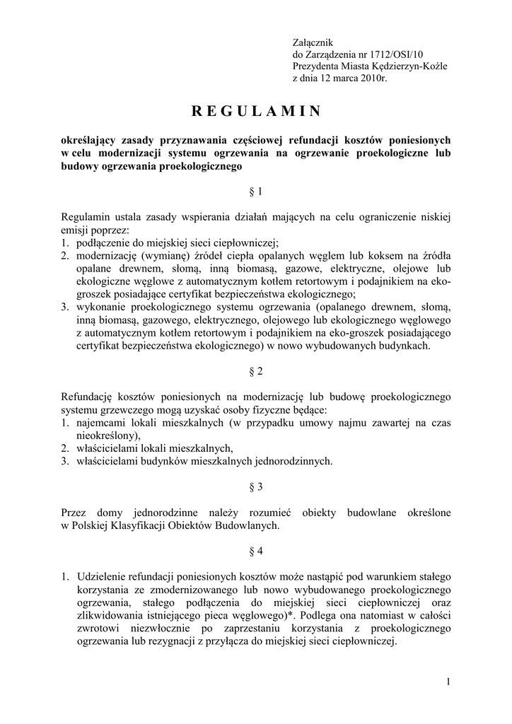 Załącznik do Zarządzenia nr 1712/OSI/10 Prezydenta Miasta Kędzierzyn-Koźle z dnia 12 marca 2010r. REGULAMIN określający zasady przyznawania częściowej refundacji kosztów poniesionych w celu modernizacji systemu ogrzewania na ogrzewanie proekologiczne lub budowy ogrzewania proekologicznego §1 Regulamin ustala zasady wspierania działań mających na celu ograniczenie niskiej emisji poprzez: 1. podłączenie do miejskiej sieci ciepłowniczej; 2. modernizację (wymianę) źródeł ciepła opalanych węglem lub koksem na źródła opalane drewnem, słomą, inną biomasą, gazowe, elektryczne, olejowe lub ekologiczne węglowe z automatycznym kotłem retortowym i podajnikiem na ekogroszek posiadające certyfikat bezpieczeństwa ekologicznego; 3. wykonanie proekologicznego systemu ogrzewania (opalanego drewnem, słomą, inną biomasą, gazowego, elektrycznego, olejowego lub ekologicznego węglowego z automatycznym kotłem retortowym i podajnikiem na eko-groszek posiadającego certyfikat bezpieczeństwa ekologicznego) w nowo wybudowanych budynkach. §2 Refundację kosztów poniesionych na modernizację lub budowę proekologicznego systemu grzewczego mogą uzyskać osoby fizyczne będące: 1. najemcami lokali mieszkalnych (w przypadku umowy najmu zawartej na czas nieokreślony), 2. właścicielami lokali mieszkalnych, 3. właścicielami budynków mieszkalnych jednorodzinnych. §3 Przez domy jednorodzinne należy rozumieć w Polskiej Klasyfikacji Obiektów Budowlanych. obiekty budowlane określone §4 1. Udzielenie refundacji poniesionych kosztów może nastąpić pod warunkiem stałego korzystania ze zmodernizowanego lub nowo wybudowanego proekologicznego ogrzewania, stałego podłączenia do miejskiej sieci ciepłowniczej oraz zlikwidowania istniejącego pieca węglowego)*. Podlega ona natomiast w całości zwrotowi niezwłocznie po zaprzestaniu korzystania z proekologicznego ogrzewania lub rezygnacji z przyłącza do miejskiej sieci ciepłowniczej. 1 2. Wymagania formalne: 1) Złożenie wniosku w Wydziale Ochrony Środowiska i Infrastruktury Urzędu Miasta K-Koźle wraz z załącznikami: a) dokument świadczący o prawie do zajmowania lokalu lub budynku (umowa najmu, odpis z księgi wieczystej wydany do trzech miesięcy wstecz od daty złożenia wniosku); b) protokół odbioru wykonanego systemu ogrzewania przez osobę ze stosownymi uprawnieniami; c) w przypadku instalacji ekologicznych pieców węglowych zaświadczenie o spełnieniu wymagań dotyczących efektywności energetycznej i dopuszczalnej emisji zanieczyszczeń wydane przez placówki naukowo-badawcze posiadające certyfikat akredytacji. Przedmiotowy certyfikat winien być przyznany przez Polskie Centrum Badań i Certyfikacji w Warszawie; d) imienne rachunki lub faktury wystawione na właściciela - najemcę za zakup kotła i grzejników; e) zgoda właściciela budynku na przeprowadzenie modernizacji wyrażona na piśmie (dot. najemców lokali mieszkalnych); f) protokół odbioru ogrzewania dokonany przez właściciela budynku (dot. najemców lokali mieszkalnych); g) oświadczenie, iż budowa ogrzewania/modernizacja ogrzewania ze starego, nieekologicznego węglowego na proekologiczne nastąpiła w ciągu 5 lat przed datą złożenia wniosku i do tego terminu w przedmiotowym lokalu lub budynku istniało tylko ogrzewanie węglowe i zostało zlikwidowane z chwilą modernizacji na proekologiczne.)* 2) Zawarcie umowy cywilnoprawnej z Gminą o częściową refundację kosztów poniesionych na modernizację, podłączenie do miejskiej sieci ciepłowniczej lub budowę proekologicznego systemu grzewczego wraz z zobowiązaniem się do stałego korzystania z proekologicznego ogrzewania, zlikwidowania starego pieca węglowego)*, poddania się ewentualnej kontroli oraz zobowiązaniem się do zwrotu przyznanej kwoty refundacji w przypadku: a) zaprzestania używania proekologicznego ogrzewania lub rezygnacji z przyłącza do miejskiej sieci ciepłowniczej z przyczyn zależnych od użytkownika; b) złożenia fałszywych dokumentów i oświadczeń stanowiących podstawę zwrotu kosztów. 3. Wniosek wraz z wyżej wymienionymi załącznikami kwalifikuje powołany przez Prezydenta Miasta Zespół z udziałem przedstawiciela Rady Miasta. 4. W skład zespołu wchodzą przedstawiciele: 1) Komisji Urbanistyki, Architektury i Środowiska Naturalnego Rady Miasta Kędzierzyn-Koźle; 2) Wydziału Ochrony Środowiska i Infrastruktury Urzędu Miasta Kędzierzyn-Koźle; 3) Wydziału Inwestycji i Remontów Urzędu Miasta Kędzierzyn-Koźle; Pracami Zespołu kieruje przewodniczący wybrany przez Prezydenta Miasta. 5. Na podstawie protokołu z przeprowadzonych czynności zespołu, zawierane są z zainteresowanymi umowy, w których zostaje określony: 1) sposób wykonanej modernizacji lub budowy proekologicznego ogrzewania, 2 2) 3) 4) 5) termin rozpoczęcia i zakończenia zadania, dotychczasowe zużycie paliwa )* kwota częściowego zwrotu kosztów, zastrzeżenie, że urządzenia grzewcze stanowią element stałego wyposażenia lokalu, 6) warunki otrzymania częściowej refundacji kosztów poniesionych na modernizację lub budowę proekologicznego systemu grzewczego. 6. Częściowa refundacja kosztów poniesionych na modernizację, budowę proekologicznego ogrzewania lub podłączenie do miejskiej sieci ciepłowniczej dotyczy jedynie kosztów nabycia kotła c.o. oraz grzejników i przyznawana jest w kwocie wynoszącej 45 % ceny brutto ich zakupu, jednak nie przekraczającej 3.000 zł. 7. Częściowa refundacja kosztów jest przyznawana pod warunkiem: 1) zmiany systemu ogrzewania lub budowy ekologicznego systemu grzewczego wykonanej w ciągu 5 lat przed datą złożenia wniosku, 2) posiadania i korzystania do czasu przeprowadzenia modernizacji tylko z ogrzewania węglowego, jego likwidacji i wykonania systemu ogrzewania na opalane drewnem/ słomą/ inną biomasą/ gazowego/ elektrycznego/ olejowego/ ekologicznego węglowego z automatycznym kotłem retortowym i