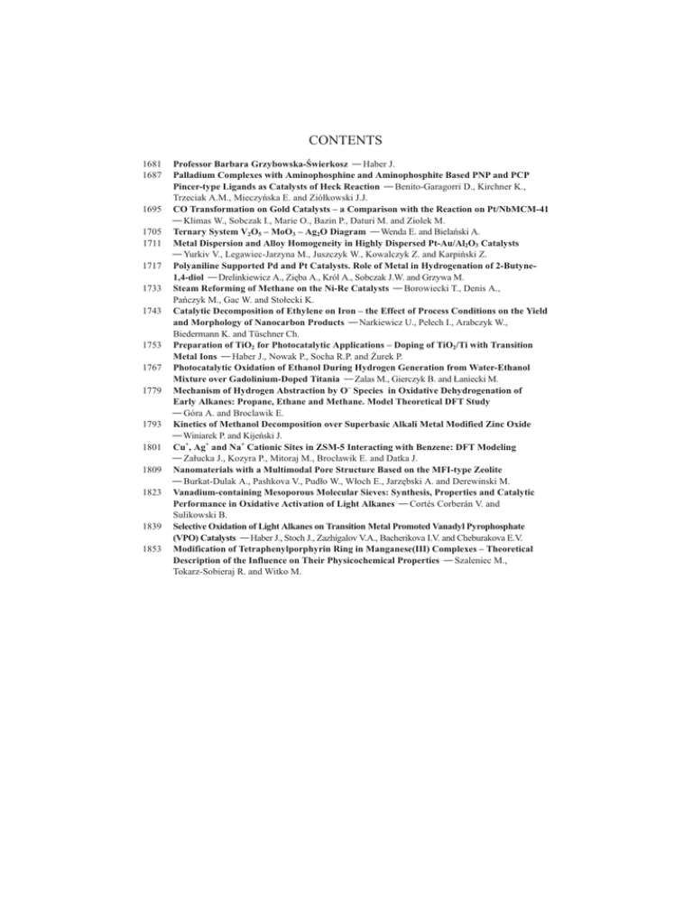 CONTENTS 1681 1687 1695 1705 1711 1717 1733 1743 1753 1767 1779 1793 1801 1809 1823 1839 1853 Professor Barbara Grzybowska-Œwierkosz ¾ Haber J. Palladium Complexes with Aminophosphine and Aminophosphite Based PNP and PCP Pincer-type Ligands as Catalysts of Heck Reaction ¾ Benito-Garagorri D., Kirchner K., Trzeciak A.M., Mieczyñska E. and Zió³kowski J.J. CO Transformation on Gold Catalysts – a Comparison with the Reaction on Pt/NbMCM-41 ¾ Klimas W., Sobczak I., Marie O., Bazin P., Daturi M. and Ziolek M. Ternary System V2O5 – MoO3 – Ag2O Diagram ¾ Wenda E. and Bielañski A. Metal Dispersion and Alloy Homogeneity in Highly Dispersed Pt-Au/Al2O3 Catalysts ¾ Yurkiv V., Legawiec-Jarzyna M., Juszczyk W., Kowalczyk Z. and Karpiñski Z. Polyaniline Supported Pd and Pt Catalysts. Role of Metal in Hydrogenation of 2-Butyne1,4-diol ¾ Drelinkiewicz A., Ziêba A., Król A., Sobczak J.W. and Grzywa M. Steam Reforming of Methane on the Ni-Re Catalysts ¾ Borowiecki T., Denis A., Pañczyk M., Gac W. and Sto³ecki K. Catalytic Decomposition of Ethylene on Iron – the Effect of Process Conditions on the Yield and Morphology of Nanocarbon Products ¾ Narkiewicz U., Pe³ech I., Arabczyk W., Biedermann K. and Tüschner Ch. Preparation of TiO2 for Photocatalytic Applications – Doping of TiO2/Ti with Transition Metal Ions ¾ Haber J., Nowak P., Socha R.P. and ¯urek P. Photocatalytic Oxidation of Ethanol During Hydrogen Generation from Water-Ethanol Mixture over Gadolinium-Doped Titania ¾ Zalas M., Gierczyk B. and £aniecki M. Mechanism of Hydrogen Abstraction by O– Species in Oxidative Dehydrogenation of Early Alkanes: Propane, Ethane and Methane. Model Theoretical DFT Study ¾ Góra A. and Broclawik E. Kinetics of Methanol Decomposition over Superbasic Alkali Metal Modified Zinc Oxide ¾ Winiarek P. and Kijeñski J. Cu+, Ag+ and Na+ Cationic Sites in ZSM-5 Interacting with Benzene: DFT Modeling ¾ Za³ucka J., Kozyra P., Mitoraj M., Broc³awik E. and Datka J. Nanomaterials with a Multimodal Pore Structure Based on the MFI-type Zeolite ¾ Burkat-Dulak A., Pashkova V., Pud³o W., W³och E., Jarzêbski A. and Derewinski M. Vanadium-containing Mesoporous Molecular Sieves: Synthesis, Properties and Catalytic Performance in Oxidative Activation of Light Alkanes ¾ Cortés Corberán V. and Sulikowski B. Selective Oxidation of Light Alkanes on Transition Metal Promoted Vanadyl Pyrophosphate (VPO) Catalysts ¾ Haber J., Stoch J., Zazhigalov V.A., Bacherikova I.V. and Cheburakova E.V. Modification of Tetraphenylporphyrin Ring in Manganese(III) Complexes – Theoretical Description of the Influence on Their Physicochemical Properties ¾ Szaleniec M., Tokarz-Sobieraj R. and Witko M.