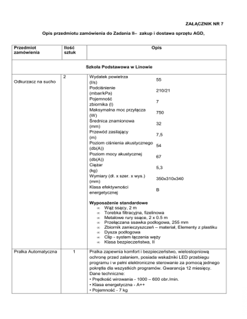 ZAŁĄCZNIK NR 7 Opis przedmiotu zamówienia do Zadania II– zakup i dostawa sprzętu AGD, Przedmiot zamówienia Ilość sztuk Opis Szkoła Podstawowa w Linowie 2 Wydatek powietrza (l/s) Podciśnienie (mbar/kPa) Pojemność zbiornika (l) Maksymalna moc przyłącza (W) Średnica znamionowa (mm) Przewód zasilający (m) Poziom ciśnienia akustycznego (db(A)) Poziom mocy akustycznej (db(A)) Ciężar (kg) Wymiary (dł. x szer. x wys.) (mm) Klasa efektywności energetycznej Odkurzacz na sucho 55 210/21 7 750 32 7,5 54 67 5,3 350x310x340 B Wyposażenie standardowe • Wąż ssący, 2 m • Torebka filtracyjna, fizelinowa • Metalowe rury ssące, 2 x 0.5 m • Przełączana ssawka podłogowa, 255 mm • Zbiornik zanieczyszczeń – materiał, Elementy z plastiku • Dysza podłogowa • Clip - system łączenia węży • Klasa bezpieczeństwa, II Pralka Automatyczna 1 Pralka zapewnia komfort i bezpieczeństwo, wielostopniową ochronę przed zalaniem, posiada wskaźniki LED przebiegu programu i w pełni elektroniczne sterowanie za pomocą jednego pokrętła dla wszystkich programów. Gwarancja 12 miesięcy. Dane techniczne: • Prędkość wirowania - 1000 – 600 obr./min. • Klasa energetyczna - A++ • Pojemność - 7 kg • Wielkość wsadu - 55 l • Głębokość z otwartymi drzwiczkami - 99 cm • Moc przyłączeniowa - 2300 W • Napięcie - 220–240 V • Średnica drzwi pralki - 30 cm • Wymiary - 84,7 × 60 × 59 cm Froterka Zmywarka gastronomiczna z wyparzaczem Piec elektryczny indukcja 1 Urządzenie jest odpowiednie do powierzchni drewnianych, laminowanych, kamiennych, a także z linoleum. Posiada 3 pady do polerowania i torebkę materiałową na worek filtracyjny. Ma funkcję odsysania kurzu powstałego podczas polerowania. Froterka jest standardowo wyposażona w papierowy worek filtracyjny oraz zestaw wysokiej jakości padów wełnianych, które można przechowywać na urządzeniu. Niska wysokość głowicy pozwala na froterowanie pod niskimi meblami. Ergonomiczny uchwyt daje możliwość pracy jedną lub obiema rękami. Uchwyt na kabel zapewnia łatwe przechowywanie kabla elektrycznego, a rolki transportowe - łatwy transport urządzenia. Dane techniczne: • Prędkość obrotowa - 1000 obr/min • Szerokość robocza - 290 mm • Torebka filtracyjna - 4 l • Moc - do 600 W • Kabel zasilający - 7 m • Ciężar - 7 kg • Wymiary - 38,5 x 34 x 11,5 cm Zmywarka gastronomiczna SILANOS wykonana ze stali nierdzewnej, przeznaczona do mycia talerzy, sztućców i szkła. Czas trwania cyklu 120 sekund. Zużycie wody to 2,5 l na cykl. W standardzie kosz do talerzy, kosz uniwersalny oraz kosz na sztućce. Zmywarka gastronomiczna posiada dozownik płynu myjącego oraz funkcję automatycznego wyparzania po zakończonym procesie mycia. napięcie 400 V. • wym: 56,5 x 62,5 x 82,5 cm 1 1 • Klasa energetyczna: A • Pojemność użyteczna piekarnika: 66 l Typ płyty: pełna indukcja • • • • • • • • o o o Typ piekarnika: Elektryczny Zużycie energii: 10200 W Grzałka górna: 900 W Grzałka dolna: 1100 W Opiekacz elektryczny: 2000 W Kolor: Inox Wymiary: Wysokość: 850 mm Szerokość: 500 mm Głębokość: 600 mm • o Palniki: Pole indukcyjne Booster 16 cm o o Pole indukcyjne Booster 16 cm Pole indukcyjne Booster 18 cm (1,2/1,4 kW) Pole indukcyjne Booster 21 cm (22,30 kW) -pojedyńcza osłona dźwiękowa o Młynek do rozdrabniania pożywienia 1 -górny koniec dzwonu młynka wykonany ze stali nierdzewnej -pierścień rozdrabniający wykonany ze stali nierdzewnej -tarcza rozdrabniająca wykonana ze stali nierdzewnej -obracające się 360 stopni kułaki wykonane ze stali nierdzewnej -samo smarujące się dolne i górne łożyska ślizgowe -zestaw montażowy typu Quick-LockTM gwarantuje szybką instalację -polerowany kołnierz mocujący -jednoczęściowa zatyczka do zlewu wykonana z plastiku -zabezpieczenie przed przeciążeniem -klucz do odblokowania młynka w zestawie jednofazowy moc - 0.50KM/230V , 370 W średnica wlotu 3,5 cala Lodówka 1 silnik - indukcyjny, Kolor: Biały Wysokość [cm]: 181 Sterowanie: Elektroniczne Gwarancja: 24 miesiące Pojemność użytkowa chłodziarki [l]:190 Pojemność użytkowa zamrażarki [l]:70 Szkoła Podstawowa w Lisnowie Zmywarka gastronomiczna z wyparzaczem 1 Zmywarka gastronomiczna SILANOS wykonana ze stali nierdzewnej, przeznaczona do mycia talerzy, sztućców i szkła. Czas trwania cyklu 120 sekund. Zużycie wody to 2,5 l na cykl. W standardzie kosz do talerzy, kosz uniwersalny oraz kosz na sztućce. Zmywarka gastronomiczna posiada dozownik płynu myjącego oraz funkcję automatycznego wyparzania po zakończonym procesie mycia. napięcie 400 V. • wym: 56,5 x 62,5 x 82,5 cm Odkurzacz 1 odkurzacz z wydajnością TwinFlo. Wyposażenie standardowe: • • • • wąż ssący 2,4 m ssawka 300 mm ssawka szczelinowa mała ssawka z włosiem Pralka 1 Pralka zapewnia komfort i bezpieczeństwo, wielostopniową ochronę przed zalaniem, posiada wskaźniki LED przebiegu programu i w pełni elektroniczne sterowanie za pomocą jednego pokrętła dla wszystkich programów. Gwarancja 12 miesięcy. Dane techniczne: • Prędkość wirowania - 1000 – 600 obr./min. • Klasa energetyczna - A++ • Pojemność - 7 kg • Wielkość wsadu - 55 l • Głębokość z otwartymi drzwiczkami - 99 cm • Moc przyłączeniowa - 2300 W • Napięcie - 220–240 V • Średnica drzwi pralki - 30 cm • Wymiary - 84,7 × 60 × 59 cm Froterka 1 Urządzenie jest odpowiednie do powierzchni drewnianych, laminowanych, kamiennych, a także z linoleum. Posiada 3 pady do polerowania i torebkę materiałową na worek filtracyjny. Ma funkcję odsysania kurzu powstałego podczas polerowania. Froterka jest standardowo wyposażona w papierowy worek filtracyjny oraz zestaw wysokiej jakości padów wełnianych, które można przechowywać na urządzeniu. Niska wysokość głowicy pozwala na froterowanie pod niskimi meblami. Ergonomiczny uchwyt daje możliwość pracy jed