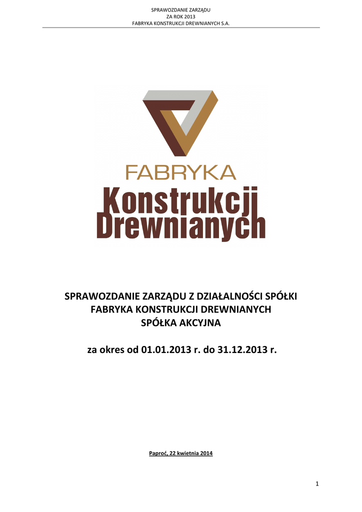 SPRAWOZDANIE ZARZĄDU ZA ROK 2013 FABRYKA KONSTRUKCJI DREWNIANYCH S.A. SPRAWOZDANIE ZARZĄDU Z DZIAŁALNOŚCI SPÓŁKI FABRYKA KONSTRUKCJI DREWNIANYCH SPÓŁKA AKCYJNA za okres od 01.01.2013 r. do 31.12.2013 r. Paproć, 22 kwietnia 2014 1 SPRAWOZDANIE ZARZĄDU ZA ROK 2013 FABRYKA KONSTRUKCJI DREWNIANYCH S.A. 1. Podstawowe informacje o Spółce……………………………………………………………... str. 3 2. Wyniki finansowe…………………………………………………………………………………… str. 9 3. Zdarzenia istotnie wpływające na działalność Spółki, jakie nastąpiły w roku……… obrotowym 2013…………………………………………………………………………..……….str.13 4. Zdarzenia istotnie wpływające na działalność Spółki, jakie nastąpiły po…………….. zakończenia roku obrotowego 2013, do dnia zatwierdzenia sprawozdania…….. finansowego…………………………………………………………………………………….…..…str.16 5. Przewidywany rozwój Spółki………....………………………………………………………..str.17 6. Ważniejsze osiągnięcia w dziedzinie badań i rozwoju…………………...........…….str.20 7. Opis podstawowych ryzyk związanych z działalnością Spółki…...………………str.20 8. Nabycie akcji własnych, a w szczególności cel ich nabycia, liczba i wartość………… nominalna, ze wskazaniem, jaką część kapitału zakładowego reprezentują, cenie nabycia oraz cenie sprzedaży tych udziałów w przypadku ich……………………………. zbycia……………………………………………….………………………………………..…………….str.27 9. Posiadane przez Spółkę oddziały (zakłady) wraz z opisem…………..……………str.27 10. Powiązania organizacyjne lub kapitałowe Spółki z innymi podmiotami……..str.27 11. Instrumenty finansowe……………………………………………………..……………………..str.27 12. Informacje o istotnych transakcjach zawartych z podmiotami powiązanymi…….... informacje o udzieleniu przez Spółkę poręczeń kredytu, pożyczki lub………………. gwarancji…………………………………………………………………………………………….…..st.27 13. Wskazanie istotnych postępowań toczących się przed sądem, organem…………… właściwym dla postępowania arbitrażowego lub organem administracji………… publicznej………………….……………………………………………………………….……….…..str.28 14. Stosowanie zasada ładu korporacyjnego …….………………….…………………..…….str.28 2 SPRAWOZDANIE ZARZĄDU ZA ROK 2013 FABRYKA KONSTRUKCJI DREWNIANYCH S.A. 1. Podstawowe informacje o Spółce 1.1 Nazwa i siedziba Spółki Firma: Siedziba: Adres: Fabryka Konstrukcji Drewnianych Spółka Akcyjna Nowy Tomyśl Telefon: +48 (61) 44 25 155 Faks: +48 (61) 44 25 156 Adres poczty elektronicznej: Strona internetowa: NIP: Regon: KRS: Sąd rejestrowy: [email protected] www.drewniane-konstrukcje.pl 788-196-50-71 301087258 0000418744 Sąd Rejonowy Poznań – Nowe Miasto i Wilda w Poznaniu, IX Wydział Gospodarczy KRS 11 maja 2012 r. Data rejestracji: Paproć 118 A, 64-300 Nowy Tomyśl 1.2 Podstawowy przedmiot działalności Przedmiotem działalności Spółki zgodnie z § 4 Statutu jest: realizacja projektów budowlanych związanych ze wznoszeniem budynków roboty budowlane związane ze wznoszeniem budynków mieszkalnych i niemieszkalnych roboty związane z budową rurociągów przesyłowych i sieci rozdzielczych roboty związane z budową linii telekomunikacyjnych i elektroenergetycznych roboty związane z budową dróg i autostrad roboty związane z budową mostów i tuneli roboty związane z budową pozostałych obiektów inżynierii lądowej i wodnej, gdzie indziej niesklasyfikowane 8) rozbiórka i burzenie obiektów budowlanych 9) przygotowanie terenu pod budowę 10) wykonywanie instalacji elektrycznych 11) wykonywanie instalacji wodno-kanalizacyjnych, cieplnych, gazowych i klimatyzacyjnych 12) wykonywanie pozostałych instalacji budowlanych 13) tynkowanie 14) zakładanie stolarki budowlanej 15) posadzkarstwo; tapetowanie i oblicowywanie ścian 16) malowanie i szklenie 17) wykonywanie pozostałych robót budowlanych wykończeniowych 18) wykonywanie konstrukcji i pokryć dachowych 19) pozostałe specjalistyczne roboty budowlane, gdzie indziej niesklasyfikowane 1) 2) 3) 4) 5) 6) 7) 3 SPRAWOZDANIE ZARZĄDU ZA ROK 2013 FABRYKA KONSTRUKCJI DREWNIANYCH S.A. 20) kupno i sprzedaż nieruchomości na własny rachunek 21) wynajem i zarządzanie nieruchomościami własnymi lub dzierżawionymi 22) pośrednictwo w obrocie nieruchomościami 23) zarządzanie nieruchomościami wykonywane na zlecenie 24) działalność w zakresie architektury 25) działalność w zakresie inżynierii i związane z nią doradztwo techniczne 26) konserwacja i naprawa pojazdów samochodowych, z wyłączeniem motocykli 27) sprzedaż detaliczna części i akcesoriów do pojazdów samochodowych, z wyłączeniem motocykli 28) transport drogowy towarów 29) magazynowanie i przechowywanie towarów 30) magazynowanie i przechowywanie pozostałych towarów 31) działalność usługowa wspomagająca transport lądowy 32) działalność śródlądowych agencji transportowych 33) pozostała działalność usługowa wspomagająca transport 34) wytwarzanie energii elektrycznej 35) przesyłanie energii elektrycznej 36) dystrybucja energii elektrycznej 37) handel energią elektryczną 38) destylowanie, rektyfikowanie i mieszanie alkoholi 39) zbieranie odpadów innych niż niebezpieczne 40) zbieranie odpadów niebezpiecznych 41) obróbka i usuwanie odpadów innych niż niebezpieczne 42) przetwarzanie i unieszkodliwianie odpadów niebezpiecznych 43) demontaż wyrobów zużyt