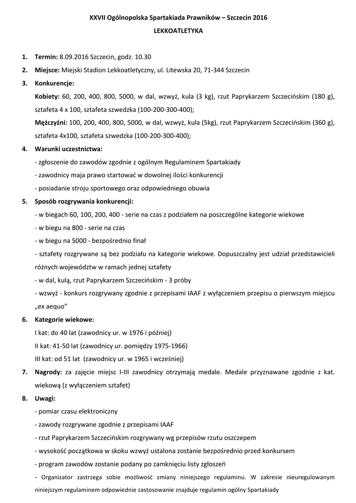XXVII Ogólnopolska Spartakiada Prawników – Szczecin 2016 LEKKOATLETYKA 1. Termin: 8.09.2016 Szczecin, godz. 10.30 2. Miejsce: Miejski Stadion Lekkoatletyczny, ul. Litewska 20, 71-‐344 Szczecin 3. Konkurencje: Kobiety: 60, 200, 400, 800, 5000, w dal, wzwyż, kula (3 kg), rzut Paprykarzem Szczecińskim (180 g), sztafeta 4 x 100, sztafeta szwedzka (100-‐200-‐300-‐400); Mężczyźni: 100, 200, 400, 800, 5000, w dal, wzwyż, kula (5kg), rzut Paprykarzem Szczecińskim (360 g), sztafeta 4x100, sztafeta szwedzka (100-‐200-‐300-‐400); 4. Warunki uczestnictwa: -‐ zgłoszenie do zawodów zgodnie z ogólnym Regulaminem Spartakiady -‐ zawodnicy maja prawo startować w dowolnej ilości konkurencji -‐ posiadanie stroju sportowego oraz odpowiedniego obuwia 5. Sposób rozgrywania konkurencji: -‐ w biegach 60, 100, 200, 400 -‐ serie na czas z podziałem na poszczególne kategorie wiekowe -‐ w biegu na 800 -‐ serie na czas -‐ w biegu na 5000 -‐ bezpośrednio finał -‐ sztafety rozgrywane są bez podziału na kategorie wiekowe. Dopuszczalny jest udział przedstawicieli różnych województw w ramach jednej sztafety -‐ w dal, kulą, rzut Paprykarzem Szczecińskim -‐ 3 próby -‐ wzwyż -‐ konkurs rozgrywany zgodnie z przepisami IAAF z wyłączeniem przepisu o pierwszym miejscu „ex aequo” 6. Kategorie wiekowe: I kat: do 40 lat (zawodnicy ur. w 1976 i później) II kat: 41-‐50 lat (zawodnicy ur. pomiędzy 1975-‐1966) III kat: od 51 lat (zawodnicy ur. w 1965 i wcześniej) 7. Nagrody: za zajęcie miejsc I-‐III zawodnicy otrzymają medale. Medale przyznawane zgodnie z kat. wiekową (z wyłączeniem sztafet) 8. Uwagi: -‐ pomiar czasu elektroniczny -‐ zawody rozgrywane zgodnie z przepisami IAAF -‐ rzut Paprykarzem Szczecińskim rozgrywany wg przepisów rzutu oszczepem -‐ wysokość początkowa w skoku wzwyż ustalona zostanie bezpośrednio przed konkursem -‐ program zawodów zostanie podany po zamknięciu listy zgłoszeń -‐ Organizator zastrzega sobie możliwość zmiany niniejszego regulaminu. W zakresie nieuregulowanym niniejszym regulaminem odpowiednie zastosowanie znajduje regulamin ogólny Spartakiady