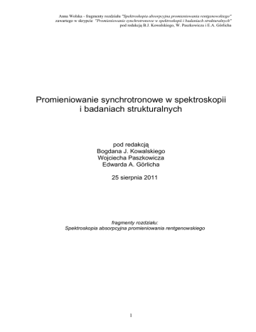Anna Wolska - fragmenty rozdziału "Spektroskopia absorpcyjna promieniowania rentgenowskiego" zawartego w skrypcie "Promieniowanie synchrotronowe w spektroskopii i badaniach strukturalnych" pod redakcją B.J. Kowalskiego, W. Paszkowicza i E.A. Görlicha Promieniowanie synchrotronowe w spektroskopii i badaniach strukturalnych pod redakcją Bogdana J. Kowalskiego Wojciecha Paszkowicza Edwarda A. Görlicha 25 sierpnia 2011 fragmenty rozdziału: Spektroskopia absorpcyjna promieniowania rentgenowskiego 1 Anna Wolska - fragmenty rozdziału "Spektroskopia absorpcyjna promieniowania rentgenowskiego" zawartego w skrypcie "Promieniowanie synchrotronowe w spektroskopii i badaniach strukturalnych" pod redakcją B.J. Kowalskiego, W. Paszkowicza i E.A. Görlicha 1.4 Bliska struktura krawędzi absorpcji –XANES Widmo bliskiej struktury krawędzi absorpcji powszechnie nazywanej XANES od angielskiej nazwy X-ray Absorption Near Edge Structure zawiera wiele informacji o układzie, takich jak liczba i typ atomów sąsiadujących z atomem absorbera, ich odległości oraz kąty między nimi. Jednakże wyodrębnienie tych informacji zazwyczaj nie jest łatwe. Metody analizy można podzielić na dwie ogólne grupy: 1) metody bazujące na eksperymencie, gdzie wykonuje się pomiary dla jednej krawędzi danego pierwiastka w różnych związkach, a następnie z porównania wyników wyciąga się wnioski dotyczące struktury i składu fazowego badanego związku. Można również zmieniać zawartość procentową domieszek w związku i badać ewolucję widma; 2) metody bazujące na teorii, gdzie zakładając strukturę badanego związku, oblicza się dla niego widmo absorpcji, a następnie porównuje z widmem eksperymentalnym. Oba podejścia mają wady. Porównywanie widm dla różnych związków daje informację o względnym stopniu utlenienia, czy też o zmianie struktury, ale nie mówi o konkretnym otoczeniu atomów. Natomiast obliczenia teoretyczne wymagają znajomości, a przynajmniej założenia struktury badanej próbki, a więc dokładnych położeń atomów, dostarczają za to szczegółowych wiadomości o otoczeniu atomu absorbującego, o hybrydyzacji wiązań, strukturze elektronowej itp. 1.4.1 Metody analizy widm XANES bazujące na eksperymencie W metodach bazujących na eksperymencie podstawą jest zmierzenie widm odpowiednich próbek wzorcowych. Najczęściej są to tlenki lub inne związki chemiczne pierwiastka, którego krawędź jest badana. Wykonując pomiary dla wzorców oraz próbek badanych można określić stopień utlenienia danego pierwiastka. Zmiana wartościowości, która wiąże się ze zmianą ładunku zlokalizowanego na danym atomie, jest wyraźnie widoczna np. dla krawędzi K - Mn. Wykres na rysunku 10 przedstawia położenie krawędzi dla Mn, MnO, Mn2O3 i MnO2. Można zauważyć, że w miarę jak wartościowość Mn rośnie, krawędź absorpcji przesuwa się w stronę wyższych energii. Co więcej, zostało pokazane, że w zakresie od 0 do +4 przesunięcie to jest liniowe [32], dzięki czemu można w prosty sposób określić wartościowość Mn dla danej próbki. Zdarza się, że z różnych powodów próbki wzorcowe nie mogą zostać zmierzone razem z próbkami badanych materiałów. Można wtedy skorzystać z danych literaturowych. Np. dla wanadianów wysokość i położenie tzw. pre-piku, czyli piku pojawiającego się przed krawędzią absorpcji, zależy od wartościowości atomów wanadu i symetrii ich otoczenia [33]. Pre-pik ten jest wynikiem przejść dipolowych ze stanów 1s do 3d. Przejścia te są zabronione dla struktur o wysokiej symetrii. Gdy symetria lokalnego otoczenia atomów wanadu jest obniżona, przejścia dipolowe 1s-3d stają się możliwe dzięki hybrydyzacji stanów 3d wanadu ze stanami 2p tlenu. [34, 35] Korzystając z tych informacji określono stopień utlenienia atomów wanadu w związku Li2Si2O5 domieszkowanym wanadem (rysunek 11), co w rezultacie pozwoliło na poparcie tezy, że atomy wanadu podstawiają się w pozycje atomów krzemu [36]. 2 Anna Wolska - fragmenty rozdziału "Spektroskopia absorpcyjna promieniowania rentgenowskiego" zawartego w skrypcie "Promieniowanie synchrotronowe w spektroskopii i badaniach strukturalnych" pod redakcją B.J. Kowalskiego, W. Paszkowicza i E.A. Görlicha Absorpcja (jedn. wzgl.) Mn MnO Mn2O3 MnO2 6530 6540 6550 6560 6570 Energia (eV) Rysunek 10. Krawędź K Mn zmierzona dla Mn metalicznego oraz kilku tlenków Mn o różnym stopniu utlenienia. Absorpcja (norm.) 1.0 K-V 0.5 0.0 5460 5470 5480 5490 5500 Energia (eV) Rysunek 11. Krawędź K absorpcji wanadu w związku Li2Si2O5 domieszkowanym wanadem. Wysokość oraz położenie pre-piku zależy od wartościowości atomów wanadu. 3 Anna Wolska - fragmenty rozdziału "Spektroskopia absorpcyjna promieniowania rentgenowskiego" zawartego w skrypcie "Promieniowanie synchrotronowe w spektroskopii i badaniach strukturalnych" pod redakcją B.J. Kowalskiego, W. Paszkowicza i E.A. Görlicha W przypadku, gdy dany materiał jest mieszaniną znanych i istniejących związków można wykorzystać fakt, że uzyskane widmo jest sumą widm poszczególnych składników i zastosować metodę Principal Component Analysis (PCA). Przykładowe wykorzystanie tej metody można znaleźć w pracy 42. 1.4.2 Metody analizy widm XANES bazujące na teorii W analizie teoretycznej można zastosować dwie metody opisu widm XANES: 1) obliczenia lokalnej gęstości stanów; 2) rozpraszanie wielokrotne w przestrzeni rzeczywistej (RSMS). 1.4.2.1 Gęstości stanów obliczane z pierwszych zasad Analiza widm XANES bazująca na obliczeniach struktury pasmowej wykorzystuje fakt, że widmo absorpcji promieniowania rentgenowskiego blisko krawędzi (15-20 eV) w zasadzie odzwierciedla jednoelektronową gęstość stanów powyżej poziomu Fermiego. Niewątpliwą zaletą tej metody jest możliwość uzyskania informacji o hybrydyzacji stanów. Jednakże, w odróżnieniu od obliczeń w przestrzeni rzeczywistej, analiza t