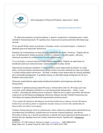 Izba Gospodarcza Właścicieli Punktów Aptecznych i Aptek Częstochowa 19stycznia 2017 r W całkowitej tajemnicy trwają konsultacje w sprawie wygaszenia i wyeliminowania z rynku techników farmaceutycznych. W zupełnej ciszy rozpoczyna się proces powolnej likwidacji tego zawodu . W ten sposób Polska stanie się jedynym w Europie a może i na świecie krajem , w którym w aptekach pracować będą tylko farmaceuci! Staniemy się ewenementem na skalę nie tylko europejską ale chyba i światową. Nigdzie tak nie jest, bo farmaceutów byłoby po prostu za mało b y obsadzić wszystkie apteki ; nikt przy zdrowych zmysłach nie uważa również by była taka potrzeba. To co się dzieje w naszym kraju jest wręcz nieprawdopodobne. Nigdzie nie zaprzestaje się kształcenia jeżeli jest zainteresowanie i zapotrzebowanie na dany zawód. Zaprzestanie kształcenia techników w bardzo krótkim czasie doprowadzi do braków na rynku pracy, zawód jest bardzo sfeminizowany, tysiące kobiet corocznie odchodzi by zając się rodziną, w tą lukę trafiają młodzi absolwenci . Ich brak w krótkim czasie doprowadzi do sytuacji podobnej jak w przypadku pielęgniarek. Z tą jednak różnicą, że zlikwidowanego kształcenia nie da się w krótkim czasie przywrócić . Głównym orędownikiem zaprzestania kształcenia techników jest korporacja zawodowa farmaceutów. Techników w aptekach pracuje ponad 40 tysięcy, farmaceutów tylko ok. 20 tysięcy jest więc oczywiste, jeżeli zabraknie techników to z pewnością pensje farmaceutów – mimo, iż już wysokie - poszybują do niebotycznych rozmiarów. Zapewne jest to jeden z powodów dla których rozpoczyna się likwidacja posiadającego olbrzymie tradycje zawodu Technik Farmaceutyczny. Likwidacja nie poparta jakimikolwiek argumentami merytorycznymi. Prócz apteki dla aptekarza likwidującej niechcianą konkurencję rynkową również likwidacja konkurencji zawodowej jakież to argumenty musiały stanąć po stronie Izby Aptekarskiej by doprowadzić do takich rozstrzygnięć . Technicy farmaceutyczni od lat są szykanowani, wbrew interesowi społecznemu uniemożliwia się im podnoszenie kwalifikacji, torpedowane jest tworzenie własnej korporacji zawodowej . Wszystko to dzieje się w sposób zawoalowany w jakichś dziwnych niejasnych okolicznościach, w których decyzje zapadają nawet bez wiedzy zainteresowanych. Zupełnie jak w bananowej republice. IGWPAiA 87-100 Toruń ul. Zacisze 6 e-mail: [email protected] KRS 000035676 Bank Pekao SA II odział Toruń 66 1240 1936 1111 0010 3345 7999 Jak wygląda rzeczywistość niech świadczy to, że nawet o projekcie tego rozporządzenia nikt z nas nie został poinformowany. Oczywiście wysłano informacje do szeregu podmiotów niestety zapominając o zainteresowanych. Tak , że o projekcie dowiedzieliśmy się poprzez zupełny przypadek. Co więcej 16 grudnia 2016 r. odbyło się spotkanie z przedstawicielami Ministerstwa Zdrowia w tej sprawie na którym przedstawicielka MZ stwierdziła , że ministerstwo nie ma jeszcze zdania w tej sprawie i nie może przedstawić żadnych argumentów przeciw kształceniu bo ich jeszcze nie zna a 22 grudnia 2016 r.! RCL przedstawił gotowy do podpisu projekt. Nie jesteśmy w stanie zerwać z tymi zakulisowymi zagrywkami . Dlatego zwracamy się do Państwa z prośbą o pomoc. Wyeliminowanie techników farmaceutycznych prócz olbrzymiej krzywdy dla tej grupy społecznej, z pewnością nie będzie korzystne dla całego społeczeństwa. Projekt rozporządzenia Ministra Edukacji Narodowej z dnia 22 grudnia 2016 w sprawie klasyfikacji zawodów szkolnictwa zawodowego dostępny jest na stronie RCL http://legislacja.rcl.gov.pl/projekt/12293407 Paweł Klimczak Prezes Zarządu Tel 695294600 IGWPAiA 87-100 Toruń ul. Zacisze 6 e-mail: [email protected] KRS 000035676 Bank Pekao SA II odział Toruń 66 1240 1936 1111 0010 3345 7999
