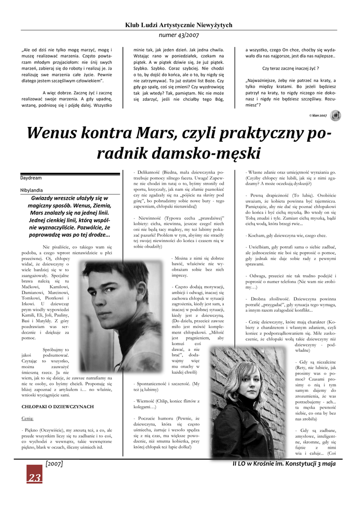 Klub Ludzi Artystycznie Niewyżytych numer 43/2007 „Ale od dziś nie tylko mogę marzyd, mogę i muszę realizowad marzenia. Często powtarzam młodym przyjaciołom: nie śnij swych marzeo, zabieraj się do roboty i realizuj je. Ja realizuję swe marzenia całe życie. Pewnie dlatego jestem szczęśliwym człowiekiem”. A więc dobrze. Zacznę żyd i zacznę realizowad swoje marzenia. A gdy upadnę, wstanę, podniosę się i pójdę dalej. Wszystko minie tak, jak jeden dzieo. Jak jedna chwila. Wstając rano w poniedziałek, czekam na piątek. A w piątek dziwie się, że już piątek. Szybko. Szybko. Coraz szybciej. Nie chodzi o to, by dojśd do kooca, ale o to, by nigdy się nie zatrzymywad. To już ostatni list Boże. Czy gdy go spalę, coś się zmieni? Czy wyzdrowieję tak jak wtedy? Tak, pamiętam. Nic nie może się zdarzyd, jeśli nie chciałby tego Bóg, a wszystko, czego On chce, chodby się wydawało dla nas najgorsze, jest dla nas najlepsze.. Czy teraz zacznę inaczej żyd ? „Najważniejsze, żeby nie patrzed na kraty, a tylko między kratami. Bo jeżeli będziesz patrzył na kraty, to nigdy niczego nie dokonasz i nigdy nie będziesz szczęśliwy. Rozumiesz”? © klan 2007 Wenus kontra Mars, czyli praktyczny poradnik damsko-męski Daydream Nibylandia Gwiazdy wreszcie ułożyły się w magiczny sposób. Wenus, Ziemia, Mars znalazły się na jednej linii. Jednej cienkiej linii, którą wspólnie wyznaczyliście. Pozwólcie, że poprowadzę was po tej drodze... Nie pisaliście, co takiego wam się podoba, a czego wprost nienawidzicie u płci przeciwnej. Oj, chłopcy widać, że dziewczyny o wiele bardziej się w to zaangażowały. Specjalne brawa należą się tu Maćkowi, Kamilowi, Damianowi, Marcinowi, Tomkowi, Piotrkowi i Irkowi. U dziewcząt prym wiodły wypowiedzi Kamili, Eli, Joli, Pauliny, Basi i Matyldy. Z góry pozdrawiam was serdecznie i dziękuje za pomoc. Spróbujmy to jakoś podsumować. Czytając to wszystko, można zauważyć śmieszną rzecz. Ja nie wiem, jak to się dzieje, że zawsze natrafiamy na nie te osoby, co byśmy chcieli. Proponuję się bliżej zapoznać z artykułem i… no właśnie, wnioski wyciągnijcie sami. CHŁOPAKI O DZIEWCZYNACH Cenią: - Piękno (Oczywiście), my zresztą też, a co, ale przede wszystkim liczy się tu zadbanie i to coś, co wychodzi z wewnątrz, takie wewnętrzne piękno, blask w oczach, śliczny uśmiech itd. [2007] 23 - Delikatność (Biedna, mała dziewczynka potrzebuje pomocy silnego faceta. Uwaga! Zapewne nie chodzi im tutaj o to, byśmy stroniły od sportu, krzyczały, jak nam się złamie paznokieć czy nie zgadzały się na „pójście na skróty pod górę”, bo pobrudzimy sobie nowe buty - tego zapewniam, chłopaki nienawidzą!) - Niewinność (Typowa cecha „prawdziwej” kobiety: cicha, niewinna, jeszcze czego! niech oni nie będą tacy mądrzy, my też lubimy pokazać pazurki! Problem w tym, abyśmy nie straciły tej swojej niewinności do końca i czasem nią w sobie obudziły) - Można z nimi się dobrze bawić, właściwie nie wyobrażam sobie bez nich imprezy. - Często dodają motywacji, ambicji i odwagi, inaczej się zachowa chłopak w sytuacji zagrożenia, kiedy jest sam, a inaczej w podobnej sytuacji, kiedy jest z dziewczyną. (Do dzieła, przecież zawsze miło jest mówić komplement chłopakowi. „Miłość jest pragnieniem, aby komuś coś dawać, a nie brać”, dodawajmy więc mu otuchy w każdej chwili) - Spontaniczność i szczerość. (My też ją lubimy) - Wierność (Chlip, koniec flirtów z kolegami…) - Poczucie humoru (Pewnie, że dziewczyna, która się często uśmiecha, żartuje i wesoło spędza się z nią czas, ma większe powodzenie, niż smutna kobietka, przy której chłopak też łapie dołka!) - Własne zdanie oraz umiejętność wyrażania go. (Czyżby chłopcy nie lubili, jak się z nimi zgadzamy? A może oczekują dyskusji?) - Pewną drapieżność (To lubię). Osobiście uważam, że kobieta powinna być tajemnicza. Pamiętajcie, aby nie dać się poznać chłopakowi do końca i być cichą myszką. Bo wtedy on się Tobą znudzi i tyle. Zamiast cichą myszką, bądź cichą wodą, która brzegi rwie... - Kocham, gdy dziewczyna wie, czego chce. - Uwielbiam, gdy potrafi sama o siebie zadbać, ale jednocześnie nie boi się poprosić o pomoc, gdy jednak nie daje sobie rady z pewnymi sprawami. - Odwaga, przecież nie tak trudno podejść i poprosić o numer telefonu (Nic wam nie zrobimy…) - Drobna złośliwość. Dziewczyna powinna potrafić „przygadać”, gdy sytuacja tego wymaga, a innym razem załagodzić konflikt... - Cenię dziewczyny, które mają charakter (Kobiety z charakterem i własnym zdaniem, czyli koniec z podporządkowaniem się. Miłe zaskoczenie, że chłopaki wolą takie dziewczyny niż dziewczyny - podwładne) - Gdy są niezależne (Rety, nie lubicie, jak prosimy was o pomoc? Czasami prosimy o nią i tym samym dajemy do zrozumienia, że was potrzebujemy - ach... ta męska pewność siebie, co ona by bez nas zrobiła) - Gdy są zadbane, zmysłowe, inteligentne, skromne, gdy się fajnie z nimi wia i całuje... (Coś II LO w Krośnie im. Konstytucji 3 maja