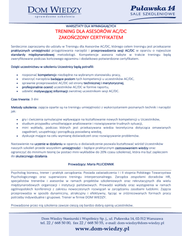 WARSZTATY DLA WYMAGAJĄCYCH TRENING DLA ASESORÓW AC/DC ZAKOŃCZONY CERTYFIKATEM Serdecznie zapraszamy do udziału w Treningu dla Asesorów AC/DC, którego celem treningu jest przekazanie praktycznych umiejętności przygotowania narzędzi i przeprowadzenia sesji AC/DC w oparciu o najwyższe standardy międzynarodowej metodologii. Kompetencje asesora nabyte w trakcie treningu będą zweryfikowane podczas końcowego egzaminu i dodatkowo potwierdzone certyfikatem. Dzięki uczestnictwu w szkoleniu Uczestnicy będą potrafili: rozpoznać kompetencje niezbędne na wybranym stanowisku pracy, stworzyć narzędzia badające poziom tych kompetencji u uczestników AC/DC, sprawnie przeprowadzić AC/DC od strony technicznej i merytorycznej, profesjonalnie ocenić uczestników AC/DC w formie raportu, udzielić motywującej informacji zwrotnej uczestnikom sesji AC/DC. Czas trwania: 3 dni Metody szkolenia: zajęcia oparte są na treningu umiejętności z wykorzystaniem poznanych technik i narzędzi jak: gry i ćwiczenia symulacyjne wpływające na kształtowanie nowych kompetencji u Uczestników, studium przypadku umożliwiające analizowanie i rozwiązywanie trudnych sytuacji, mini wykłady, podczas których jest przekazywana wiedza teoretyczna dotycząca omawianych zagadnień; uzupełniają i porządkują posiadaną wiedzę, dyskusje mające na celu wymianę doświadczeń oraz rozwiązywanie problemów. Nastawienie na uczenie w działaniu w oparciu o doświadczenie pozwala kształtować wśród Uczestników naszych szkoleń przede wszystkim umiejętności – będące praktycznym zastosowaniem wiedzy oraz ograniczyć do minimum teorię (w postaci mini-wykładów do 20% czasu szkolenia), która ma być zapleczem do skutecznego działania. Prowadzący: Maria PŁUCIENNIK Psycholog biznesu, trener i praktyk zarządzania. Posiada zaświadczenia I i II stopnia Polskiego Towarzystwa Psychologicznego oraz superwizora treningu interpersonalnego. Zarządza zespołami doradców HR, specjalistów trenerów i asesorów w ramach projektów szkoleniowych oraz rekrutacyjnych dla wielu międzynarodowych organizacji i instytucji państwowych. Prowadzi wykłady oraz wystąpienia w ramach ogólnopolskich konferencji z zakresu nowoczesnych rozwiązań w zarządzaniu zasobami ludzkimi. Zajęcia przeprowadza w sposób dynamiczny, atrakcyjny i efektywny, łącząc w zróżnicowanych formach pracy potrzeby indywidualne i grupowe. Trener w firmie DOM WIEDZY. Prowadzone przez nią szkolenia zawsze cieszą się bardzo dobrą opinią uczestników. W programie: 1. Opracowanie narzędzi do przeprowadzenia sesji AC/DC. Wykorzystanie profilu kompetencyjnego i opisu stanowiska w budowaniu AC/DC. Dobór rodzaju symulacji do badanych kompetencji – tworzenie macierzy. Metody samodzielnego konstruowania symulacji. Opracowanie arkuszy obserwacyjnych. Praktyczne tworzenie skal ocen. 2. Zaplanowanie i organizacja sesji AC/DC. Przygotowanie informacyjne otoczenia organizacyjnego i uczestników projektu. Wybór kandydatów i asesorów. Określenie lokalizacji i czasu trwania ośrodka. Harmonogram i organizacja techniczna sesji. 3. Przeprowadzanie AC/DC. Rzetelność i obiektywizm badania. Wprowadzanie uczestników do ćwiczeń. Zasady zachowania asesora w trakcie sesji AC/DC. Metody psychologicznej obserwacji i analizy zachowań. 4. Zakończenie ośrodka oceny i rozwoju. Opracowanie raportów końcowych. Przygotowanie profili kompetencyjnych uczestników. Zasady udzielania feedbacku dla uczestników. Cena: 1500 PLN + 23 % VAT Cena: 1500 PLN zw. z VAT dla opłacających szkolenie w 70% lub całości ze środków publicznych. Cena obejmuje: uczestnictwo w wykładach, materiały szkoleniowe, przerwy kawowe, lunch, certyfikat. Informacje dodatkowe pod nr telefonu: 22 668 50 00 Z POWYŻSZEJ TEMATYKI MOŻEMY ZREALIZOWAĆ SZKOLENIE ZAMKNIĘTE Poniżej przedstawiamy opinie uczestników szkoleń prowadzonych przez Panią Marię PŁUCIENNIK: Podobało mi się: „Narzędziowo a nie sama teoria.” „Sposób w jaki trenerka pracowała z grupą.” „Aktywne uczestnictwo całej grupy.” „Sposób prowadzenia szkolenia przez trenera.” „Bardzo dobry dobór miejsca i formy.” „Wyczerpujące omówienie tematu.” „Prowadzenie, sposób przekazywania wiedzy, ciekawe zadania.” „Warsztatowy sposób prowadzenia, zadania praktyczne.” „Ćwiczenia praktyczne w parach.” „Atmosfera szkolenia.” „Zaangażowanie prowadzącego, reagowanie na potrzeby grupy, chęć pomocy i udzielanie odpowiedzi na pytania uczestników.” „Organizacja.” „Ilość uczestników, zajęcia prowadzone w sposób angażujący uczestników.” „Otwarte szkolenie, wymiana doświadczeń, dyskusja.” „Tempo prowadzenia szkolenia, kontakt z uczestnikami, przykłady z życia przytaczane w trakcie przedstawiania teorii.” „Zaangażowanie trenera i motywowanie uczestników do pracy w grupach, myślenia, powtarzania materiału.” „Przygotowanie prowadzącego, sposób prowadzenia.” „Bardzo kompetentny i przygotowany na pytania grupy trener.” „Formuła szkolenia, aktywne uczestnictwo.” „Dynamika szkolenia, tematyka.” „Bardzo wysoki poziom organizacji.” „Szczegółowe omówienie materiałów, praktyczne przykłady zastosowań, wyjaśnienia.”