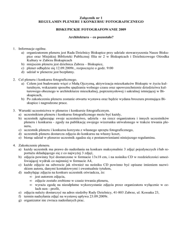 Załącznik nr 1 REGULAMIN PLENERU I KONKURSU FOTOGRAFICZNEGO BISKUPICKIE FOTOGRAFOWANIE 2009 Architektura – co pozostało? 1. Informacje ogólne. a) organizatorem pleneru jest Rada Dzielnicy Biskupice przy udziale stowarzyszenia Nasze Biskupice oraz Miejskiej Biblioteki Publicznej filia nr 2 w Biskupicach i Dzielnicowego Ośrodka Kultury w Zabrzu Biskupicach b) miejscem pleneru jest dzielnica Zabrza – Biskupice, c) plener odbędzie się 12.09.2009r., rozpoczęcie o godz. 9:00 d) udział w plenerze jest bezpłatny. 2. Cel pleneru i konkursu fotograficznego. a) Celem jest budowanie więzi z Małą Ojczyzną, aktywizacja mieszkańców Biskupic w Ŝyciu kulturalnym, wskazanie sposobu spędzania wolnego czasu oraz upowszechnienie dziedzictwa kulturowego obecnego w architekturze mieszkalnej, poprzemysłowej i sakralnej istniejącej w Biskupicach, b) Po zakończeniu pleneru zostanie otwarta wystawa oraz będzie wydana broszura promująca Biskupice i nagrodzone prace. 3. Warunki uczestnictwa w plenerze i konkursie fotograficznym. a) uczestnikiem pleneru i konkursu fotograficznego moŜe być kaŜdy, b) uczestnik zgłaszając swoje uczestnictwo, udziela - na rzecz organizatora i innych uczestników pleneru i konkursu - zgody na publikację swojego wizerunku utrwalonego w trakcie trwania pleneru, c) uczestnik pleneru i konkursu korzysta z własnego sprzętu fotograficznego, d) uczestnik pleneru dostarcza zdjęcia do konkursu na własny koszt, e) biorąc udział w plenerze uczestnik zgadza się z postanowieniami niniejszego regulaminu. 4. Zakończenie pleneru. a) kaŜdy uczestnik ma prawo do nadesłania na konkurs maksymalnie 3 zdjęć pojedynczych i/lub reportaŜu składającego się z co najwyŜej 3 zdjęć, b) zdjęcia powinny być dostarczone w formacie 13x18 cm, i na nośniku CD w rozdzielczości umoŜliwiającej wydruk co najmniej w formacie A4, c) kaŜde zdjęcie na odwrocie jak równieŜ na nośniku CD powinno być opisane imieniem nazwiskiem autora, danymi kontaktowymi i ewentualnie tytułem, d) nadsyłając zdjęcia na konkurs uczestnik oświadcza, Ŝe: • jest autorem zdjęcia, • zdjęcie zostało zrobione w czasie trwania pleneru, • wyraŜa zgodę na nieodpłatne wykorzystanie zdjęcia przez organizatora wyłącznie w celach non - profit, e) zdjęcia naleŜy dostarczyć na adres siedziby Rady Dzielnicy, 41-803 Zabrze, ul. Kossaka 23, f) termin nadsyłania zdjęć na wystawę upływa 23.09.2009r. g) organizator nie zwraca nadesłanych prac. 5. Konkurs. a) spośród prac nadesłanych na wystawę organizator wybierze: w kategorii wiekowej „szkoła podstawowa i gimnazjum” • najlepsze zdjęcie pojedyncze (I, II, III miejsce), • 5 wyróŜnień, w kategorii wiekowej „szkoła średnia i dorośli” • najlepsze zdjęcie pojedyncze (I, II, III miejsce), • najlepszy reportaŜ (I, II, III miejsce), • 5 wyróŜnień, b) nagrody: w kategorii wiekowej „szkoła podstawowa i gimnazjum” • I miejsce w kategorii zdjęcie pojedyncze – cyfrowa ramka na zdjęcia • II miejsce w kategorii zdjęcie pojedyncze – zestaw ksiąŜek o fotografii • III miejsce w kategorii zdjęcie pojedyncze - zestaw ksiąŜek o fotografii • wyróŜnienia – ksiąŜka o fotografii w kategorii wiekowej „szkoła średnia i dorośli” • I miejsce w kategorii zdjęcie pojedyncze – cyfrowy bank danych • II miejsce w kategorii zdjęcie pojedyncze - zestaw ksiąŜek o fotografii • III miejsce w kategorii zdjęcie pojedyncze - zestaw ksiąŜek o fotografii • I miejsce w kategorii reportaŜ – cyfrowy bank danych • II miejsce w kategorii reportaŜ - zestaw ksiąŜek o fotografii • III miejsce w kategorii reportaŜ - zestaw ksiąŜek o fotografii • wyróŜnienia - ksiąŜka o fotografii c) organizator zastrzega sobie inny podział nagród, 6. Wystawa i ogłoszenie wyników konkursu. a) ogłoszenie wyników konkursu i otwarcie wystawy będzie miało miejsce w MBP filia nr 2 w Biskupicach w dniu 03.10.2009r. o godz. 12:00. b) nagrodzone i wyróŜnione prace zostaną opublikowane w folderze promującym dzielnicę Biskupice 7. Postanowienia końcowe. a) członkowie organizatora mogą brać udział w plenerze poza konkursem, b) organizator nie bierze odpowiedzialności za nieszczęśliwe wypadki w czasie trwania pleneru, c) kaŜdy uczestnik pleneru zobowiązany jest zachowywać się w sposób nie zagraŜający bezpieczeństwu innych, d) organizator nie bierze odpowiedzialności za wszelki sprzęt zagubiony, zniszczony lub uszkodzony w czasie trwania pleneru, e) za szkody powstałe w trakcie pleneru odpowiedzialność ponoszą sprawcy, f) organizator zastrzega sobie moŜliwość wprowadzenia zmian w regulaminie, o czym wszyscy zainteresowani zostaną powiadomieni najpóźniej w dniu pleneru, g) organizator zastrzega sobie prawo do zmiany terminu oraz do odwołania pleneru.