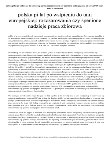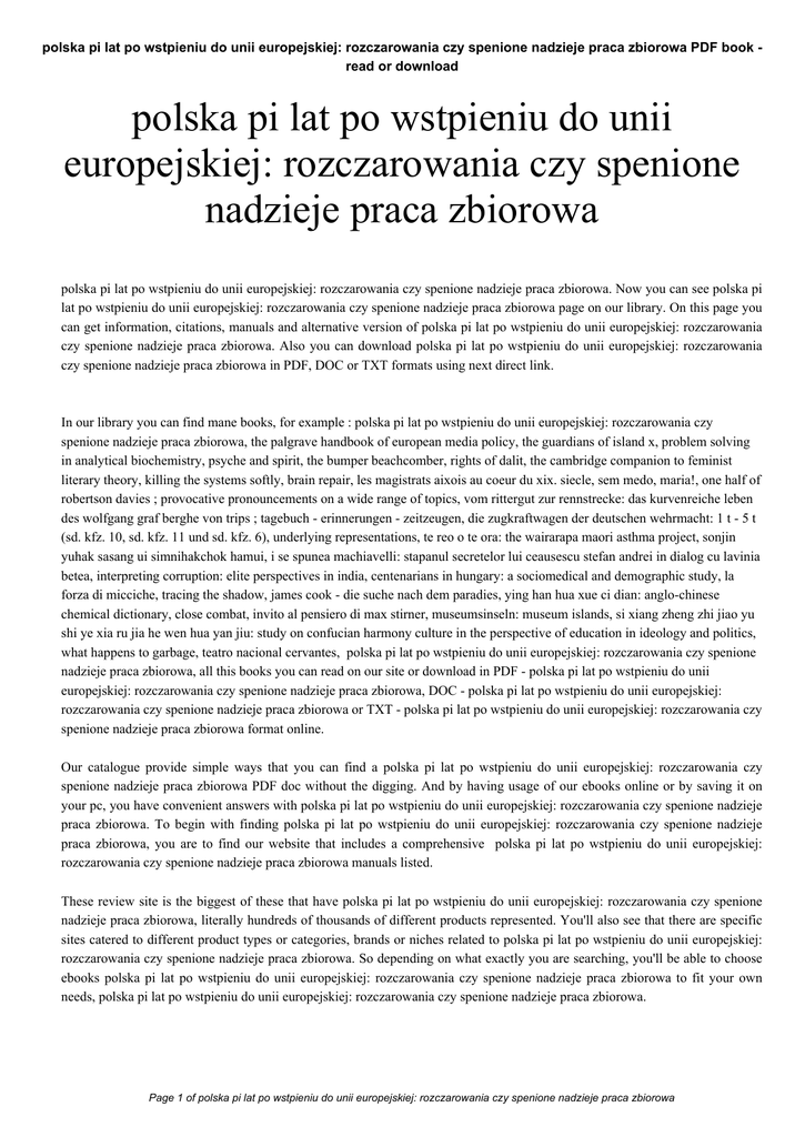 polska pi lat po wstpieniu do unii europejskiej: rozczarowania czy spenione nadzieje praca zbiorowa PDF book read or download polska pi lat po wstpieniu do unii europejskiej: rozczarowania czy spenione nadzieje praca zbiorowa polska pi lat po wstpieniu do unii europejskiej: rozczarowania czy spenione nadzieje praca zbiorowa. Now you can see polska pi lat po wstpieniu do unii europejskiej: rozczarowania czy spenione nadzieje praca zbiorowa page on our library. On this page you can get information, citations, manuals and alternative version of polska pi lat po wstpieniu do unii europejskiej: rozczarowania czy spenione nadzieje praca zbiorowa. Also you can download polska pi lat po wstpieniu do unii europejskiej: rozczarowania czy spenione nadzieje praca zbiorowa in PDF, DOC or TXT formats using next direct link. In our library you can find mane books, for example : polska pi lat po wstpieniu do unii europejskiej: rozczarowania czy spenione nadzieje praca zbiorowa, the palgrave handbook of european media policy, the guardians of island x, problem solving in analytical biochemistry, psyche and spirit, the bumper beachcomber, rights of dalit, the cambridge companion to feminist literary theory, killing the systems softly, brain repair, les magistrats aixois au coeur du xix. siecle, sem medo, maria!, one half of robertson davies ; provocative pronouncements on a wide range of topics, vom rittergut zur rennstrecke: das kurvenreiche leben des wolfgang graf berghe von trips ; tagebuch - erinnerungen - zeitzeugen, die zugkraftwagen der deutschen wehrmacht: 1 t - 5 t (sd. kfz. 10, sd. kfz. 11 und sd. kfz. 6), underlying representations, te reo o te ora: the wairarapa maori asthma project, sonjin yuhak sasang ui simnihakchok hamui, i se spunea machiavelli: stapanul secretelor lui ceausescu stefan andrei in dialog cu lavinia betea, interpreting corruption: elite perspectives in india, centenarians in hungary: a sociomedical and demographic study, la forza di micciche, tracing the shadow, james cook - die suche nach dem paradies, ying han hua xue ci dian: anglo-chinese chemical dictionary, close combat, invito al pensiero di max stirner, museumsinseln: museum islands, si xiang zheng zhi jiao yu shi ye xia ru jia he wen hua yan jiu: study on confucian harmony culture in the perspective of education in ideology and politics, what happens to garbage, teatro nacional cervantes, polska pi lat po wstpieniu do unii europejskiej: rozczarowania czy spenione nadzieje praca zbiorowa, all this books you can read on our site or download in PDF - polska pi lat po wstpieniu do unii europejskiej: rozczarowania czy spenione nadzieje praca zbiorowa, DOC - polska pi lat po wstpieniu do unii europejskiej: rozczarowania czy spenione nadzieje praca zbiorowa or TXT - polska pi lat po wstpieniu do unii europejskiej: rozczarowania czy spenione nadzieje praca zbiorowa format online. Our catalogue provide simple ways that you can find a polska pi lat po wstpieniu do unii europejskiej: rozczarowania czy spenione nadzieje praca zbiorowa PDF doc without the digging. And by having usage of our ebooks online or by saving it on your pc, you have convenient answers with polska pi lat po wstpieniu do unii europejskiej: rozczarowania czy spenione nadzieje praca zbiorowa. To begin with finding polska pi lat po wstpieniu do unii europejskiej: rozczarowania czy spenione nadzieje praca zbiorowa, you are to find our website that includes a comprehensive polska pi lat po wstpieniu do unii europejskiej: rozczarowania czy spenione nadzieje praca zbiorowa manuals listed. These review site is the biggest of these that have polska pi lat po wstpieniu do unii europejskiej: rozczarowania czy spenione nadzieje praca zbiorowa, literally hundreds of thousands of different products represented. You'll also see that there are specific sites catered to different product types or categories, brands or niches related to polska pi lat po wstpieniu do unii europejskiej: rozczarowania czy spenione nadzieje praca zbiorowa. So depending on what exactly you are searching, you'll be able to choose ebooks polska pi lat po wstpieniu do unii europejskiej: rozczarowania czy spenione nadzieje praca zbiorowa to fit your own needs, polska pi lat po wstpieniu do unii europejskiej: rozczarowania czy spenione nadzieje praca zbiorowa. Page 1 of polska pi lat po wstpieniu do unii europejskiej: rozczarowania czy spenione nadzieje praca zbiorowa