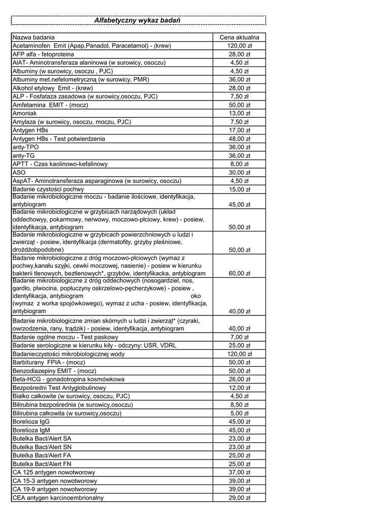 Alfabetyczny wykaz badań Nazwa badania Acetaminofen Emit (Apap,Panadol, Paracetamol) - (krew) AFP alfa - fetoproteina AlAT- Aminotransferaza alaninowa (w surowicy, osoczu) Albuminy (w surowicy, osoczu , PJC) Albuminy met.nefelometryczną (w surowicy, PMR) Alkohol etylowy Emit - (krew) ALP - Fosfataza zasadowa (w surowicy,osoczu, PJC) Amfetamina EMIT - (mocz) Amoniak Amylaza (w surowicy, osoczu, moczu, PJC) Antygen HBs Antygen HBs - Test potwierdzenia anty-TPO anty-TG APTT - Czas kaolinowo-kefalinowy ASO AspAT- Aminotransferaza asparaginowa (w surowicy, osoczu) Badanie czystości pochwy Badanie mikrobiologiczne moczu - badanie ilościowe, identyfikacja, antybiogram Badanie mikrobiologiczne w grzybicach narządowych (układ oddechowyy, pokarmowy, nerwowy, moczowo-płciowy, krew) - posiew, identyfikacja, antybiogram Badanie mikrobiologiczne w grzybicach powierzchniowych u ludzi i zwierząt - posiew, identyfikacja (dermatofity, grzyby pleśniowe, drożdżobpodobne) Badanie mikrobiologiczne z dróg moczowo-płciowych (wymaz z pochwy,kanału szyjki, cewki moczowej, nasienie) - posiew w kierunku bakterii tlenowych, beztlenowych*, grzybów, identyfikacka, antybiogram Badanie mikrobiologiczne z dróg oddechowych (nosogardziel, nos, gardło, plwocina, popłuczyny oskrzelowo-pęcherzykowe) - posiew , identyfikacja, antybiogram oko (wymaz z worka spojówkowego), wymaz z ucha - posiew, identyfikacja, antybiogram Badanie mikrobiologiczne zmian skórnych u ludzi i zwierząt* (czyraki, owrzodzenia, rany, trądzik) - posiew, identyfikacja, antybiogram Badanie ogólne moczu - Test paskowy Badanie serologiczne w kierunku kiły - odczyny: USR, VDRL Badanieczystości mikrobiologicznej wody Barbiturany FPIA - (mocz) Benzodiazepiny EMIT - (mocz) Beta-HCG - gonadotropina kosmówkowa Bezpośredni Test Antyglobulinowy Białko całkowite (w surowicy, osoczu, PJC) Bilirubina bezpośrednia (w surowicy,osoczu) Bilirubina całkowita (w surowicy,osoczu) Borelioza IgG Borelioza IgM Butelka Bact/Alert SA Butelka Bact/Alert SN Butelka Bact/Alert FA Butelka Bact/Alert FN CA 125 antygen nowotworowy CA 15-3 antygen nowotworowy CA 19-9 antygen nowotworowy CEA antygen karcinoembrionalny Cena aktualna 120,00 zł 28,00 zł 4,50 zł 4,50 zł 36,00 zł 28,00 zł 7,50 zł 50,00 zł 13,00 zł 7,50 zł 17,00 zł 48,00 zł 36,00 zł 36,00 zł 8,00 zł 30,00 zł 4,50 zł 15,00 zł 45,00 zł 50,00 zł 50,00 zł 60,00 zł 40,00 zł 40,00 zł 7,00 zł 25,00 zł 120,00 zł 50,00 zł 50,00 zł 26,00 zł 12,00 zł 4,50 zł 8,50 zł 5,00 zł 45,00 zł 45,00 zł 23,00 zł 23,00 zł 25,00 zł 25,00 zł 37,00 zł 39,00 zł 39,00 zł 29,00 zł Chlorki (w surowicy, osoczu, moczu, DZM) Cholesterol całkowity (w surowicy,osoczu) Cholesterol HDL (w surowicy,osoczu) 3,50 zł 5,50 zł 8,50 zł CK - Kinaza fosfokreatynowa (w surowicy, osoczu) 7,50 zł CK-MB - Kinaza fosfokeratynowa izoenzym -CK 16,00 zł Clostridium diffcile CRP - Białko C- reaktywne (w surowicy,osoczu) Cytologia narządu rodnego D-Dimery ilościowo Digoksyna FPIA - (krew) Ekstazy EMIT - (mocz) Elektroforeza wysokorozdzielcza (w surowicy, PMR) Estradiol Fenotiazyny (Diphergan, Fenactil, Thioridazin) - (mocz) Ferrytyna Fibrynogen Fosforany (w surowicy, osoczu, DZM, moczu) FSH FT3 wolna trójjodotyronina FT4 wolna tyroksyna GGTP - Gamma-glutamylotranspeptydaza (w surowicy,osoczu) Glukoza (w surowicy, osoczu, PMR, moczu, DZM, PJC) Grupa krwi Grupa krwi w trybie pilnym Grupa krwi z wpisem do dowodu i krew karty Hemoglobiny pochodne (COHb, MetHb, SHb) - (krew) Ilościowe oznaczenie białka w moczu Immunofiksacja (w surowicy, moczu, PMR) Immunoglobuliny klasy IgA w surowicy Immunoglobuliny klasy IgG w PMR Immunoglobuliny klasy IgG w surowicy Immunoglobuliny klasy IgM w surowicy Kał na krew utajoną Kał na obecność antygenu lamblii test Elisa Karbamazepina FPIA - (krew) Kokaina - (mocz) test kasetkowy Kreatynina (w surowicy, osoczu, moczu, DZM, dializacie) Krew karta Kwas moczowy (w surowicy, osoczu, moczu, DZM) Kwas walproinowy FPIA - (krew) LD - Dehydrogenaza mleczanowa (w surowicy, osoczu, PJC) LH Łańcuchy lekkie kappa w moczu Łańcuchy lekkie kappa w surowicy Łańcuchy lekkie lambda w moczu Łańcuchy lekkie lambda w surowicy Magnez (w surowicy, osoczu, moczu, DZM) Mielogram Mikroalbuminuria Mleczany (w osoczu) Mocznik (w surowicy, osoczu, moczu, DZM, dializacie) Morfologia krwi Morfologia krwi + retikulocyty Morfologia krwi + rozmaz Morfologia krwi + rozmaz + retikulocyty MRSA OB - Odczyn Biernackiego 65,00 zł 9,50 zł 34,00 zł 28,00 zł 35,00 zł 50,00 zł 90,00 zł 33,00 zł 14,00 zł 28,00 zł 8,50 zł 5,50 zł 27,00 zł 18,00 zł 18,00 zł 7,50 zł 5,50 zł 45,00 zł 80,00 zł 55,00 zł 20,00 zł 7,00 zł 102,00 zł 36,00 zł 36,00 zł 36,00 zł 36,00 zł 19,00 zł 56,00 zł 50,00 zł 28,00 zł 4,50 zł 10,00 zł 5,00 zł 50,00 zł 7,50 zł 24,00 zł 52,00 zł 52,00 zł 52,00 zł 52,00 zł 5,50 zł 25,00 zł 18,00 zł 10,00 zł 4,50 zł 8,50 zł 14,00 zł 9,50 zł 16,00 zł 30,00 zł 4,00 zł Ocena mikroskopowa osadu moczu Odczyn Waalera-Rosego Opiaty EMIT - ( mocz) Oznaczenie narotyków szybkim testem kasetowym (mocz) P. ciała p. jądrowe (IF) imunofluorescencja pośrednia Peptyd natriuretyczny BNP Płytki krwi poza wersenianem - licz. mikroskopowo Pobieranie krwi Posiew krwi i płynów ustrojowych* (płyn mózgowo-rdzeniowy, płyny wysiękowe) posiew w kierunku bakterii tlenowych, beztlenowych, identyfikacja, antybiogram Pośredni Test Antyglobulinowy (odczyn Coombsa) Potas (w surowicy, osoczu, moczu, DZM) Progesteron Prokalcytonina Prolaktyna Proteinogram białek (w surowicy, moczu) Próby czystościowe + Vat 23 % Przeciwciała anty wirus różyczki klasy IgG Przeciwciała anty wirus różyczki klasy IgM Przeciwciała anty-CMV IgG Przeciwciała anty-CMV IgM Przeciwciała anty-HBc total Przeciwciała anty-HBs (ilościowo) Przeciwciała anty-HCV (met. chemoluminescencji) Przeciwciała anty-toksoplazma IgG Przeciwciała anty-toksoplazma IgM Przeciwciała przeciw Helicobac