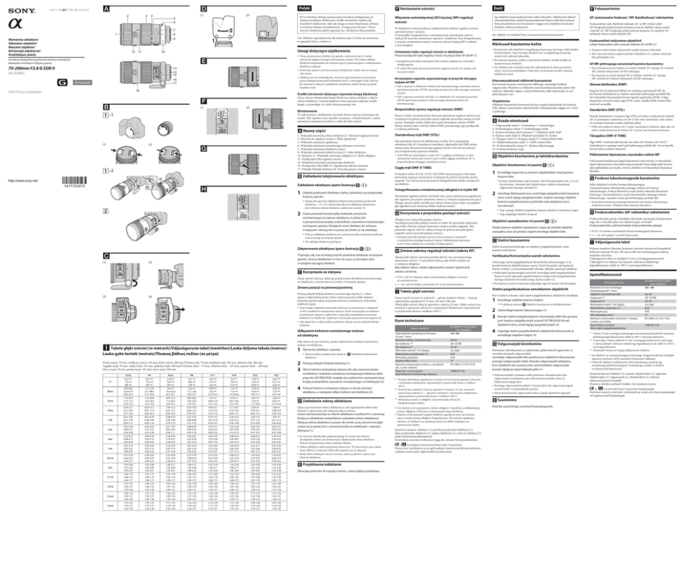 4-471-124-01(1) (PL-EE-LV-LT-EL) 2 3 (1) 4 (2) 5 6 7 8 9 1 Wymienny obiektyw/ Vahetatav objektiiv/ Maināmi objektīvi/ Keičiamieji objektyvai/ Εναλλάξιμος φακός 12 11 Polski Nastawianie ostrości Eesti Fokuseerimine W tej instrukcji obsługi zamieszczono instrukcje posługiwania się różnymi modelami obiektywów. Środki ostrożności wspólne dla wszystkich obiektywów, takie jak uwagi na temat eksploatacji, zebrano w osobnym arkuszu zatytułowanym „Uwagi przed użyciem”. Przed użyciem obiektywu należy zapoznać się z obydwoma dokumentami. Włączanie automatycznej (AF)/ręcznej (MF) regulacji ostrości Iga objektiivi kasutusjuhised leiate sellest juhendist. Objektiivide üldised ettevaatusabinõud, näiteks kasutusmärkused, leiate eraldi lehel jaotisest Ettevaatusabinõud enne kasutamist. Lugege enne objektiivi kasutamist kindlasti mõlemat dokumenti. AF (automaatse fookuse) / MF (käsifookuse) vahetamine Ten obiektyw zaprojektowano dla uchwytu typu A, który jest stosowany w aparatach Sony z rodziny . Uwagi dotyczące użytkowania 10 Instrukcja obsługi/Kasutusjuhend/Lietošanas instrukcijas/ Naudojimo instrukcijos/Οδηγίες χρήσης 70-200mm F2.8 G SSM II 13 14 15 SAL70200G2 16 17 A-mount Chcąc przymocować obiektyw do aparatu z uchwytem typu E, należy zastosować adapter mocujący (do kupienia osobno). Nie wolno zakładać obiektywu bezpośrednio do uchwytu typu E, ponieważ grozi to uszkodzeniem obiektywu i aparatu. Przenosząc aparat z przymocowanym obiektywem, należy mocno trzymać cały zestaw. Obiektyw nie jest wodoodporny, chociaż w jego konstrukcji zastosowano pewne zabezpieczenia przed wnikaniem kurzu i rozbryzgów wody. Jeśli ma być używany w deszczu i podobnych warunkach, należy chronić go przed kroplami wody. W obiektywie można przełączać między dwoma trybami regulacji ostrości: automatycznym i ręcznym. W przypadku fotografowania z automatycznym ustawieniem ostrości funkcja AF musi być ustawiona w aparacie i obiektywie. Przy fotografowaniu z ręcznym ustawieniem ostrości wystarczy ustawić funkcję MF w jednym z tych urządzeń. Ustawianie trybu regulacji ostrości w obiektywie Chcąc używać wbudowanej lampy błyskowej, należy pamiętać o zdjęciu osłony obiektywu. Czasami obiektyw może częściowo zasłaniać światło lampy, co powoduje, że u dołu obrazu powstaje cień. (1) (2) Winietowanie –1 W trakcie pracy z obiektywem narożniki ekranu stają się ciemniejsze niż środek. Aby zapobiec temu zjawisku (zwanemu „winietowaniem”), należy zmniejszyć ustawienie przysłony o jeden lub dwa stopnie. Nazwy części (1) (2) –2 W każdym trybie AF (AF-A/S/C) tryb DMF ustawia się przez obracanie pierścienia regulacji ostrości przy wciśniętym do połowy przycisku spustu migawki. Ten tryb jest przeznaczony do fotografowania szybko ruszających się obiektów. 2 Zdejmij przykrywki obiektywu (tylną i przednią) oraz przykrywkę korpusu aparatu. Istnieją dwa sposoby zakładania/zdejmowania przedniej przykrywki obiektywu — (1) i (2). Jeśli przykrywka jest zakładana/zdejmowana przy założonej osłonie obiektywu, należy użyć metody (2). Ustaw pomarańczową kropkę (wskaźnik ustawienia montażowego) na tubusie obiektywu w jednej linii z pomarańczową kropką (wskaźnikiem ustawienia montażowego) na korpusie aparatu. Następnie wsuń obiektyw do uchwytu w korpusie i obracaj nim w prawo do chwili, aż się zablokuje. Podczas zakładania obiektywu nie wciskaj przycisku zwalniania obiektywu umieszczonego na korpusie aparatu. Nie zakładaj obiektywu pod kątem. Zdejmowanie obiektywu (patrz ilustracja –). Trzymając cały czas wciśnięty przycisk zwalniania obiektywu na korpusie aparatu, obracaj obiektywem w lewo do czasu, aż poczujesz opór, a następnie wyciągnij obiektyw. (2) Korzystanie ze statywu Chcąc używać statywu, należy go przymocować do kołnierza montażowego na obiektywie, a nie do otworu na statyw w korpusie aparatu. Gdy ustawianie ostrości jest zablokowane w trybie AF-A (automatyka autofokusu) lub AF-S (pojedynczy autofokus), odpowiedni tryb DMF można ustawić przez obracanie pierścienia regulacji ostrości. Ten tryb jest zalecany przy fotografowaniu typowych obiektów. Zmiana pozycji na pionową/poziomą Poluzuj pokrętło blokady kołnierza montażowego statywu (1) i obróć aparat w odpowiednią stronę. Użycie statywu pozwala szybko zmieniać położenie aparatu między pozycjami pionową i poziomą przy zachowaniu stabilności ujęcia. (4) Szare kropki (wskaźniki ustawienia kołnierza) są rozmieszone w odstępach co 90° na kołnierzu montażowym statywu. Ustaw szarą kropkę na kołnierzu montażowym statywu w jednej linii z szarą linią (wskaźnikiem ustawienia kołnierza) na obiektywie. Zapewnia to precyzyjne pozycjonowanie aparatu (2). Gdy aparat jest w odpowiednim położeniu, dokręć mocno pokrętło blokady kołnierza. Odłączanie kołnierza montażowego statywu od obiektywu Tabela głębi ostrości (w metrach)/Väljasügavuste tabel (meetrites)/Lauka dziļuma tabula (metros)/ Lauko gylio lentelė (metrais)/Πίνακας βάθους πεδίου (σε μέτρα) 30 m 15 m 10 m 7 m 5 m 4 m 3 m 2,5 m 2 m 1,7 m 1,5 m 1,3 m 1,2 m Wymontuj obiektyw z aparatu. 2 3 Górny wiersz: 70 mm, środkowy wiersz: 105 mm, dolny wiersz: 200 mm/Ülemine rida: 70 mm, keskmine rida: 105 mm, alumine rida: 200 mm/ Augšējā rinda: 70 mm, vidējā rinda: 105 mm, apakšējā rinda: 200 mm/Viršutinė eilutė – 70 mm, vidurinė eilutė – 105 mm, apatinė eilutė – 200 mm/ Πάνω σειρά: 70 mm, μεσαία σειρά: 105 mm, κάτω σειρά: 200 mm Gdy statyw nie jest używany, można zdemontować kołnierz montażowy statywu od obiektywu. 1 F2.8 F4 F5.6 F8 F11 F16 F22 F32 55,6- 110- 406- 19,6-64,2 23,6-41,0 28,0-32,4 11,9-20,3 13,3-17,3 14,5-15,6 8,54-12,1 9,21-10,9 9,77-10,2 6,27-7,93 6,61-7,44 6,89-7,12 4,63-5,44 4,80-5,21 4,94-5,06 3,76-4,27 3,88-4,13 3,96-4,