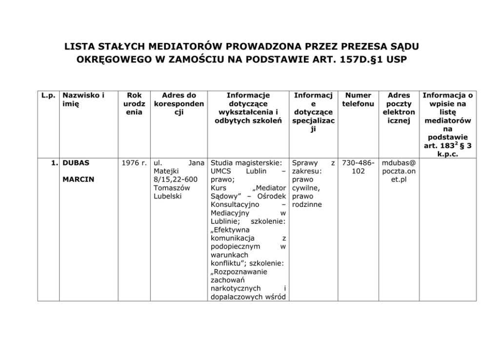 LISTA STAŁYCH MEDIATORÓW PROWADZONA PRZEZ PREZESA SĄDU OKRĘGOWEGO W ZAMOŚCIU NA PODSTAWIE ART. 157D.§1 USP L.p. Nazwisko i imię 1. DUBAS MARCIN Rok urodz enia Adres do koresponden cji 1976 r. ul. Jana Matejki 8/15,22-600 Tomaszów Lubelski Informacje dotyczące wykształcenia i odbytych szkoleń Studia magisterskie: UMCS Lublin – prawo; Kurs „Mediator Sądowy” – Ośrodek Konsultacyjno – Mediacyjny w Lublinie; szkolenie: „Efektywna komunikacja z podopiecznym w warunkach konfliktu”; szkolenie: „Rozpoznawanie zachowań narkotycznych i dopalaczowych wśród Informacj e dotyczące specjalizac ji Numer telefonu Adres poczty elektron icznej Sprawy zakresu: prawo cywilne, prawo rodzinne 730-486102 mdubas@ poczta.on et.pl z Informacja o wpisie na listę mediatorów na podstawie art. 1832 § 3 k.p.c. dozorowanych. Praca kuratora z osobą zagrożoną uzależnieniem” 2. GRYGIEL PIOTR Studia magisterskie KUL: Nauki o Rodzinie Kurs : Mediator Sądowy – Ośrodek Konsultacyjno – Mediacyjny w Lublinie, Szkolenia z zakresu funkcjonowania dziecka w warunkach placówki opiekuńczo – wychowawczej, szkolenia z zakresu sytuacji trudnych w obszarze pomocy dziecku i rodzinie Sprawy cywilne ze szczególny m uwzględnie niem spraw rodzinnych tel.: 660245-891 p.grygiel @wp.pl - 21, Studia magisterskie Uniwersytet Jagielloński: prawo, Radca prawny; Szkolenie Porozumienie Bez Sprawy z zakresu: prawa cywilnego i gospodarcz ego tel.: 696202-011 magklesz cz@gmail .com 1.Centrum Mediacji Gospodarczej przy Krajowej Radzie Radców 1985 r. ul. Głowackiego 4/47 22-300 Krasnystaw 3. KOSICKA LESZCZYŃSK A MAGDALENA 1976 r. ul. Reja 22-400 Zamość Prawnych; 2.Centrum Arbitrażu i Mediacji przy KUL Przemocy „Mediuję swoje życie”; „Intensywny Kurs Mediacji wg Porozumienia bez Przemocy” 4. KUPCZAK AGATA PAULINA 5. MATYKA BARBARA WIESŁAWA 1989 r. ul. Zamojska 84a/43 23-400 Biłgoraj 1979 r. ul. Piłsudskiego 111 22-523 Studia magisterskie Uniwersytet Rzeszowski Wydział Prawa i Administracji: prawo; Kurs „Mediator sądowy” Szkolenie: „Mediator sądowy” Konferencja: „Mediacja szansą na porozumienie” Szkolenie: „Propagowanie alternatywnych metod rozwiązywania sporów” Szkolenie” „Prawo pracy w praktyce” Sprawy z zakresu: prawa cywilnego, gospodarcz ego, prawa pracy, mediacje rodzinne Studia magisterskie: Sprawy UMCS Lublin – zakresu: administracja; KUL w prawo Lublinie – cywilne, podyplomowe tel:517763-401 kupczaka gata@wp .pl tel: 791397-014 z Tel.: 515-121056 Stowarzyszeni e „Mediatorzy Polscy” z siedzibą w Rzeszowie mediator zypolscy @gmail.c om matyka.b w@gmail. com Ośrodek Mediacji w Wyższej Szkole Horodło 6. MYSZURA PRZEMYSŁA W KONRAD 1978 r. Centrum Mediacji Przemysław Myszura 22-100 Chełm ul. G. Narutowicza 2a, III p. lok. nr 4 rachunkowość i finanse, UMSC w Lublinie – podyplomowe pedagogika, Politechnika Lubelska – podyplomowe zarządzanie i marketing, Politechnika Lubelska – MBA Ośrodek Mediacji w Wyższej Szkole Menadżerskiej w Warszawie – XIII Szkoła Mediacji – rozwiązywanie sporów na drodze mediacji, ze szczególnym uwzględnieniem sądowego postępowania mediacyjnego; prawo rodzinne, prawo gospodarcz e Wyższa Szkoła Biznesu w Radomiu: rachunkowośćlicencjat; KUL: zarządzenie i marketing –studia magisterskie; Kurs: „Mediator sądowy”; Samorządowy Mediacje: tel: 884karne, 113-119 cywilne, rodzinne, majątkowe i gospodarcz e Menadżerskiej w Warszawie kancelari a@media cjechelm. pl Wpis na listę stałych mediatorów Ośrodka Konsultacyjno -Mediacyjnego w Lublinie Ośrodek Doskonalenia Nauczycieli – Kurs Pedagogiczny dla Czynnych Zawodowo Nauczycieli dający uprawnienia pedagogiczne 7. PASIECZNY KAROL 1988 r. ul. Graniczna 135 22-400 Zamość 8. STARMACH AGNIESZKA 1973 r. ul. Żeromskiego 13/15 Studia magisterskie: Uniwersytet Kardynała Stefana Wyszyńskiego w Warszawie – prawo, Kursy: Mediacje i negocjacje prawnicze- Edukacja Prawnicza, Mediacje – szkolenie bazowe – Polskie Centrum Mediacji; Wymowa prawnicza – Edukacja Prawnicza Sprawy z zakresu: prawo cywilne, prawo rodzinne, prawo budowlane, prawo finansowe, prawo handlowe, prawo pracy, prawo gospodarcz e, prawo karne Studia magisterskie: Sprawy z UMCS Lublin – zakresu: prawo; prawo tel.: 505276-367 karol.pasi eczny@g mail.com tel.: 503109-213 starmach @o2.pl 22-400 Zamość 9. WIRSKA MAGDALENA Kurs „Mediator Sądowy” – Ośrodek Konsultacyjno – Mediacyjny; szkolenie z zakresu poradnictwa prawnego i rodzinnego – Stowarzyszenie „Jesteśmy z Tobą – Bądź z Nami” 1982 r. ul. Staszica 39 Studia magisterskie 22-400 UMCS: prawo Zamość Kurs : Mediator Sądowy – Ośrodek Konsultacyjno – Mediacyjny w Lublinie cywilne, prawo rodzinne, prawo gospodarcz e, prawo karne; Sprawy z zakresu: prawa karnego, cywilnego, administrac yjnego, rodzinnego, prawa pracy, gospodarcz ego, handlowego i budowlaneg o tel.: 695421-101 wirska.m agdalena @onet.eu -
