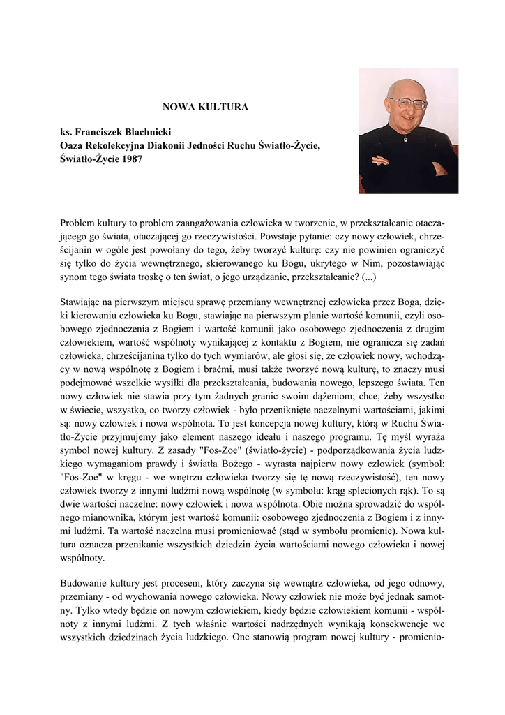 NOWA KULTURA ks. Franciszek Blachnicki Oaza Rekolekcyjna Diakonii Jedności Ruchu Światło-Życie, Światło-Życie 1987 Problem kultury to problem zaangażowania człowieka w tworzenie, w przekształcanie otaczającego go świata, otaczającej go rzeczywistości. Powstaje pytanie: czy nowy człowiek, chrześcijanin w ogóle jest powołany do tego, żeby tworzyć kulturę: czy nie powinien ograniczyć się tylko do życia wewnętrznego, skierowanego ku Bogu, ukrytego w Nim, pozostawiając synom tego świata troskę o ten świat, o jego urządzanie, przekształcanie? (...) Stawiając na pierwszym miejscu sprawę przemiany wewnętrznej człowieka przez Boga, dzięki kierowaniu człowieka ku Bogu, stawiając na pierwszym planie wartość komunii, czyli osobowego zjednoczenia z Bogiem i wartość komunii jako osobowego zjednoczenia z drugim człowiekiem, wartość wspólnoty wynikającej z kontaktu z Bogiem, nie ogranicza się zadań człowieka, chrześcijanina tylko do tych wymiarów, ale głosi się, że człowiek nowy, wchodzący w nową wspólnotę z Bogiem i braćmi, musi także tworzyć nową kulturę, to znaczy musi podejmować wszelkie wysiłki dla przekształcania, budowania nowego, lepszego świata. Ten nowy człowiek nie stawia przy tym żadnych granic swoim dążeniom; chce, żeby wszystko w świecie, wszystko, co tworzy człowiek - było przeniknięte naczelnymi wartościami, jakimi są: nowy człowiek i nowa wspólnota. To jest koncepcja nowej kultury, którą w Ruchu Światło-Życie przyjmujemy jako element naszego ideału i naszego programu. Tę myśl wyraża symbol nowej kultury. Z zasady "Fos-Zoe" (światło-życie) - podporządkowania życia ludzkiego wymaganiom prawdy i światła Bożego - wyrasta najpierw nowy człowiek (symbol: "Fos-Zoe" w kręgu - we wnętrzu człowieka tworzy się tę nową rzeczywistość), ten nowy człowiek tworzy z innymi ludźmi nową wspólnotę (w symbolu: krąg splecionych rąk). To są dwie wartości naczelne: nowy człowiek i nowa wspólnota. Obie można sprowadzić do wspólnego mianownika, którym jest wartość komunii: osobowego zjednoczenia z Bogiem i z innymi ludźmi. Ta wartość naczelna musi promieniować (stąd w symbolu promienie). Nowa kultura oznacza przenikanie wszystkich dziedzin życia wartościami nowego człowieka i nowej wspólnoty. Budowanie kultury jest procesem, który zaczyna się wewnątrz człowieka, od jego odnowy, przemiany - od wychowania nowego człowieka. Nowy człowiek nie może być jednak samotny. Tylko wtedy będzie on nowym człowiekiem, kiedy będzie człowiekiem komunii - wspólnoty z innymi ludźmi. Z tych właśnie wartości nadrzędnych wynikają konsekwencje we wszystkich dziedzinach życia ludzkiego. One stanowią program nowej kultury - promienio- wania wartości nowego człowieka i nowej wspólnoty we wszystkich dziedzinach życia. Jest to próba wprowadzenia we wszystkich dziedzinach życia nowego ładu, w którym prawdziwe wartości są rzeczywiście postawione na pierwszym miejscu i wszystko służy realizowaniu tych wartości. Nic nie może przeszkadzać w urzeczywistnianiu tych najwyższych wartości, wszystko ma pomagać w ich realizowaniu. Gdy te założenia są realizowane, wtedy mówimy o nowej kulturze. Jeszcze zwróćmy uwagę na przymiotnik "nowy" w wyrażeniach "nowy człowiek", "nowa wspólnota", "nowa kultura". Jest on zaczerpnięty z Pisma świętego. Nie chodzi o nowość w znaczeniu "nowoczesność". Ludzie dzisiejsi są często zafascynowani tą nowością; chcieliby, żeby wszystko było nowe, to znaczy inne w stosunku do tego, co było przedtem, dawniej; z pewną pogardą patrzą na rzeczy już przedawnione (na Zachodzie np. książki wydane przed trzema laty są już uważane za nieaktualne, a wszyscy rzucają się na to, co najnowsze). Objawia się wszędzie jakaś żądza nowości. Stawia się znak równości pomiędzy "nowy" a "lepszy", "doskonalszy", zakładając, że to co nowsze, musi być doskonalsze od tego, co było przedtem. U podstaw takiej oceny leży jakieś bezgraniczne zaufanie do idei ewolucji, postępu. Głosi się hasła postępu we wszystkich dziedzinach życia; głosi się teorię ewolucji, która mówi, że powstają coraz doskonalsze formy, przyjmuje się tę teorię w zakresie nieograniczonym, stosując do wszystkich przejawów życia ludzkiego, dochodzi się do tego, że ocenia się to, co jest historycznie młodsze zawsze jako lepsze. Stąd jakaś pogoń za nowością, nowoczesnością, za modą (bo moda ciągle coś nowego ludziom sugeruje). Stąd też dość powszechnie ludzie, zwłaszcza na Zachodzie, ulegają pewnemu schematowi myślenia, który stawia ich wobec alternatywy: konserwatysta - progresista. Wszystko próbuje się oceniać według tego schematu. Kiedy wybrano nowego papieża - Jana Pawła II, od razu pojawiły się spekulacje: czy on będzie papieżem konserwatywnym czy postępowym? Potem wnet pojawiły się zarzuty: jednak konserwatywny, bo staje w obronie życia dzieci nie narodzonych, bo nie pozwala na rozwody, na święcenia kapłańskie dla kobiet itp. (...) Jeżeli mówimy: nowa kultura, nowa wspólnota, nowy człowiek, to musimy pamiętać, że słowo "nowe" czerpiemy z Objawienia Bożego, z Pisma świętego, gdzie jest mowa o nowym człowieku, o nowym stworzeniu, a w Apokalipsie powiedziane jest: Oto czynię wszystko nowe (Ap 21,5). Słowo "nowy" w Piśmie świętym łączy się z tajemnicą Wcielenia i Odkupienia człowieka, z nową rzeczywistością, którą jest Zmartwychwstanie Chrystusa. Ono konstytuuje nowy porządek, który jest dla człowieka porządkiem ostatecznym. Chrześcijańska teoria ewolucji jest inna niż ta, którą się nam sugeruje. Natura ludzka osiągnęła szczyt swojego rozwoju, swojego wyniesienia, doskonałości wtedy, kiedy Bóg ją przyjął, kiedy Bóg ją odnowił. W Zmartwychwstaniu Chrystusa człowiek osiągnął najwyższy szczyt, jaki może osiągnąć w swoim rozwoju, w swojej ewolucji. Dlate