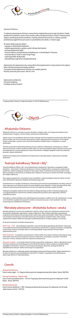 w w w.kultu a.org t a i r ysw Szanowni Państwo, Z radością prezentujemy Państwu naszą ofertę międzykulturowych zajęć dla dzieci. Każde spotkanie to podróż w różne strony świata, pełna niezapomnianych wrażeń. Proponowane zajęcia uatrakcyjnią bal karnawałowy, imprezę okolicznościową lub w ciekawy sposób przedstawią zagadnienia poruszane w przedszkolu lub szkole, w trakcie zajęć. W czasie takiej wyprawy dzieci: - zagrają na afrykańskich bębnach, - zaśpiewają piosenkę w języku suahili (Afryka Wschodnia), - poznają afrykańskie bajki, - wezmą udział w przedstawieniu kukiełkowym o rówieśnikach z Tanzanii, - stworzą własne maski w stylu Tinga Tinga, - wykonają batiki afrykańskie, - zaprojektują oryginalną masajską biżuterię. Zapraszamy do zapoznania się z naszą ofertą. W przygotowaniu mamy jeszcze inne zajęcia, które wkrótce poszerzą tematykę spotkań. Z przyjemnością odpowiemy Państwu na wszelkie pytania. Prosimy dzwonić pod numer: 504 421 914. Zapraszamy serdecznie, Patrycja Zandberg Fundacja „Kultury Świata” Fundacja „Kultury Świata”, ul. Dąbrowszczaków 12/129, 03-484 Warszawa, O f e r ta Afrykańska Orkiestra Afrykańska Orkiestra to warsztaty muzyczne dla dzieci w każdym wieku. Są to zajęcia prowadzone przez profesjonalnych muzyków z róznych krajów z kontynentu afrykańskiego. Zajęcia mają na celu przybliżenie dzieciom bardzo istotnego elementu dziedzictwa kulturowego Afryki, jakim jest jej muzyka i gra na instrumentach perkusyjnych. Zajęcia wpływają bardzo pozytywnie na rozwiajanie zmysłu muzycznego i wyczucie rytmu, który jest podstawą w każdej muzyce, a szczególnie w muzyce afrykańskiej. Tematem przewodnim Afrykańskiej Orkiestry jest gra na bębnach afrykańskich, pochodzących z różnych rejonów kontynentu. Podczas spotkania każde z dzieci ma szansę samodzielnie wygrać zaproponowany przez prowadzącego rytm, poznać egzotyczne nazwy instrumentów z odległych zakątków świata oraz zaśpiewać piosenkę w języku afrykańskim. Spotkanie prowadzone jest interaktywnie. Dla dzieci jest to wspaniała zabawa i jednocześnie niezwykłe wydarzenie. Teatrzyk kukiełkowy “Bahati i Ally” Teatrzyk kukiełkowy “Bahati i Ally” jest przedstawieniem edukacyjnym. Opowiada o przygodach dwójki bohaterów - dziewczynki i chłopca pochodzących z Tanzanii. Perypetie dzieci nawiązują do współczesnych problemów z jakimi borykają się mieszkańcy wielu krajów Afryki. Przedstawienie porusza poważne tematy jakimi są dostęp do wody pitnej czy edukacja dzieci. Wyjaśnia i tłumaczy je w sposób zrozumiały i przystępny dla młodych odbiorców. Są to zajęcia przygotowane i prowadzone przez metodyków i osoby posiadające obszerną wiedzę na temat kultur afrykańskich (absolwenci Wydziału Orientalistycznego UW). Przedstawienie ma charakter interaktywny, skierowane jest do starszych przedszkolaków oraz dzieci z klas 0-3. Dzieci zapraszane są do dyskusji otwierane są poszczególne rejony skojarzeń i wiedzy dotyczącej Afryki. Mali widzowie mają szansę poznać podstawowe zwroty oraz zaśpiewać piosenkę w języku kiswahili. w przygody bohaterów. Dynamiczny charakter przedstawienia pozwala nawet najbardziej ruchliwym wysiedzieć do końca. Teatr lalkowy, tudzież kukiełkowy jest najtrafniejszą formą przekazu wszelkich treści dla najmłodszych, z uwagi na ich konkretno-wyobrażeniowy poziom myślenia. Łatwo przenoszą się w świat wyobraźni i bez lęku utożsamiają się z kukiełkowymi bohaterami. Warsztaty plastyczne - afrykańska kultura i sztuka Warsztaty plastyczne są twórczymi spotkaniami z dziećmi, których celem jest rozbudzenie zainteresowania oryginalnej sztuki ludowej oraz poznają wyroby codziennego użytku pochodzące z Afryki. Własna twórczość oraz atrakcyjne techniki pracy niezwykle skutecznie przemawiają do wyobraźni dzieci. Takie metody angażowania młodych odbiorców sprawiają iż spotkania plastyczne na długo zapadają w ich pamięci. W ramach powyższych warsztatów proponujemy: Maski Tinga – Tinga to niezwykle barwny sposób przedstawiania rzeczywistości, zakorzeniony i czerpiący inspirację z otaczającego artystę świata. Podczas warsztatów dzieci uruchamiają pokłady swojej wyobraźni tworząc własne, niepowtarzalne prace. Batiki afrykańskie – to spotkanie o powszechnym w Afryce batiku. Przy okazji warsztatów prezentujemy oryginalne batiki wytworzone przez ludowych twórców z kontynentu, opowiadamy o sposobie i technikach tworzenia i w końcu zachęcamy dzieci do wykonania własnych prac. Naszyjniki masajskie – to warsztaty, których tematem przewodnim są Masajowie - jedna z najbardziej znanych i barwnych społeczności zamieszkujących tereny Afryki Wschodniej. Podczas spotkania szczególnie blisko przyglądamy się biżuterii, noszonej i wytwarzanej przez Masajów. Warsztaty są okazją dla dzieci do zaprojektowania własnych ozdób, wzorowanych na oryginalnych. do dzieci ze starszych grup przedszkolnych oraz klas 0-3. Ciekawe i niespotykane techniki plastyczne zapewniają odbiorcom wspaniałą zabawę. Cennik: Afrykańska Orkiestra Czas trwania zajęć - 1h. Zajęcia skierowane do nieograniczonej ilości dzieci. Koszt: 500 PLN Teatrzyk kukiełkowy “Bahati i Ally” Czas trwania przedstawienia - 50 min. Prpozycja skierowana do grup nie większych niż 60 dzieci. Koszt: 300 PLN Warsztat plastyczny: Czas trwania spotkania: 1.30h. Propozycja skierowana do grup nie większych niż 30 osób jednorazowo. Koszt: 150 PLN. Fundacja „Kultury Świata”, ul. Dąbrowszczaków 12/129, 03-484 Warszawa,