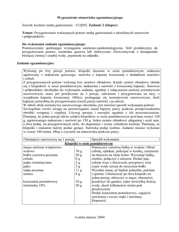 Wyposażenie stanowiska egzaminacyjnego Zawód: kucharz małej gastronomii - 512[05] Zadanie 2 (klopsy) Temat: Przygotowanie wskazanych potraw małej gastronomii z określonych surowców i półproduktów. Do wykonania zadania egzaminacyjnego: Pomieszczenie spełniające wymagania sanitarno-epidemiologiczne. Stół produkcyjny do przygotowania potraw, kuchenka gazowa lub elektryczna. Zlewozmywak z dostępemdo bieżącej zimnej i ciepłej wody, pojemnik na odpadki. Zadanie egzaminacyjne: Wykonaj po trzy porcje potraw: klopsiki duszone w sosie pomidorowym, makaron ugotowany z makaronu gotowego, surówka z kapusty kwaszonej z dodatkiem marchwi i cebuli. Z przygotowanych potraw wykonaj trzy zestawy obiadowe. Każdy zestaw obiadowy składa się z klopsików w sosie pomidorowym, makaronu i surówki z kwaszonej kapusty. Surowce i półprodukty niezbędne do wykonania zadania, zgodnie z załączonym poniżej normatywem surowcowym, masz już przeliczone na 3 porcje, odważone i przygotowane na tacy, z wyjątkiem kapusty kwaszonej. Oblicz, posługując się normatywem surowcowym, ilość kapusty potrzebną do przygotowania trzech porcji surówki i ją odważ. W tabeli obok normatywu surowcowego określony jest również sposób wykonania potraw. Szczególnie zwróć uwagę na przestrzeganie zasad higieny pracy podczas przeprowadzania obróbki wstępnej i cieplnej. Używaj sprzętu i narzędzi zgodnie z ich przeznaczeniem. Pamiętaj, że jedna porcja (dwie sztuki) klopsików w sosie pomidorowym powinna ważyć 150 g, ugotowanego makaronu i surówki po 150 g. Jeden zestaw obiadowy zdegustuj i oceń sam, a dwa podaj, na przygotowanym stole, do degustacji i oceny członkom komisji. Pamiętaj, że klopsiki i makaron należy podać gorące. Surówkę podaj osobno. Zadanie musisz wykonać w czasie 180 minut. Dbaj o czystość na stanowisku podczas pracy. Normatyw surowcowy na 1 porcję: Sposób wykonania Klopsiki w sosie pomidorowym mięso mielone wieprzowoNamoczyć czerstwą bułkę w wodzie. Obrać wołowe 70 g cebulę, opłukać, pokrajać w kostkę, zrumienić bułka czerstwa-pszenna 20 g na tłuszczu na złoty kolor. Wycisnąć bułkę, cebula 8g zemleć, połączyć z mięsem. Dodać jaja, mąka ziemniaczana 2g cebulę wraz z tłuszczem, przyprawy oraz jajko 5g część wody użytej do moczenia bułki. mąka pszenna 11 g Wyrobić masę, aż będzie jednolita, pulchna smalec 8g i spoista. Uformować po dwa klopsiki na jedna porcję, obtoczyć w mące, obsmażyć, koncentrat pomidorowy 10 g przełożyć do garnka, zalać niewielką ilością śmietanka 18% 20 g wody, dusić kilkanaście minut pod przykryciem. Dodać koncentrat pomidorowy, zagęścić zawiesina z reszty mąki i śmietany. Doprawić. Łomża marzec 2004 Makaron makaron fabryczny świderki woda sól kapusta kwaszona marchew cebula olej zielona pietruszka 70 g Makaron wrzucić do wrzącej, osolonej wody. Zamieszać, gotować do miękkości. Odcedzić, przepłukać wodą. Przed podaniem podgrzać. Surówka z kapusty kwaszonej 100g Przeprowadzić obróbkę wstępna marchwi 35 g i cebuli. Kapustę odcisnąć i pokroić. 10 g Wymieszać składniki i doprawić do 5g smaku. Wyporcjować i udekorować. 1. Stół produkcyjny, kuchenka gazowa lub elektryczna, zlewozmywak 2. Wykaz sprzętu drobnego dla jednej osoby egzaminowanej: − miski - 2 szt. − deska do krojenia - l szt. − nóż kuchenny - l szt. − garnek z pokrywką - 2 szt. − cedzak - l szt. − patelnia mała - l szt. − patelnia duża - 2 szt. − łyżka drewniana - 2 szt. − łopatka - l szt. − mątewka - 1 szt. − tarka - l szt. − sztućce - 3 kpl. 3. Do dyspozycji zdającego: waga, maszynka do mielenia, talerze płaskie i zakąskowe, lodówka, środki czystości ( mydło, ręczniki papierowe, płyn do mycia naczyń), pojemnik na odpadki. 4. Surowce potrzebne do wykonania zadania egzaminacyjnego − mięso mielone wieprzowo-wołowe - 210g − bułka czerstwa - 60g − cebula - 54 g − mąka ziemniaczana - 6g − jajko- 15g (l/3 szt.) − mąka pszenna - 33g − smalec - 50 g − koncentrat pomidorowy - 30g − śmietanka 18% - 60g − makaron świderki - 210g − kapusta kwaszona 300g − marchew - 105g − olej - 15g zielona pietruszka, przyprawy; sól, pieprz, cukier Uwaga: należy przygotować większą ilość kapusty kwaszonej, ponieważ jest ważona przez zdających, pozostałe produkty powinny być przygotowane na tacy już w odpowiednich ilościach. Łomża marzec 2004 5. Wyposażenie dodatkowe pomieszczenia egzaminacyjnego − tablica (do zapisania godziny rozpoczęcia egzaminu) 1 szt. − zegar 1 szt. − stolik i krzesła (dla egzaminatorów do wypełnienia dokumentacji egzaminacyjnej)1 szt. 6. Wyposażenie uzupełniające − identyfikatory dla zdających (zdający 1,2 i 3) − identyfikatory dla egzaminatorów − fartuchy dla egzaminatorów Łomża marzec 2004