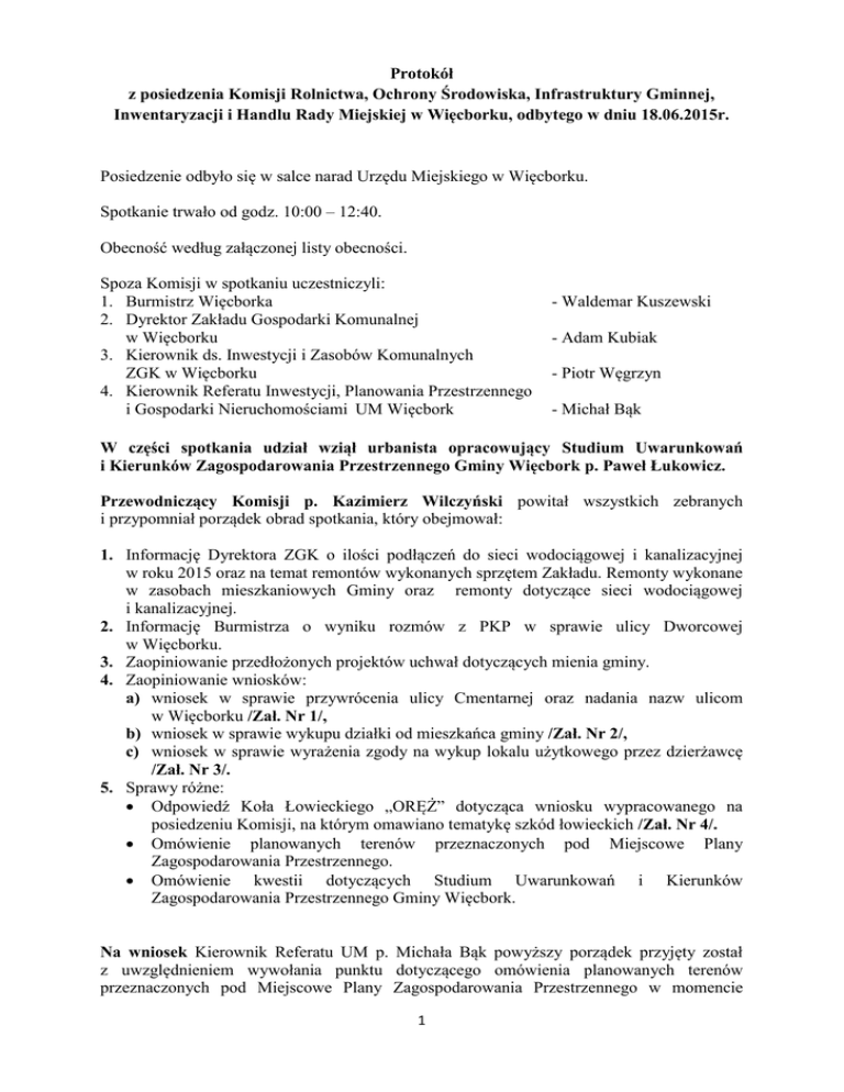 Protokół z posiedzenia Komisji Rolnictwa, Ochrony Środowiska, Infrastruktury Gminnej, Inwentaryzacji i Handlu Rady Miejskiej w Więcborku, odbytego w dniu 18.06.2015r. Posiedzenie odbyło się w salce narad Urzędu Miejskiego w Więcborku. Spotkanie trwało od godz. 10:00 – 12:40. Obecność według załączonej listy obecności. Spoza Komisji w spotkaniu uczestniczyli: 1. Burmistrz Więcborka 2. Dyrektor Zakładu Gospodarki Komunalnej w Więcborku 3. Kierownik ds. Inwestycji i Zasobów Komunalnych ZGK w Więcborku 4. Kierownik Referatu Inwestycji, Planowania Przestrzennego i Gospodarki Nieruchomościami UM Więcbork - Waldemar Kuszewski - Adam Kubiak - Piotr Węgrzyn - Michał Bąk W części spotkania udział wziął urbanista opracowujący Studium Uwarunkowań i Kierunków Zagospodarowania Przestrzennego Gminy Więcbork p. Paweł Łukowicz. Przewodniczący Komisji p. Kazimierz Wilczyński powitał wszystkich zebranych i przypomniał porządek obrad spotkania, który obejmował: 1. Informację Dyrektora ZGK o ilości podłączeń do sieci wodociągowej i kanalizacyjnej w roku 2015 oraz na temat remontów wykonanych sprzętem Zakładu. Remonty wykonane w zasobach mieszkaniowych Gminy oraz remonty dotyczące sieci wodociągowej i kanalizacyjnej. 2. Informację Burmistrza o wyniku rozmów z PKP w sprawie ulicy Dworcowej w Więcborku. 3. Zaopiniowanie przedłożonych projektów uchwał dotyczących mienia gminy. 4. Zaopiniowanie wniosków: a) wniosek w sprawie przywrócenia ulicy Cmentarnej oraz nadania nazw ulicom w Więcborku /Zał. Nr 1/, b) wniosek w sprawie wykupu działki od mieszkańca gminy /Zał. Nr 2/, c) wniosek w sprawie wyrażenia zgody na wykup lokalu użytkowego przez dzierżawcę /Zał. Nr 3/. 5. Sprawy różne: Odpowiedź Koła Łowieckiego „ORĘŻ” dotycząca wniosku wypracowanego na posiedzeniu Komisji, na którym omawiano tematykę szkód łowieckich /Zał. Nr 4/. Omówienie planowanych terenów przeznaczonych pod Miejscowe Plany Zagospodarowania Przestrzennego. Omówienie kwestii dotyczących Studium Uwarunkowań i Kierunków Zagospodarowania Przestrzennego Gminy Więcbork. Na wniosek Kierownik Referatu UM p. Michała Bąk powyższy porządek przyjęty został z uwzględnieniem wywołania punktu dotyczącego omówienia planowanych terenów przeznaczonych pod Miejscowe Plany Zagospodarowania Przestrzennego w momencie 1 pojawienia się urbanisty opracowującego ww. dokument, który z racji innych obowiązków zawodowych dysponować będzie ograniczonym czasem. W dalszej części przystąpiono do realizacji przyjętego porządku obrad i zgodnie z nim, jako pierwszy głos zabrał Dyrektor ZGK przedstawiając informację o ilości podłączeń do sieci wodociągowej i kanalizacyjnej w roku 2015 oraz na temat remontów wykonanych sprzętem Zakładu. Temat związany z remontami wykonanymi w zasobach mieszkaniowych Gminy omówił Kierownik ZGK p. Piotr Węgrzyn Powyższe Informację stanowią Załącznik do niniejszego Protokołu /do wglądu w biurze RM oraz stronie BIP Gminy Więcbork/ Przewodniczący Komisji otworzył dyskusję pytając o posesję przy ulicy Hallera 15 w Więcborku i ewentualne czynności dotyczące komina na budynku. Pan Piotr Węgrzyn wyjaśnił, że dotyczy to budynku Wspólnoty Mieszkaniowej, natomiast on może wypowiadać się tylko w kwestii zasobów należących do Gminy Więcbork. Jeżeli jednak coś z tym kominem się dzieje prace zostaną poczynione. Trudno jest mu spamiętać wszystkie sprawy i problemy wywołane w trakcie zebrań Wspólnot, a odbyło się ich siedemdziesiąt trzy ogółem ale na pewno jest to spisane w odrębnym zestawieniu według którego realizowane są zadania. Przewodniczący Komisji chciał również wiedzieć, czy usunięte zostało szambo przy posesji na ulicy Gdańskiej 13. Pan Piotr Węgrzyn podał, że zostało to już wykonane dwa lata temu. Poza tym zgodnie z zaleceniami nadzoru wymienione zostały w budynku drzwi / łącznie 3/ i okna. Do wymiany pozostaje podłoga, a najpilniejsza jest wspomniana wcześniej wymiana dachu. Przewodniczący Komisji nawiązał również do braków w dokumentacji dotyczącej instalacji wodno-kanalizacyjnej, pytając czy w tej materii jest już jakiś postęp. Dyrektor ZGK wyjaśnił, że złożony został projekt zamienny ale jest to procedura dość czasochłonna. W międzyczasie pojawiają się inne problemy, jak chociażby ten dotyczący rozbiórki komina przy bloku Nr 1 na Osiedlu BoWiD, a wszystko ma swój określony tryb działania i terminy. Pan Piotr Węgrzyn uzupełnił, że procedura dotycząca rozbiórki komina mogła być już ujęta przy wniosku dotyczącym termomodernizacji budynku i wszystko załatwione byłoby jednym pozwoleniem. Sprawa pojawiła się teraz no i w takim przypadku musi być to prowadzone odrębnym tokiem z odrębnym pozwoleniem. Takie rozwiązanie wiąże się z odpowiednim czasem oczekiwania, którego nie da się obejść. Radny Jan Antczak dopytywał o realizację zadania budowy wodociągu do siedmiu posesji w Runowie Krajeńskim tzn. na jakim etapie są obecnie działania ZGK w tym zakresie. Dyrektor ZGK mówił, że dwa tygodnie wcześniej przeprowadził rozmowę z projektantem dokumentacji, który poinformował go o konieczności uzyskania kolejowych mapek geodezyjnych. Wszystko to jest w trakcie załatwiania. Projekt jest praktycznie wykonany pozostaje jedynie naniesienie na niego danych z ww. mapek. 2 Radny Antczak ubolewał, że sprawa ciągnie się tak długo, choć zapewniano, iż nie będzie z tym problemów. Fakt jest natomiast taki, że rolnicy nadal nie mają wody, a on sam nie wie co im mówić. Może dojść do sytuacji, że ZGK będzie musiało im wodę wozić. Radny zmieniając temat wspomniał też o zgłaszanym trzy miesiące temu problemie dotyczącym wymiany rynny przy dachu świetlicy wiejskiej. Pan Węgrzyn przyznał, że sprawa rynny mu umknęła ale odnotował i postara się to w krótkim czasie załatwić. Radny Andrzej