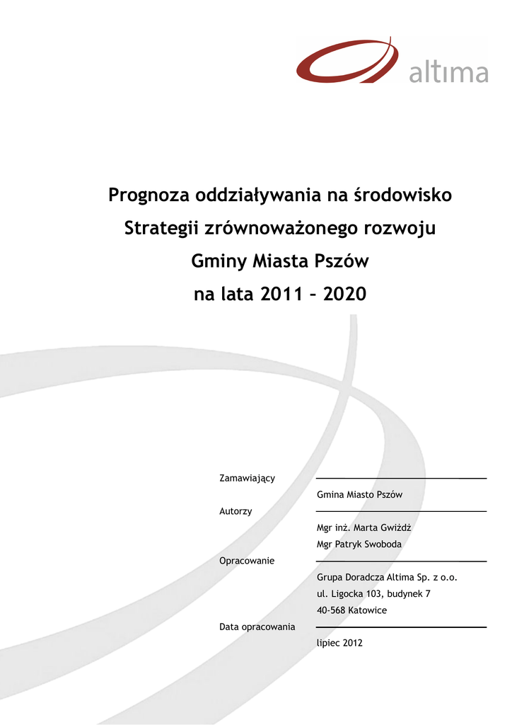 Prognoza oddziaływania na środowisko Strategii zrównoważonego rozwoju Gminy Miasta Pszów na lata 2011 – 2020 Zamawiający Gmina Miasto Pszów Autorzy Mgr inż. Marta Gwiżdż Mgr Patryk Swoboda Opracowanie Grupa Doradcza Altima Sp. z o.o. ul. Ligocka 103, budynek 7 40-568 Katowice Data opracowania lipiec 2012 Prognoza oddziaływania na środowisko Strategii zrównoważonego rozwoju Gminy Miasta Pszów na lata 2011 - 2020 1 WSTĘP 1.1 PODSTAWA FORMALNA OPRACOWANIA 2 CHARAKTERYSTYKA STRATEGII ZRÓWNOWAŻONEGO ROZWOJU GMINY MIASTA PSZÓW NA LATA 2011-2020 2.1 ZAWARTOŚĆ 2.2 POWIĄZANIA Z INNYMI DOKUMENTAMI 2.2.1 NARODOWE STRATEGICZNE RAMY ODNIESIENIA NA LATA 2007-2013 (NSRO) 2.2.2 STRATEGIA ROZWOJU WOJEWÓDZTWA ŚLĄSKIEGO NA LATA 2000 – 2020 2.2.3 PLAN ZAGOSPODAROWANIA PRZESTRZENNEGO WOJEWÓDZTWA ŚLĄSKIEGO 2.2.4 STUDIUM UWARUNKOWAŃ I KIERUNKÓW ZAGOSPODAROWANIA PRZESTRZENNEGO 2.2.5 PROGRAM OCHRONY ŚRODOWISKA DLA GMINY MIASTA PSZÓW 2.3 GŁÓWNE CELE STRATEGII ZRÓWNOWAŻONEGO ROZWOJU GMINY MIASTA PSZÓW NA LATA 2011 - 2020 2.4 ANALIZA STRATEGII Z PUNKTU WIDZENIA CELÓW OCHRONY ŚRODOWISKA NA SZCZEBLU KRAJOWYM I 4 4 6 6 8 9 9 10 10 11 11 17 POLITYKA EKOLOGICZNA PAŃSTWA NA LATA 2007-2020 Z UWZGLĘDNIENIEM PERSPEKTYWY NA LATA 2011-2014 17 NARODOWE STRATEGICZNE RAMY ODNIESIENIA NA LATA 2007-2013 (NSRO) 18 STRATEGIA ROZWOJU WOJEWÓDZTWA ŚLĄSKIEGO NA LATA 2000-2020 18 19 PLAN ZAGOSPODAROWANIA PRZESTRZENNEGO WOJEWÓDZTWA ŚLĄSKIEGO REGIONALNYM 2.4.1 2.4.2 2.4.3 2.4.4 3 ANALIZA STANU ŚRODOWISKA NATURALNEGO NA TERENIE PSZOWA 3.1 ANALIZA AKTUALNEGO STANU ŚRODOWISKA ORAZ POTENCJALNYCH ZMIAN PRZY BRAKU REALIZACJI ZAŁOŻEŃ STRATEGII 3.1.1 POWIETRZE ATMOSFERYCZNE I KLIMAT 3.1.2 WODY POWIERZCHNIOWE I PODZIEMNE 3.1.3 POWIERZCHNIA ZIEMI 3.1.4 ŚRODOWISKO PRZYRODNICZE 3.1.5 HAŁAS 3.1.6 ODPADY 3.1.7 ZABYTKI 3.2 ANALIZA STANU ŚRODOWISKA NA OBSZARACH OBJĘTYCH PRZEWIDYWANYM ZNACZĄCYM ODDZIAŁYWANIEM 20 20 20 22 23 25 25 26 27 28 ANALIZA ISTOTNYCH PROBLEMÓW ŚRODOWISKA, W SZCZEGÓLNOŚCI DOTYCZĄCYCH OBSZARÓW CHRONIONYCH 29 STAN ŚRODOWISKA NA TERENACH, GDZIE BĘDĄ REALIZOWANE ZAŁOŻENIA STRATEGII 32 MOGĄCYM PROWADZIĆ DO TRWAŁYCH PRZEKSZTAŁCEŃ ŚRODOWISKA 3.3 3.4 4 ANALIZA I OCENA PRZEWIDYWANYCH ZNACZĄCYCH ODDZIAŁYWAŃ NA ŚRODOWISKO ZWIĄZANYCH Z REALIZACJĄ STRATEGII 4.1 4.2 4.3 4.4 4.5 5 34 RODZAJ I SKALA PRZEWIDYWANYCH ODDZIAŁYWAŃ 34 WPŁYW REALIZACJI STRATEGII NA LUDZI I ŚRODOWISKO 40 WPŁYW REALIZACJI STRATEGII NA DOBRA MATERIALNE I ZABYTKI 43 PRAWDOPODOBIEŃSTWO WYSTĄPIENIA, CZASU TRWANIA, CZĘSTOTLIWOŚCI I ODWRACALNOŚCI ODDZIAŁYWAŃ 44 INFORMACJE NA TEMAT MOŻLIWYCH SKUMULOWANYCH LUB TRANSGRANICZNYCH ODDZIAŁYWAŃ NA ŚRODOWISKO 45 OCENA STRATEGII Z PUNKTU WIDZENIA WPŁYWU NA ŚRODOWISKO 2|Strona 47 Prognoza oddziaływania na środowisko Strategii zrównoważonego rozwoju Gminy Miasta Pszów na lata 2011 - 2020 5.1 ROZWIĄZANIA MAJĄCE NA CELU ZAPOBIEGANIE, OGRANICZANIE LUB KOMPENSACJĘ PRZYRODNICZĄ NEGATYWNYCH ODDZIAŁYWAŃ NA ŚRODOWISKO, MOGĄCYCH BYĆ REZULTATEM REALIZACJI STRATEGII ORAZ ICH OCENA 47 5.2 UWAGI KOŃCOWE I ZALECENIA 49 6 STRESZCZENIE W JĘZYKU NIESPECJALISTYCZNYM 3|Strona 51 Prognoza oddziaływania na środowisko Strategii zrównoważonego rozwoju Gminy Miasta Pszów na lata 2011 - 2020 1 Wstęp 1.1 Podstawa formalna opracowania Prognoza oddziaływania na środowisko Strategii zrównoważonego rozwoju Gminy Miasta Pszów na lata 2011 – 2020 wykonana została przez Grupę Doradczą Altima Sp. z o.o. na zlecenie Urzędu Miasta Pszów. Podstawą prawną sporządzenia niniejszej Prognozy jest art. 46 Ustawy z dnia 3 października 2008 roku o udostępnianiu informacji o środowisku i jego ochronie, udziale społeczeństwa w ochronie środowiska oraz ocenach oddziaływania na środowisko (Dz.U. nr 199, poz. 1227). Artykuł ten nakłada obowiązek przeprowadzenia prognozy oddziaływania na środowisko skutków realizacji dokumentów strategicznych opracowanych przez organy administracyjne. Zapisy Ustawy z dnia 3 października 2008 roku o udostępnianiu informacji o środowisku i jego ochronie, udziale społeczeństwa w ochronie środowiska oraz ocenach oddziaływania na środowisko (Dz.U. nr 199, poz. 1227) są dostosowaniem prawodawstwa polskiego do postanowień Dyrektywy 2001 / 42 / WE z 27.06.2001 r. w sprawie oceny wpływu niektórych planów i programów na środowisko. 1.1.1. Zakres merytoryczny prognozy Prognoza oddziaływania na środowisko Strategii zrównoważonego rozwoju Gminy Miasta Pszów na lata 2010 – 2020 wykonana została zgodnie z wymogami art. 51 Ustawy z dnia 3 października 2008 roku o udostępnianiu informacji o środowisku i jego ochronie, udziale społeczeństwa w ochronie środowiska oraz ocenach oddziaływania na środowisko (Dz. U. Nr 199, poz. 1227). Podstawowymi elementami prognozy, zgodnie z w/w ustawą, powinny być: a) informacje o zawartości, głównych celach projektowanego dokumentu oraz jego powiązania z innymi dokumentami, b) informacje o metodach zastosowanych przy sporządzaniu prognozy, c) propozycje dotyczące przewidywanych metod analizy skutków realizacji postanowień projektowanego dokumentu oraz częstotliwości jej przeprowadzania, d) informacje o możliwym transgranicznym oddziaływaniu na środowisko, e) streszczenie sporządzone w języku niespecjalistycznym. 4|Strona Prognoza oddziaływania na środowisko Strategii zrównoważonego rozwoju Gminy Miasta Pszów na lata 2011 - 2020 1.1.2. Zastosowanie metody oceny Niniejsza prognoza została stworzona zgodnie z obowiązującymi przepisami prawnymi. W trakcie prac wykorzystano dostępną literaturę, dane Głównego Urzędu Statystycznego oraz dane udostępnione przez Urząd Miasta Pszów. Przy analizie wpływu Strategii zrównoważonego rozwoju Gminy Miasta Pszów na lata 2011 - 2020 na środowisko wykorzystano głównie metody opisowe oraz wykorzystano dostępne publikacje, raporty i opracowania dla miasta Pszowa, dotyczące stanu środowiska 