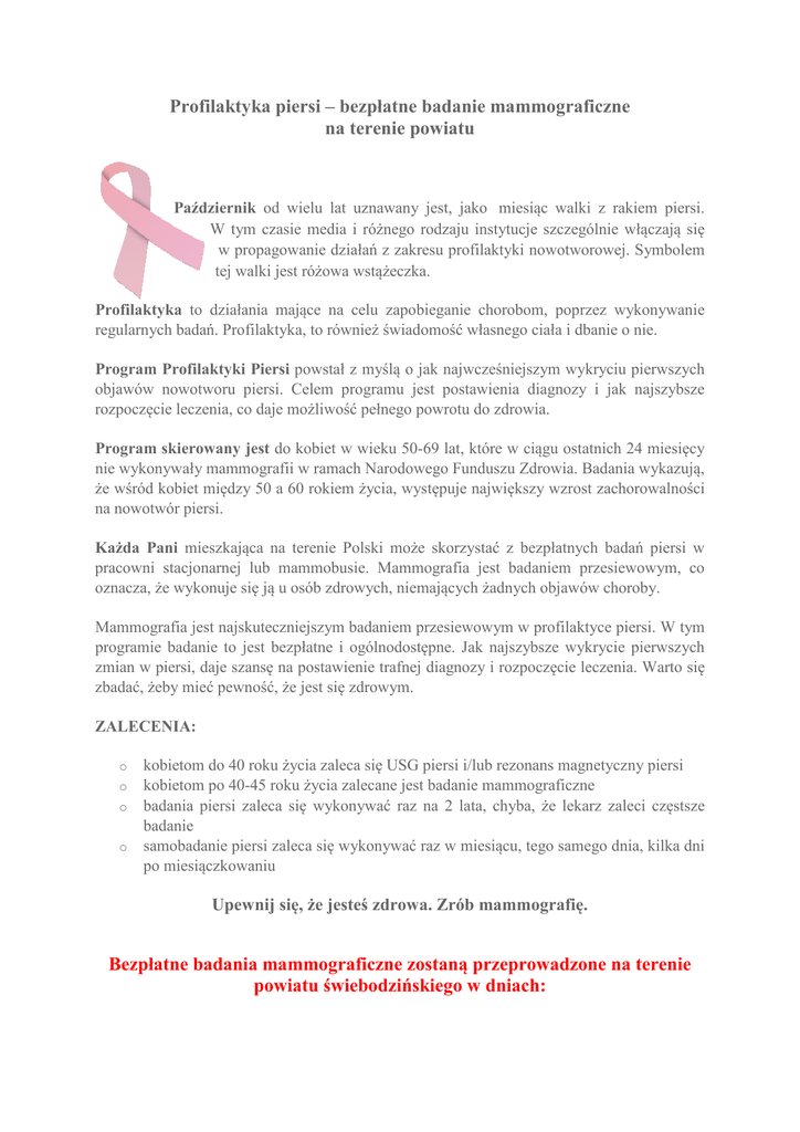 Profilaktyka piersi – bezpłatne badanie mammograficzne na terenie powiatu Październik od wielu lat uznawany jest, jako miesiąc walki z rakiem piersi. W tym czasie media i różnego rodzaju instytucje szczególnie włączają się w propagowanie działań z zakresu profilaktyki nowotworowej. Symbolem tej walki jest różowa wstążeczka. Profilaktyka to działania mające na celu zapobieganie chorobom, poprzez wykonywanie regularnych badań. Profilaktyka, to również świadomość własnego ciała i dbanie o nie. Program Profilaktyki Piersi powstał z myślą o jak najwcześniejszym wykryciu pierwszych objawów nowotworu piersi. Celem programu jest postawienia diagnozy i jak najszybsze rozpoczęcie leczenia, co daje możliwość pełnego powrotu do zdrowia. Program skierowany jest do kobiet w wieku 50-69 lat, które w ciągu ostatnich 24 miesięcy nie wykonywały mammografii w ramach Narodowego Funduszu Zdrowia. Badania wykazują, że wśród kobiet między 50 a 60 rokiem życia, występuje największy wzrost zachorowalności na nowotwór piersi. Każda Pani mieszkająca na terenie Polski może skorzystać z bezpłatnych badań piersi w pracowni stacjonarnej lub mammobusie. Mammografia jest badaniem przesiewowym, co oznacza, że wykonuje się ją u osób zdrowych, niemających żadnych objawów choroby. Mammografia jest najskuteczniejszym badaniem przesiewowym w profilaktyce piersi. W tym programie badanie to jest bezpłatne i ogólnodostępne. Jak najszybsze wykrycie pierwszych zmian w piersi, daje szansę na postawienie trafnej diagnozy i rozpoczęcie leczenia. Warto się zbadać, żeby mieć pewność, że jest się zdrowym. ZALECENIA: o o o o kobietom do 40 roku życia zaleca się USG piersi i/lub rezonans magnetyczny piersi kobietom po 40-45 roku życia zalecane jest badanie mammograficzne badania piersi zaleca się wykonywać raz na 2 lata, chyba, że lekarz zaleci częstsze badanie samobadanie piersi zaleca się wykonywać raz w miesiącu, tego samego dnia, kilka dni po miesiączkowaniu Upewnij się, że jesteś zdrowa. Zrób mammografię. Bezpłatne badania mammograficzne zostaną przeprowadzone na terenie powiatu świebodzińskiego w dniach: 1) od 1 do 3 października 2013 roku w godzinach od 9:00 do 17:00 w Zbąszynku 2) 04 października 2013 roku w godzinach od 9:00 do 17:00 w Szczańcu Samobadanie: O profilaktyce należy pamiętać cały czas. Samokontrola piersi powinna być wykonywana przez kobiety, od 20 roku życia aż do późnych lat. Badanie należy robić, co miesiąc, najlepiej tego samego dnia tygodnia, po zakończeniu miesiączki. Kobiety, które już nie miesiączkują, powinny badać się w ten sam dzień, każdego kolejnego miesiąca. W ten sposób kobieta może wyczuć niepokojące ją zmiany, które należy jak najszybciej skonsultować z lekarzem onkologiem. Najczęściej są to niegroźne zmiany związane z naturalnymi procesami zachodzącymi w organizmie kobiety. W młodym wieku spowodowane jest to zmianami hormonalnymi w trakcie cyklu owulacyjnego, a w późniejszych latach różnice w piersiach wynikają ze zmiany gęstości tkanki piersiowej. Wystarczy kilka minut w miesiącu, aby skontrolować piersi. Zobacz, jakie to proste!!! I KROK Stojąc przed lustrem ze swobodnie opuszczonymi ramionami, obejrzyj swoje piersi. Sprawdź, czy nie zauważasz zmian kształtu, położenia, wielkości, czy nie dostrzegasz zmian koloru, wciągnięć skóry. II KROK To samo wykonaj z rękoma uniesionymi do góry. Opartymi na biodrach. III KROK Ściskając brodawkę, zaobserwuj, czy nie wydobywa się z niej jakakolwiek wydzielina. IV KROK Pod prysznicem załóż lewą rękę za głowę, a prawą zbadaj lewą pierś całymi palcami. Zataczaj małe kółka, zgodnie z ruchem wskazówek zegara, przesuwając dłoń w kierunku brodawki. Sprawdź, czy nie czujesz stwardnienia lub guzka! V KROK Leżąc wsuń poduszkę pod prawy bark a prawą rękę pod głowę. Palcami lewej ręki zbadaj prawą pierś, tak jak pod prysznicem. Tak samo zbadaj lewą pierś. VI KROK Leżąc na wznak, połóż prawą rękę wzdłuż tułowia, zbadaj prawą pachę. Sprawdź, czy węzły chłonne nie są powiększone. W analogiczny sposób zbadaj lewą pachę. Jeśli cokolwiek wyda Ci się podejrzane, pilnie zgłoś się do poradni onkologicznej (nie wymaga skierowania) i wykonaj jedno z badań profilaktycznych, takich jak: o o o mammografia USG rezonans magnetyczny piersi Najważniejsze to rozwiać wszelkie wątpliwości i mieć pewność, że jesteś zdrowa! Źródło: http://salvemedica.pl/centrum-nowoczesnej-diagnostyki/akcje-specjalnemedica.html?utm_source=google&utm_medium=cpc&utm_campaign=salve http://pl.wikipedia.org/wiki/%C5%9Awiatowy_Dzie%C5%84_Walki_z_Rakiem