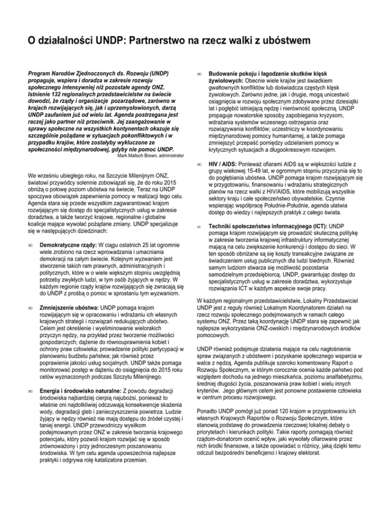 O działalności UNDP: Partnerstwo na rzecz walki z ubóstwem Program Narodów Zjednoczonych ds. Rozwoju (UNDP) propaguje, wspiera i doradza w zakresie rozwoju społecznego intensywniej niż pozostałe agendy ONZ. Istnienie 132 regionalnych przedstawicielstw na świecie dowodzi, że rządy i organizacje pozarządowe, zarówno w krajach rozwijających się, jak i uprzemysłowionych, darzą UNDP zaufaniem już od wielu lat. Agenda postrzegana jest raczej jako partner niż przeciwnik. Jej zaangażowanie w sprawy społeczne na wszystkich kontynentach okazuje się szczególnie pożądane w sytuacjach pokonfliktowych i w przypadku krajów, które zostałyby wykluczone ze społeczności międzynarodowej, gdyby nie pomoc UNDP. • Budowanie pokoju i łagodzenie skutków klęsk żywiołowych: Obecnie wiele krajów jest świadkiem gwałtownych konfliktów lub doświadcza częstych klęsk żywiołowych. Zarówno jedne, jak i drugie, mogą unicestwić osiągnięcia w rozwoju społecznym zdobywane przez dziesiątki lat i pogłębić istniejącą nędzę i nierówność społeczną. UNDP propaguje nowatorskie sposoby zapobiegania kryzysom, wdrażania systemów wczesnego ostrzegania oraz rozwiązywania konfliktów; uczestniczy w koordynowaniu międzynarodowej pomocy humanitarnej, a także pomaga zmniejszyć przepaść pomiędzy udzielaniem pomocy w krytycznych sytuacjach a długookresowym rozwojem. • HIV / AIDS: Ponieważ ofiarami AIDS są w większości ludzie z grupy wiekowej 15-49 lat, w ogromnym stopniu przyczynia się to do pogłębiania ubóstwa. UNDP pomaga krajom rozwijającym się w przygotowaniu, finansowaniu i wdrażaniu strategicznych planów na rzecz walki z HIV/AIDS, które mobilizują wszystkie sektory kraju i całe społeczeństwo obywatelskie. Czynnie wspierając współpracę Południe-Południe, agenda ułatwia dostęp do wiedzy i najlepszych praktyk z całego świata. • Techniki społeczeństwa informacyjnego (ICT): UNDP pomaga krajom rozwijającym się prowadzić skuteczną politykę w zakresie tworzenia krajowej infrastruktury informatycznej mającą na celu zwiększenie konkurencji i dostępu do sieci. W ten sposób obniżane są się koszty transakcyjne związane ze świadczeniem usług publicznych dla ludzi biednych. Również samym ludziom stwarza się możliwość pozostania samodzielnym przedsiębiorcą. UNDP, gwarantując dostęp do specjalistycznych usług w zakresie doradztwa, wykorzystuje rozwiązania ICT w każdym aspekcie swoje pracy. Mark Malloch Brown, administrator We wrześniu ubiegłego roku, na Szczycie Milenijnym ONZ, światowi przywódcy solennie zobowiązali się, że do roku 2015 obniżą o połowę poziom ubóstwa na świecie. Teraz na UNDP spoczywa obowiązek zapewnienia pomocy w realizacji tego celu. Agenda stara się przede wszystkim zagwarantować krajom rozwijającym się dostęp do specjalistycznych usług w zakresie doradztwa, a także tworzyć krajowe, regionalne i globalne koalicje mające wywołać pożądane zmiany. UNDP specjalizuje się w następujących dziedzinach: • Demokratyczne rządy: W ciągu ostatnich 25 lat ogromnie wiele zrobiono na rzecz wprowadzania i umacniania demokracji na całym świecie. Kolejnym wyzwaniem jest stworzenie takich ram prawnych, administracyjnych i politycznych, które w o wiele większym stopniu uwzględnią potrzeby zwykłych ludzi, w tym osób żyjących w nędzy. W każdym regionie rządy krajów rozwijających się zwracają się do UNDP z prośbą o pomoc w sprostaniu tym wyzwaniom. • Zmniejszenie ubóstwa: UNDP pomaga krajom rozwijającym się w opracowaniu i wdrażaniu ich własnych krajowych strategii i rozwiązań redukujących ubóstwo. Celem jest określenie i wyeliminowanie wielorakich przyczyn nędzy, na przykład przez tworzenie możliwości gospodarczych; dążenie do równouprawnienia kobiet i ochrony praw człowieka; prowadzenie polityki partycypacji w planowaniu budżetu państwa; jak również przez poprawienie jakości usług socjalnych. UNDP także pomaga monitorować postęp w dążeniu do osiągnięcia do 2015 roku celów wyznaczonych podczas Szczytu Milenijnego. • Energia i środowisko naturalne: Z powodu degradacji środowiska najbardziej cierpią najubożsi, ponieważ to właśnie oni najdotkliwiej odczuwają konsekwencje skażenia wody, degradacji gleb i zanieczyszczenia powietrza. Ludzie żyjący w nędzy również nie mają dostępu do źródeł czystej i taniej energii. UNDP przewodniczy wysiłkom podejmowanym przez ONZ w zakresie tworzenia krajowego potencjału, który pozwoli krajom rozwijać się w sposób zrównoważony i przy jednoczesnym poszanowaniu środowiska. W tym celu agenda upowszechnia najlepsze praktyki i odgrywa rolę katalizatora przemian. W każdym regionalnym przedstawicielstwie, Lokalny Przedstawiciel UNDP jest z reguły również Lokalnym Koordynatorem działań na rzecz rozwoju społecznego podejmowanych w ramach całego systemu ONZ. Przez taką koordynację UNDP stara się zapewnić jak najlepsze wykorzystanie ONZ-owskich i międzynarodowych środków pomocowych. UNDP również podejmuje działania mające na celu nagłośnienie spraw związanych z ubóstwem i pozyskanie społecznego wsparcia w walce z nędzą. Agenda publikuje szeroko komentowany Raport o Rozwoju Społecznym, w którym corocznie ocenia każde państwo pod względem dochodu na jednego mieszkańca, poziomu analfabetyzmu, średniej długości życia, poszanowania praw kobiet i wielu innych kryteriów. Jego głównym celem jest ponowne postawienie człowieka w centrum procesu rozwojowego. Ponadto UNDP pomógł już ponad 120 krajom w przygotowaniu ich własnych Krajowych Raportów o Rozwoju Społecznym, które stanowią podstawę do prowadzenia rzeczowej lokalnej debaty o priorytetach i kierunkach polityki. Takie raporty pomagają również rządom-donatorom ocenić wpływ, jaki wywołały ofiarowane przez nich środki finansowe, a także opowiadać o różnicy, jaką dzięki temu odczuli