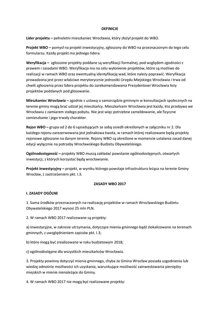 DEFINICJE Lider projektu – pełnoletni mieszkaniec Wrocławia, który złożył projekt do WBO. Projekt WBO – pomysł na projekt inwestycyjny, zgłoszony do WBO na przeznaczonym do tego celu formularzu. Każdy projekt ma jednego lidera. Weryfikacja – zgłoszone projekty poddane są weryfikacji formalnej, pod względem zgodności z prawem i zasadami WBO. Weryfikacja ma na celu wyłonienie projektów, które są możliwe do realizacji w ramach WBO oraz ewentualną identyfikację wad, które należy poprawić. Weryfikacja prowadzona jest przez właściwe merytorycznie jednostki Urzędu Miejskiego Wrocławia i trwa od chwili zgłoszenia przez lidera projektu do zarekomendowania Prezydentowi Wrocławia listy projektów poddanych pod głosowanie. Mieszkaniec Wrocławia – zgodnie z ustawą o samorządzie gminnym w konsultacjach społecznych na terenie gminy mogą brać udział jej mieszkańcy. Mieszkańcem Wrocławia jest każdy, kto przebywa we Wrocławiu z zamiarem stałego pobytu. Nie jest więc potrzebne zameldowanie, ale fizyczne zamieszkanie i jego trwały charakter. Rejon WBO – grupa od 2 do 6 sąsiadujących ze sobą osiedli określonych w załączniku nr 2. Dla każdego rejonu zarezerwowana jest jednakowa kwota, w ramach której realizowane będą projekty rejonowe zgłoszone na danym terenie. Rejony WBO są określone w momencie ustalania zasad danej edycji wyłącznie na potrzeby Wrocławskiego Budżetu Obywatelskiego. Ogólnodostępność – projekty WBO muszą zakładać powstanie ogólnodostępnych, otwartych inwestycji, z których korzystać będą wrocławianie. Projekt inwestycyjny – projekt, w wyniku którego powstaje infrastruktura leżąca na terenie Gminy Wrocław, z zastrzeżeniem pkt. I.3. ZASADY WBO 2017 I. ZASADY OGÓLNE 1. Suma środków przeznaczonych na realizację projektów w ramach Wrocławskiego Budżetu Obywatelskiego 2017 wynosi 25 mln PLN. 2. W ramach WBO 2017 realizowane są projekty: a) inwestycyjne, w zakresie utrzymania, dotyczące mienia gminnego bądź zlokalizowane na terenach gminnych, z uwzględnieniem zapisów pkt. I.3; b) które mogą być zrealizowane w roku budżetowym 2018; c) ogólnodostępne dla wszystkich mieszkańców Wrocławia. 3. Projekty powinny dotyczyć mienia gminnego, chyba że Gmina Wrocław posiada uzgodnienia lub wiedzę odnośnie możliwości ich uzyskania, warunkujące możliwość zainwestowania pieniędzy miejskich w mienie nienależące do Gminy. 4. W ramach WBO 2017 nie mogą być realizowane projekty: a) których szacunkowy koszt realizacji przekracza progi kwotowe określone w pkt. I.8 i I.9; b) dotyczące wykonania wyłącznie dokumentacji projektowej; c) sprzeczne z przyjętymi strategiami i programami Gminy Wrocław; d) których cel i treść w nich zawarta dotyczy przejawów, zjawisk, zachowań uznawanych powszechnie za społecznie naganne, wulgarne, obsceniczne, obraźliwe; e) których realizacja wiązałaby się z koniecznością przeprowadzenia dodatkowych konsultacji wśród mieszkańców; f) niezgodne z zakresem opisanym w pkt. I.2; g) dotyczące wyłącznie infrastruktury podziemnej; h) które wymagają stałej obsługi, zarządu albo w inny sposób generują wysokie koszty utrzymania. 5. W ramach WBO 2017 zgłaszać można projekty: a) ogólnomiejskie – dotyczące całego miasta lub więcej niż jednego rejonu; b) rejonowe –zlokalizowane i adresowane do mieszkańców konkretnego osiedla lub kilku osiedli znajdujących się w jednym z rejonów, o których mowa w pkt. I.7. 6. O tym, czy projekt jest ogólnomiejski, czy rejonowy decyduje lider. 7. Środki przeznaczone na realizację projektów w ramach WBO 2017 zostaną rozdzielone po równo pomiędzy 14 rejonów, co oznacza kwotę 1,5 mln PLN na każdy rejon. Celem podziału jest równomierne rozłożenie inwestycji na mapie miasta oraz zachęcenie do współpracy mieszkańców, zawiązywania koalicji oraz tworzenia lokalnych strategii i partnerstw. 8. Środki przeznaczone na projekty: a) w 14 rejonach – łącznie 21 mln PLN; b) ogólnomiejskie – łącznie 4 mln PLN, przy czym maksymalna wartość projektu ogólnomiejskiego to 1 mln PLN. 9. Projekty w rejonach podzielone są na dwa progi kwotowe: a) projekty małe: do 250 tys. PLN; b) projekty duże: do 750 tys. PLN. 10. Kwota 1,5 mln PLN przeznaczona na jeden rejon jest dzielona w następujący sposób: a) 750 tys. PLN – na projekty małe; b) 750 tys. PLN – na projekty duże. II. ZGŁASZANIE PROJEKTÓW 1. Projektem określa się pomysł do WBO składany przez lidera. Dopiero z chwilą wybrania go do realizacji, właściwe merytorycznie jednostki przygotowują dokumentację projektową. 2. Projekt może zgłosić jedna osoba – lider projektu, z którym będą ustalane zmiany dotyczące zakresu danej inwestycji aż do momentu jej zrealizowania. Zgłoszenie odbywa się poprzez wypełnienie formularza. 3. Projekty mogą być zgłaszane przez osoby pełnoletnie. 4. Formularz zostaje udostępniony 2 stycznia 2017 r.; w formie formularza elektronicznego oraz dokumentu PDF – na stronie wroclaw.pl/wbo. 5. Wypełniony wniosek można złożyć w formie elektronicznej z wykorzystaniem formularza dostępnego na stronie wroclaw.pl/wbo lub przekazać go na adres: Biuro ds. Partycypacji Społecznej ul. G. Zapolskiej 4, 50-032 Wrocław. 6. W przypadku przesłania formularza w formie elektronicznej całkowita wielkość załączników (format PDF, DOC, PNG albo JPG) nie może przekraczać 10 MB. 7. Ostateczny termin nadsyłania formularzy projektowych oraz wszelkich załączników do formularzy upływa 17 lutego 2017 r. W przypadku wysyłki pocztą tradycyjną liczy się data stempla pocztowego. 8. Lider, załączając do projektu materiały graficzne, powinien je zanonimizować pod kątem danych osobowych oraz złożyć oświadczenie, że to on jest ich właścicielem i wyraża zgodę na ich opublikowanie albo podać źródło ich pochodzenia. W przeciwnym wypadku załączniki nie znajdą się na stron