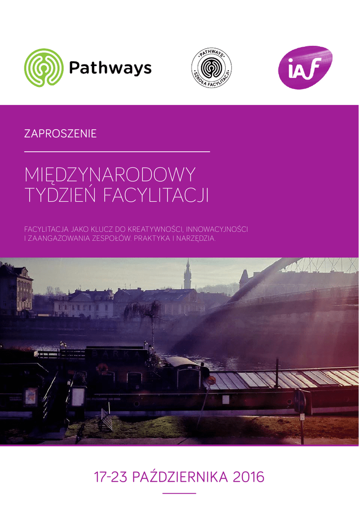 ZAPROSZENIE Międzynarodowy Tydzień Facylitacji Facylitacja jako klucz do kreatywności, innowacyjności i zaangażowania zespołów. Praktyka i narzędzia. 17-23 października 2016 czym jest? Międzynarodowy Tydzień Facylitacji Międzynarodowy Tydzień Facylitacji Tydzień Facylitacji to międzynarodowa inicjatywa The International Association of Facilitators – organizacji działającej w 65 krajach świata na rzecz budowania sieci facylitatorów i promowania idei facylitacji. W Polsce odbędzie się już po raz drugi, w dniach 17-23 października 2016 roku, a Pathways będzie współorganizatorem wydarzeń z tym związanych. Plan tegorocznych wydarzeń zakłada prowadzenie działań w Krakowie i Poznaniu. 1 KORZYŚCI Międzynarodowy Tydzień Facylitacji JAKIE SĄ KORZYŚCI Z TYGODNIA FACYLITACJI I SAMEJ FACYLITACJI? • To wydarzenie niekomercyjne, które we współczesnym społeczeństwie promuje takie wartości jak współpraca i współdziałanie, otwartość, szacunek, empatia, uważność i różnorodność–pomaga budować podstawy współczesnego społeczeństwa obywatelskiego, kształtuje postawy dojrzałej współpracy a nie rywalizacji • To czas dla wszystkich tych, którzy są zainteresowani rozwojem siebie i swoich kompetencji albo poszukują nowego wyzwania lub profesji–pomaga nauczyć się a czasem także doświadczyć czegoś nowego, jest inspiracją do działania albo zmiany • To okazja do promocji mało jeszcze znanego ale dającego się szeroko zastosować podejścia do pracy różnych grup, od biznesu aż po działania społeczne • Ponadto to okazja do pokazania, że dzięki facylitacji można efektywnie pracować z grupą ludzi bez uciekania się do manipulacji lub do rozwiązań narzucanych z góry • Wydarzenia w ramach Tygodnia Facylitacji pokazują także dziesiątki przykładów i sposobów na skuteczną i jednocześnie budująca zaangażowanie pracę w biznesie • Ponadto sama facylitacja, to odpowiedź na koszmar korporacji – długie i nieefektywne spotkania. Stosując zasady facylitacji spotkania mogą być krótsze, może ich być mniej i jednocześnie przynoszą rezultaty 2 kraków Szkoła Facylitacji PATHWAYS Barka ALRINA , Bulwar Kurlandzki SZCZEGÓŁOWY PROGRAM 17. X. 2016 9:30 Przywitanie i wprowadzenie: Kim my jesteśmy? Cele i program MTF w Krakowie i w Polsce Dorota Ostoja-Zawadzka, Maria Kołodziejczyk 09:45-11:35 3 kroki w facylitacji grupy; Facylitacja w różnych rolach zawodowych Dorota Ostoja-Zawadzka, Maria Kołodziejczyk 11:35 - 11:50 PRZERWA na KAWĘ 11:50-13:00 Umiejętności facylitatora, standardy IAF oraz praktyczne umiejętności Dorota Ostoja-Zawadzka, Maria Kołodziejczyk 13:00-13:45 LUNCH 13:45-17:00 Facylitacja w praktyce; Szkoła Facylitacji Dorota Ostoja-Zawadzka, Maria Kołodziejczyk; Absolwenci Szkoły 3 kraków Szkoła Facylitacji PATHWAYS Barka ALRINA, Bulwar Kurlandzki SZCZEGÓŁOWY PROGRAM 18. X. 2016 09:30-11:15 Przegląd narzędzi facylitatora Dorota Ostoja-Zawadzka, Maria Kołodziejczyk 09:45-11:15 Talenty i mocne strony Dominik Juszczyk, Manager w Making Waves, Gallup coach 11:30-14:30 Facylitacja procesu strategicznego Agnieszka Sokołowska, Matrik 14:30-14:50 LUNCH 14:50-16:15 Metody kreatywne wspierające pracę facylitacyjną Katarzyna Romanowicz facylitatorka Pathways 16:30-17:30 Clean language , case study z procesów facylitacji, narzędzia facylitacji a narzędzia design thinking, narzędzia coachingu grupowego Agnieszka Marlińska 17:30-18:00 Wnioski z wyników badań kompetencji uczestników Szkoły Facylitacji Pathways prowadzonych przez Instytut Psychologii Stosowanej UJ w Krakowie Katarzyna Popiel, Instytut Psychologii Stosowanej UJ 18:00 Szkoła Facylitacji - pytania, loteria wizytówkowa Dorota Ostoja-Zawadzka, Maria Kołodziejczyk 4 kraków + poznań SZCZEGÓŁOWY PROGRAM 19. X. 2016 18:00-19:30 ProReal - Webinar 5 poznań Centrum Kultury ZAMEK ul. Św. Marcin 80/82 SZCZEGÓŁOWY PROGRAM 20. X. 2016 17:00-17:15 Wprowadzenie: Kim my jesteśmy? Cele i program MTF W Poznaniu i w Polsce Tomasz Kanton 17:15-19:15 Różne oblicza facylitacji (odkodowujemy facylitację): Zastosowanie facylitacji z perspektywy menedżera, trenera, coacha i mediatora Iwona Poczobut, Karolina Gierszewska, Agnieszka Marlińska 19:00-20:00 Kompetencje facylitatora: Czym jest facylitacja? Jaka jest rola facylitatora? Tomasz Kanton 6 poznań Centrum Kultury ZAMEK ul. Św. Marcin 80/82 SZCZEGÓŁOWY PROGRAM 21. X. 2016 12:00-12:30 Wprowadzenie: Poznajmy się, zasady pracy Iwona Poczobut, Karolina Gierszewska 12:30-14:00 Narzędzia facylitacyjne w praktyce, cz. 1: Jakich narzędzi i w jaki sposób używa w swojej pracy facylitator? Iwona Poczobut, Karolina Gierszewska, Agnieszka Marlińska, Tomasz Kanton i Dariusz Paluch 14:00-14:30 Facylitacja przy kawie - wymiana wizytówek 14:30-16:00 Narzędzia facylitacyjne w praktyce, cz. 2: Jakich narzędzi i w jaki sposób używa w swojej pracy facylitator? Iwona Poczobut, Karolina Gierszewska, Agnieszka Marlińska, Tomasz Kanton i Dariusz Paluch 16:00-16:30 Facylitacja przy kawie - loteria wizytówkowa 16:30-18:30 Wszystko, co chcielibyście wiedzieć o facylitacji ale jeszcze nigdy nikogo nie zapytaliście Iwona Poczobut, Karolina Gierszewska, Agnieszka Marlińska, Tomasz Kanton i Dariusz Paluch 7 Dorota Ostoja-Zawadzka Jest założycielką i Prezes firmy Pathways Polska od 1999. Przyczyniła się do rozwoju biznesowego firmy, budowała portfel klientów, projektowała i realizowała kluczowe programy szkoleniowe. Zdobyła tytuł magistra psychologii na Uniwersytecie Jagiellońskim. Posiada certyfikat ukończenia Studium Zarządzania i Biznesu przy Zakładzie Ekonomii Stosowanej na Uniwersytecie Jagiellońskim. Ukończyła także studium Zarządzania Projektami Społecznymi w Biznesie w Wyższej Szkole Europejskiej im. Józefa Tischnera. Obecnie prowadzi zajęcia dla studentów Instytutu Psychologii Stosowanej UJ w ramach przedmiotu „Przywództwo w Organizacji”. W 2012 rok