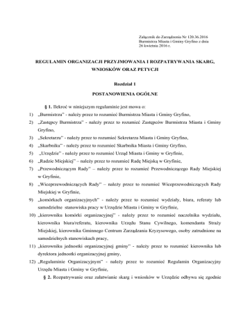 Załącznik do Zarządzenia Nr 120.36.2016 Burmistrza Miasta i Gminy Gryfino z dnia 26 kwietnia 2016 r. REGULAMIN ORGANIZACJI PRZYJMOWANIA I ROZPATRYWANIA SKARG, WNIOSKÓW ORAZ PETYCJI Rozdział 1 POSTANOWIENIA OGÓLNE § 1. Ilekroć w niniejszym regulaminie jest mowa o: 1) „Burmistrzu” - należy przez to rozumieć Burmistrza Miasta i Gminy Gryfino, 2) „Zastępcy Burmistrza” - należy przez to rozumieć Zastępców Burmistrza Miasta i Gminy Gryfino, 3) „Sekretarzu” - należy przez to rozumieć Sekretarza Miasta i Gminy Gryfino, 4) „Skarbniku” - należy przez to rozumieć Skarbnika Miasta i Gminy Gryfino, 5) „Urzędzie” - należy przez to rozumieć Urząd Miasta i Gminy w Gryfinie, 6) „Radzie Miejskiej” – należy przez to rozumieć Radę Miejską w Gryfinie, 7) „Przewodniczącym Rady” – należy przez to rozumieć Przewodniczącego Rady Miejskiej w Gryfinie, 8) „Wiceprzewodniczących Rady” – należy przez to rozumieć Wiceprzewodniczących Rady Miejskiej w Gryfinie, 9) „komórkach organizacyjnych” - należy przez to rozumieć wydziały, biura, referaty lub samodzielne stanowiska pracy w Urzędzie Miasta i Gminy w Gryfinie, 10) „kierowniku komórki organizacyjnej” - należy przez to rozumieć naczelnika wydziału, kierownika biura/referatu, kierownika Urzędu Stanu Cywilnego, komendanta Straży Miejskiej, kierownika Gminnego Centrum Zarządzania Kryzysowego, osoby zatrudnione na samodzielnych stanowiskach pracy, 11) „kierowniku jednostki organizacyjnej gminy” - należy przez to rozumieć kierownika lub dyrektora jednostki organizacyjnej gminy, 12) „Regulaminie Organizacyjnym” - należy przez to rozumieć Regulamin Organizacyjny Urzędu Miasta i Gminy w Gryfinie, § 2. Rozpatrywanie oraz załatwianie skarg i wniosków w Urzędzie odbywa się zgodnie z przepisami Kodeksu postępowania administracyjnego – Działu VIII Skargi i wnioski (Dz. U. z 2016 r. poz. 23) oraz przepisami Rozporządzenia Rady Ministrów z dnia 8 stycznia 2002 r. w sprawie organizacji przyjmowania i rozpatrywania skarg i wniosków (Dz. U. Nr 5, poz. 46). § 3. Przedmiotem skargi może być w szczególności zaniedbanie lub nienależyte wykonywanie zadań przez właściwe organy albo przez ich pracowników, naruszenie praworządności lub interesów skarżących, a także przewlekłe lub biurokratyczne załatwianie spraw. § 4. Przedmiotem wniosku mogą być w szczególności sprawy ulepszenia organizacji, wzmocnienia praworządności, usprawnienia pracy i zapobiegania nadużyciom, ochrony własności, lepszego zaspokajania potrzeb ludności. § 5. Rozpatrywanie petycji w Urzędzie odbywa się zgodnie z przepisami ustawy z dnia 11 lipca 2014 r. o petycjach (Dz. U. z 2014 r. poz. 1195), a w zakresie nieuregulowanym w ustawie, zgodnie z przepisami ustawy z dnia 14 czerwca 1960 r. Kodeks postępowania administracyjnego (Dz. U. z 2016 r. poz. 23). § 6. Przedmiotem petycji może być żądanie, w szczególności, zmiany przepisów prawa, podjęcia rozstrzygnięcia lub innego działania w sprawie dotyczącej podmiotu wnoszącego petycję, życia zbiorowego lub wartości wymagających szczególnej ochrony w imię dobra wspólnego, mieszczących się w zakresie zadań należących do właściwości Burmistrza. Rozdział 2 PRZYJMOWANIE I ROZPATRYWANIE SKARG I WNIOSKÓW KIEROWANYCH DO BURMISTRZA § 7. Wydział Organizacyjny koordynuje przyjmowanie i rozpatrywanie skarg i wniosków kierowanych do Burmistrza. § 8. 1. Skargi i wnioski mogą być wnoszone: 1) za pośrednictwem poczty, 2) składane osobiście w Biurze Obsługi Interesantów lub do skrzynki skarg i wniosków, 3) za pomocą faksu, 4) za pomocą poczty elektronicznej na adres [email protected], [email protected], 5) za pośrednictwem elektronicznej platformy usług administracji publicznej ePUAP, 6) ustnie do protokołu. 2. Skrzynka skarg i wniosków usytuowana jest w holu Urzędu. Opróżniana jest raz w tygodniu w obecności co najmniej dwóch pracowników Wydziału Organizacyjnego. 3. Wzór skargi lub wniosku stanowi załącznik nr 1 do niniejszego Regulaminu. 4. Wzór protokołu na okoliczność złożenia ustnej skargi/wniosku stanowi załącznik nr 2 do niniejszego Regulaminu. § 9. 1. Burmistrz i Zastępcy Burmistrza, przyjmują interesantów w sprawach skarg i wniosków w poniedziałki w godzinach od 15.00 do 17.00. 2. W przypadku, gdy dzień wyznaczony do przyjmowania w sprawach skarg i wniosków jest dniem wolnym od pracy, interesanci przyjmowani są w następnym dniu w godzinach od 15.00 do 16.00. 3. Sekretarz, Skarbnik, kierownicy komórek organizacyjnych oraz pracownicy przyjmują interesantów w sprawach skarg i wniosków codziennie w godzinach pracy. 4. Obsługę organizacyjno-protokolarną przyjęć interesantów w sprawach skarg i wniosków przez Burmistrza i Zastępców Burmistrza prowadzi pracownik Urzędu pełniący dyżur razem z Burmistrzem. 5. Informację o dniach i godzinach przyjęć interesantów w sprawach skarg i wniosków podaje się do publicznej wiadomości poprzez zamieszczenie na stronie Biuletynu Informacji Publicznej Urzędu Miasta i Gminy w Gryfinie, na tablicy ogłoszeń urzędu oraz w siedzibach jednostek organizacyjnych Gminy Gryfino. § 10. 1. Skargi i wnioski podlegają ewidencji w Centralnym Rejestrze Skarg i Wniosków. Ewidencja obejmuje wpis wszystkich skarg i wniosków kierowanych do Burmistrza, bez względu na formę i miejsce złożenia. 2. Centralny Rejestr Skarg i Wniosków prowadzi Wydział Organizacyjny. 3. Centralny Rejestr Skarg i Wniosków zawiera: 1) liczbę porządkową sprawy, 2) datę wpływu, 3) nazwisko i imię oraz adres wnoszącego sprawę, 4) zwięzły opis przedmiotu sprawy, 5) nazwę (symbol) komórki organizacyjnej/jednostki organizacyjnej gminy wskazanej do załatwienia, 6) obowiązujący termin załatwienia, 7) faktyczną datę załatwienia, 8) sposób załatwienia, 9) znak sprawy, imię i nazwisko pracownika odpowiedzialnego za załatwienie skargi lu