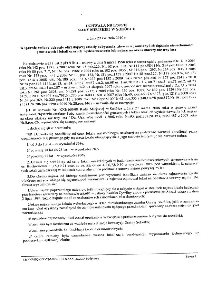 UCHWALA NR L/395/10 RADY MIEJSKIEJ W SOKÓLCE w sprawie zmiany uchwały określającej zasady nabywania, zbywania, zamiany i obciążania nieruchomości gruntowych i lokali oraz ich wydzierżawienia lub najmu na okres dłuższy niż trzy lata Na podstawie art. 18 ust.2 pkt.9 lit a - ustawy z dnia 8 marca 1990 roku o samorządzie gminnym /Dz. U. z 2001 roku Nr. 142 poz. 1591; z 2002 roku Nr. 23 poz.220, Nr. 62 poz. 558, Nr 113 poz.984 i Nr. 214 poz.1806; z 2003 roku Nr 80 poz. 717, Nr 162 poz. 1568; z 2004 roku nr. 102 poz. 1055 , Nr 116 poz. 1203, Nr 214 poz.1806; z 2005 roku Nr. 172 poz. 1441 z 2006 Nr 17, poz. 128, Nr.181 poz.1337 z 2007 Nr 48 poz.327, Nr.138 poz.974, Nr 173 poz. 1218 z2008 roku Nr.180 poz.1111,Nr.223 poz.1458 z 2009 roku Nr.52 poz.240 Nr.157 poz.1241 z2010 Nr.28 poz.142 i 146/,art.13, art.24, art.37, art.67 ust.2, art.68 ust.1,art.70 ust.2 i 3, art.71 ust.3, art.72 ust.2, art.73 ust.3, art.84 ust.3 i art.207 - ustawy z dnia 21 sierpnia 1997 roku o gospodarce nieruchomościami I Dz. U. z 2004 roku Nr. 261 poz. 2603, zm. Nr.281 poz. 2782; z 2005 roku Nr. 130 poz. 1087, Nr.169 poz. 1420 iNr 175 poz. 1459, z 2006 Nr. 104 poz.708,Nr.220 poz. 1600 i 1601 z 2007 roku Nr.69, poz,468 iNr.173, poz.1218 z 2008 roku Nr.59 poz.369, Nr.220 poz.1412 z 2009 roku Nr. 19,poz.100,Nr,42 poz.335 i 340,Nr.98 poz.817,Nr.161 poz.1279 i 1281,Nr.206 poz.1590 z 2010 Nr.28,poz.146 I - uchwala się co następuje: § l. W uchwale Nr. XXII160108 Rady Miejskiej w Sokółce z dnia 27 marca 2008 roku w sprawie zasad nabywania,zbywania,zamiany i obciążania nieruchomości gruntowych i lokali oraz ich wydzierżawiania lub najmu na okres dłuższy niż trzy lata I Dz. Urz. Woj. Podl. z 2008 roku Nr.90, poz.861,Nr.153, poz.1487 z 2009 roku Nr.8,poz.62/, wprowadza się następujące zmiany: l. dodaje się §8 w brzmieniu; "§8 l.Udziela się bonifikaty od ceny lokalu mieszkalnego, ustalonej na podstawie wartości określonej przez rzeczoznawcę majątkowego,gdy najemca lokalu ubiegający się o jego nabycie legitymuje się okresem najmu 1/ od 5 do 10 lat - w wysokości 50%; 21 powyżej 10 lat do 25 lat - w wysokości 70% 31 powyżej 25 lat - w wysokości 80~ 2..Udziela się bonifikaty od ceny lokali mieszkalnych w budynkach wielomieszkaniowych usytuowanych na os. Buchwałowo 11,15,19,21 oraz na os. Zielonym 4,5,6,7,8,9,10 w wysokości 90% pod warunkiem, iż najemcy tych lokali zamieszkują w lokalach komunalnych na podstawie umowy najmu powyżej 25 lat. 3.00 okresu najmu, od którego uzależniona jest wysokość bonifikaty zalicza się okres zajmowania lokalu o którego nabycie ubiega się najemca,pod warunkiem iż najemca zajmował lokal na podstawie umowy najmu. Do okresu tego zalicza się: 1/0kres najmu poprzedniego najemcy, jeśli ubiegający sie o nabycie wstąpił w stosunek najmu lokalu będącego przedmiotem sprzedaży na podstawie art.691 - ustawy Kodeks Cywilny albo na podstawie art.8 ust. 1 ustawy z dnia 2 lipca 1994 roku o najmie lokali mieszkaniowych i dodatkach mieszkaniowych; 2/0kres najmu innego lokalu wchodzącego w skład mieszkaniowego zasobu Gminy Sokółka, jeśli w zamian za ten inny lokal uzyskany został tytuł do zajmowania lokalu będącego przedmiotem sprzedaży na rzecz najemcy ;pod warunkiem,iż al uprzednio zajmowany lokal został opróżniony w związku z przeznaczeniem budynku do rozbiórki; bl zamiana była konieczna ze względu na realizacje inwestycji Gminy Sokółka; ci zamiana prowadziła do likwidacji lokali niesamodzielnych; dl celem zamiany była uzasadniona powierzchni użytkowej lokalu; zmiana lokalizacji, kondygnacji, wyposażenia technicznego lub el najemca lokalu i osoby uprawnione do wspólnego zamieszkiwania wyrazili chęć dokonania zamiany na dwa lokale z powodów rodzinnych lub społecznych pod warunkiem,że taka zamiana rozdzielała faktycznie funkcjonujące w dotychczas zajmowanym lokalu odrębne gospodarstwa domowe; fi najemcy dwóch lub większej liczby lokali wystąpili o zamianę lokali pomiędzy sobą, za uprzednią zgodą Zakładu Gospodarki Komunalnej i Mieszkaniowej w Sokółce; g/ okres najmu lokalu zakładowego,jeżeli został on przejęty na rzecz Gminy Sokółka i wchodzi w skład mieszkaniowego zasobu Gminy Sokółka; hl okres trwania umowy najmu zawartej z wstępnym, zstępnym, małżonkiem lub byłym małżonkiem najemcy ubiegającym się o nabycie lokalu, poprzedzającym najem zawarty z wnioskodawcą, pod warunkiem że wnioskodawca zamieszkiwał w lokalu co najmiej S lat; iloraz inne uzasadnione przypadki nie wymienione powyżej. 4.WysokoŚć bonifikaty obowiązuje w przypadku, gdy najemca przed zawarciem aktu notarialnego dokona jednorazowej zapłaty ceny i nie zalega z opłatami czynszowymi, chyba że przed zawarciem aktu notarialnego uiścił zaległy czynsz wraz z naliczonymi odsetkami za okres zwłoki. S.Ustalona bonifikata nie ma zastósowania do ceny gruntu w przypadku sprzedaży lokali mieszkalnych zlokalizowanych w domach, w których znajduje się mniej niż cztery lokale mieszkalne włącznie." § 2. Wykonanie Uchwały powierza się Burmistrzowi Sokółki § 3. Uchwała wchodzi w życie po upływie 14 dni od dnia ogłoszenia w Dzienniku Urzędowym Województwa Podlaskiego. F'RZEWODNlCZĄCY RADY r~J~JFJ c:;r,bł' (Jam'I';";! fon LO I.