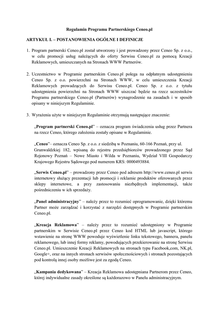 Regulamin Programu Partnerskiego Ceneo.pl ARTYKUŁ I. – POSTANOWIENIA OGÓLNE I DEFINICJE 1. Program partnerski Ceneo.pl został utworzony i jest prowadzony przez Ceneo Sp. z o.o., w celu promocji usług należących do oferty Serwisu Ceneo.pl za pomocą Kreacji Reklamowych, umieszczanych na Stronach WWW Partnerów. 2. Uczestnictwo w Programie partnerskim Ceneo.pl polega na odpłatnym udostępnieniu Ceneo Sp. z o.o. powierzchni na Stronach WWW, w celu umieszczenia Kreacji Reklamowych prowadzących do Serwisu Ceneo.pl. Ceneo Sp. z o.o. z tytułu udostępnienia powierzchni na Stronach WWW uiszczać będzie na rzecz uczestników Programu partnerskiego Ceneo.pl (Partnerów) wynagrodzenie na zasadach i w sposób opisany w niniejszym Regulaminie. 3. Wyrażenia użyte w niniejszym Regulaminie otrzymują następujące znaczenie: „Program partnerski Ceneo.pl” – oznacza program świadczenia usług przez Partnera na rzecz Ceneo, którego założenia zostały opisane w Regulaminie. „Ceneo”– oznacza Ceneo Sp. z o.o. z siedzibą w Poznaniu, 60-166 Poznań, przy ul. Grunwaldzkiej 182, wpisaną do rejestru przedsiębiorców prowadzonego przez Sąd Rejonowy Poznań – Nowe Miasto i Wilda w Poznaniu, Wydział VIII Gospodarczy Krajowego Rejestru Sądowego pod numerem KRS: 0000493884. „Serwis Ceneo.pl” – prowadzony przez Ceneo pod adresem http://www.ceneo.pl serwis internetowy służący prezentacji lub promocji i reklamie produktów oferowanych przez sklepy internetowe, a przy zastosowaniu niezbędnych implementacji, także pośredniczeniu w ich sprzedaży. „Panel administracyjny” – należy przez to rozumieć oprogramowanie, dzięki któremu Partner może zarządzać i korzystać z narzędzi dostępnych w Programie partnerskim Ceneo.pl. „Kreacja Reklamowa” – należy przez to rozumieć udostępniony w Programie partnerskim w Serwisie Ceneo.pl przez Ceneo kod HTML lub javascript, którego wstawienie na stronę WWW powoduje wyświetlenie linku tekstowego, bannera, panelu reklamowego, lub innej formy reklamy, powodujących przekierowanie na stronę Serwisu Ceneo.pl. Umieszczenie Kreacji Reklamowych na stronach typu Facebook,com, NK.pl, Google+, oraz na innych stronach serwisów społecznościowych i stronach pozostających pod kontrolą innej osoby możliwe jest za zgodą Ceneo. „Kampania dedykowana” – Kreacja Reklamowa udostępniana Partnerom przez Ceneo, której indywidualne zasady określone są każdorazowo w Panelu administracyjnym. „Kliknięcie” – należy przez to rozumieć świadome działanie osoby, nie będącej pod kontrolą Partnera, odwiedzającej Stronę WWW, polegające na aktywacji Kreacji Reklamowej w celu uruchomienia strony internetowej Serwisu Ceneo.pl zdefiniowanej w Kreacji Reklamowej. „Konwersja” – należy przez to rozumieć zdarzenie, proces lub akcję, która zachodzi po kliknięciu w Kreację Reklamową na stronie WWW Partnera i przekierowaniu Użytkownika Internetu do Serwisu Ceneo.pl, odbywające się przy jednoczesnym spełnieniu warunków przyznania prowizji Partnerowi określonych w Regulaminie. „Prowizja” – należy przez to rozumieć kwotę naliczaną Partnerowi przez Ceneo za pojedynczą Konwersję w Serwisie Ceneo.pl. „Wynagrodzenie” – należy przez to rozumieć sumę Prowizji przyznaną Partnerowi przez Ceneo na zasadach określonych w Regulaminie. „Partner” – należy przez to rozumieć osobę, która przystąpiła do Programu partnerskiego Ceneo.pl, z którą Ceneo zawarła umowę odpłatnego udostępnienia powierzchni na Stronie WWW na zasadach określonych Regulaminem. Partnerem Programu partnerskiego nie może być Sklep Internetowy, który zawarł z Ceneo umowę w oparciu o Regulamin Współpracy z Serwisem Ceneo. „Umowa” – należy przez to rozumieć stosunek prawny jaki powstaje między Ceneo a Partnerem w ramach niniejszego Regulaminu. „Strona WWW” – należy przez to rozumieć stronę internetową Partnera, na której ma zostać wstawiona lub została wstawiona Kreacja Reklamowa. W celu uniknięcia wątpliwości, stroną internetową Partnera, nie jest strona internetowa pozostająca pod kontrolą innej osoby, a także utworzony przez Partnera bądź osobę trzecią profil w serwisach społecznościowych typu: Facebook.com, NK.pl, Google+. „API” – oznacza odrębnie określoną usługę, polegającą na udostępnieniu Partnerowi zestawu funkcji umożliwiających pobieranie informacji dotyczących Serwisu Ceneo.pl, mających na celu tworzenie przez Partnerów indywidualnych form reklamowych. Postanowienia niniejszego Regulaminu dotyczące Kreacji Reklamowych stosuje się odpowiednio do indywidualnych form reklamowych przygotowywanych przez Partnerów. „Regulamin” – niniejszy „Regulamin Programu Partnerskiego Ceneo.pl”. ARTYKUŁ II. – ZASADY UCZESTNICTWA W PROGRAMIE PARTNERSKIM CENEO.PL 1. Uczestnikiem Programu partnerskiego Ceneo.pl (Partnerem) może zostać pełnoletnia osoba fizyczna bądź osoba prawna lub jednostka organizacyjna nieposiadająca osobowości prawnej, której przysługują prawa do Strony WWW, a która przystąpi do Programu partnerskiego Ceneo.pl poprzez zarejestrowanie się i założenie konta na stronie http://partnerzy.ceneo.pl. 2. Partner może mieć tylko jedno konto w Programie partnerskim Ceneo.pl bez względu na liczbę Stron WWW, na których Ceneo udostępnia powierzchnię. W przypadku Partnerów, będących osobami fizycznymi prowadzącymi działalność gospodarczą – dopuszczalne jest posiadanie dwóch kont, z których jedno konto dotyczyć będzie Stron WWW związanych z działalnością gospodarczą Partnera, a drugie konto związane będzie ze Stronami WWW nie związanymi z działalnością gospodarczą Partnera. Dla każdego z takich dwóch kont przewidziana jest odrębna rejestracja. Niedopuszczalne jest zakładanie kont w Programie partnerskim Ceneo.pl, bez zgody Ceneo, jeśli uprzednio Umowa została rozwiązana przez Ceneo z winy Part
