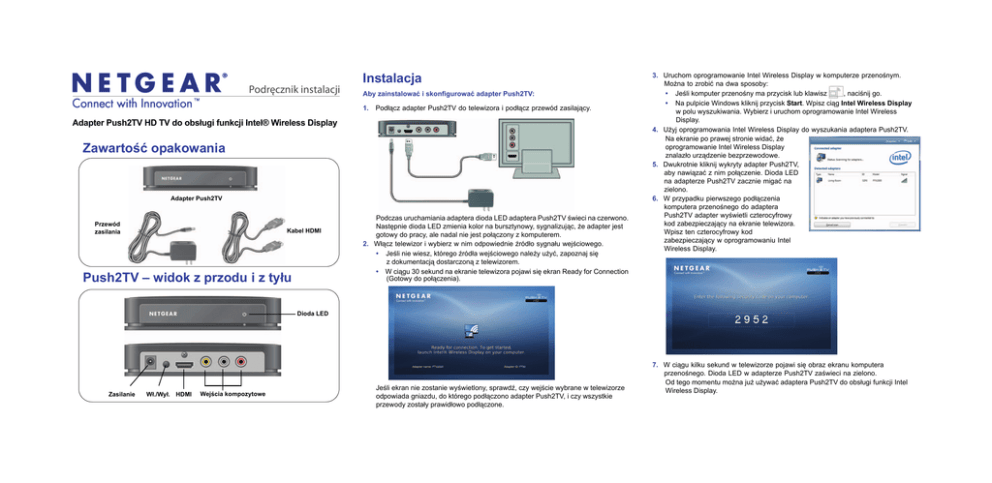 Instalacja Podręcznik instalacji Aby zainstalować i skonfigurować adapter Push2TV: 1. Podłącz adapter Push2TV do telewizora i podłącz przewód zasilający. Adapter Push2TV HD TV do obsługi funkcji Intel® Wireless Display Zawartość opakowania Adapter Push2TV Przewód zasilania Kabel HDMI Push2TV – widok z przodu i z tyłu Podczas uruchamiania adaptera dioda LED adaptera Push2TV świeci na czerwono. Następnie dioda LED zmienia kolor na bursztynowy, sygnalizując, że adapter jest gotowy do pracy, ale nadal nie jest połączony z komputerem. 2. Włącz telewizor i wybierz w nim odpowiednie źródło sygnału wejściowego. • Jeśli nie wiesz, którego źródła wejściowego należy użyć, zapoznaj się z dokumentacją dostarczoną z telewizorem. • W ciągu 30 sekund na ekranie telewizora pojawi się ekran Ready for Connection (Gotowy do połączenia). 3. Uruchom oprogramowanie Intel Wireless Display w komputerze przenośnym. Można to zrobić na dwa sposoby: • Jeśli komputer przenośny ma przycisk lub klawisz , naciśnij go. • Na pulpicie Windows kliknij przycisk Start. Wpisz ciąg Intel Wireless Display w polu wyszukiwania. Wybierz i uruchom oprogramowanie Intel Wireless Display. 4. Użyj oprogramowania Intel Wireless Display do wyszukania adaptera Push2TV. Na ekranie po prawej stronie widać, że oprogramowanie Intel Wireless Display znalazło urządzenie bezprzewodowe. 5. Dwukrotnie kliknij wykryty adapter Push2TV, aby nawiązać z nim połączenie. Dioda LED na adapterze Push2TV zacznie migać na zielono. 6. W przypadku pierwszego podłączenia komputera przenośnego do adaptera Push2TV adapter wyświetli czterocyfrowy kod zabezpieczający na ekranie telewizora. Wpisz ten czterocyfrowy kod zabezpieczający w oprogramowaniu Intel Wireless Display. Dioda LED Zasilanie Wł./Wył. HDMI Wejścia kompozytowe Jeśli ekran nie zostanie wyświetlony, sprawdź, czy wejście wybrane w telewizorze odpowiada gniazdu, do którego podłączono adapter Push2TV, i czy wszystkie przewody zostały prawidłowo podłączone. 7. W ciągu kilku sekund w telewizorze pojawi się obraz ekranu komputera przenośnego. Dioda LED w adapterze Push2TV zaświeci na zielono. Od tego momentu można już używać adaptera Push2TV do obsługi funkcji Intel Wireless Display. Regulacja ekranu telewizora Użytkownik może wyregulować obraz wyświetlany na ekranie telewizora. • Aby zmienić sposób dopasowania obrazu do ekranu telewizora, kliknij przycisk Properties (Właściwości) w oprogramowaniu Intel Wireless Display. Następnie kliknij przycisk Resize TV picture (Zmień rozmiar obrazu w telewizorze) i wyreguluj obraz za pomocą symboli plusa i minusa. • Aby usunąć czarne pasy widoczne na bokach ekranu telewizora, otwórz okno właściwości karty graficznej i zmień rozdzielczość na 1280x720 pikseli. Może to spowodować wyświetlenie czarnych pasów w komputerze przenośnym. Jeśli chcesz się ich pozbyć, otwórz okno właściwości karty graficznej i usuń zaznaczenie opcji Zachowaj współczynnik proporcji. Często zadawane pytania 1. 2. 3. 4. 5. Czy można wyświetlać materiały w telewizorze i jednocześnie używać komputera przenośnego do innych zadań? Tak, ale trzeba zmienić ustawienie wyświetlania ekranu na tryb rozszerzonego pulpitu. Czy można zamknąć pokrywę komputera przenośnego podczas używania funkcji Intel Wireless Display? Zamknięcie pokrywy komputera przenośnego może wprowadzić komputer w tryb uśpienia lub spowodować jego zamknięcie, a to doprowadziłoby do przerwania połączenia. Aby zmienić taki stan rzeczy, na pulpicie Windows wybierz kolejno opcje Start > Wyszukaj, wpisz ciąg zamykanie pokrywy w polu wyszukiwania i zmień ustawienia (wybierz opcję nie rób nic). Dlaczego nie można odtwarzać niektórych płyt DVD i Blu-ray? Wiele płyt zawiera mechanizmy zabezpieczenia przed kopiowaniem, które uniemożliwiają odtwarzanie zawartości przez oprogramowanie Intel Wireless Display w wersji wcześniejszej niż 2.1.0.0. Materiały utworzone i nagrane przez użytkownika będzie można odtwarzać. Czy można wyłączyć dźwięk w komputerze przenośnym i nadal oglądać filmy z dźwiękiem? Tak. Dźwięk multimediów będzie odtwarzany w telewizorze, nawet jeśli w komputerze przenośnym wyłączono dźwięk. Dlaczego tekst i elementy graficzne są nieostre lub rozmyte na ekranie telewizora? W przypadku używania przewodu kompozytowego czytelność tekstu i niektórych elementów graficznych może być mniejsza. Jednak nie powinno być większych problemów z oglądaniem filmów. Najlepszą jakość obrazu zapewni telewizor HD. Listopad 2010 6. Z jakimi routerami bezprzewodowymi jest zgodna funkcja Intel Wireless Display? Jeśli używasz sieci bezprzewodowej działającej w paśmie 5 GHz, funkcja Intel Wireless Display będzie współpracować tylko z oprogramowaniem Wireless WiFi Software w wersji 14.0 lub nowszym. Funkcja Intel Wireless Display jest zgodna z wszystkimi routerami Wi-Fi obsługującymi pasmo 2,4 GHz. Jeśli router obsługuje oba pasma (2,4 i 5 GHz), a użytkownik używa wcześniejszej wersji oprogramowanie, należy podłączyć komputer przenośny do sieci bezprzewodowej działającej w paśmie 2,4 GHz. 7. Jak wyeliminować opóźnienia reakcji kursora? Nie można tego zmienić. Można jednak wyłączyć wyświetlanie kursora w telewizorze i używać komputera przenośnego do obsługi funkcji. Aby to zrobić, podłącz się do adaptera i kliknij Properties (Właściwości). 8. Co należy zrobić, jeśli pojawia się ostrzeżenie o zabezpieczeniach wygenerowane przez Zaporę systemu Windows? Na pulpicie Windows wybierz kolejno opcje Start > Wyszukaj i wpisz w polu wyszukiwania ciąg Zezwalaj programowi na dostęp przez Zaporę systemu Windows. Dodaj pozycje WiDiApp i Wireless PAN DHCP Server do listy dozwolonych programów. Zaznacz pola wyboru prywatny i publiczny. Jeśli nie używasz Zapory systemu Windows, zapoznaj się instrukcją o