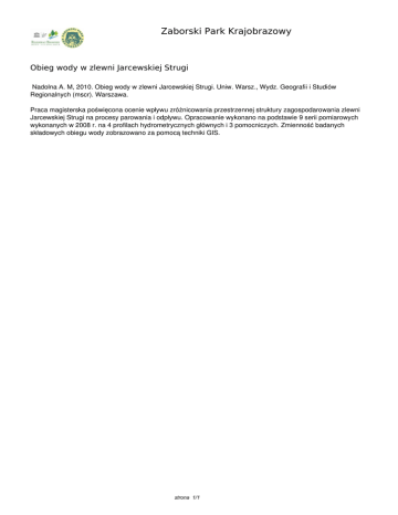 Zaborski Park Krajobrazowy Obieg wody w zlewni Jarcewskiej Strugi Nadolna A. M, 2010. Obieg wody w zlewni Jarcewskiej Strugi. Uniw. Warsz., Wydz. Geografii i Studiów Regionalnych (mscr). Warszawa. Praca magisterska poświęcona ocenie wpływu zróżnicowania przestrzennej struktury zagospodarowania zlewni Jarcewskiej Strugi na procesy parowania i odpływu. Opracowanie wykonano na podstawie 9 serii pomiarowych wykonanych w 2008 r. na 4 profilach hydrometrycznych głównych i 3 pomocniczych. Zmienność badanych składowych obiegu wody zobrazowano za pomocą techniki GIS. strona 1/1 Powered by TCPDF (www.tcpdf.org)