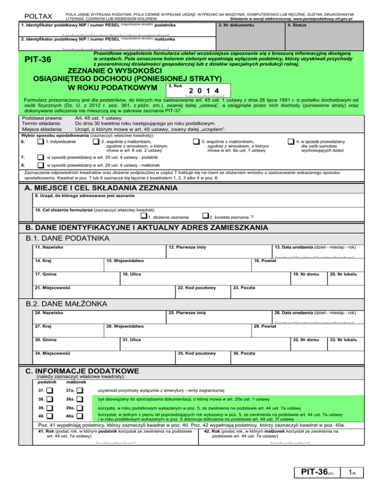 POLA JASNE WYPEŁNIA PODATNIK, POLA CIEMNE WYPEŁNIA URZĄD. WYPEŁNIĆ NA MASZYNIE, KOMPUTEROWO LUB RĘCZNIE, DUŻYMI, DRUKOWANYMI LITERAMI, CZARNYM LUB NIEBIESKIM KOLOREM. Składanie w wersji elektronicznej: www.portalpodatkowy.mf.gov.pl POLTAX 1. Identyfikator podatkowy NIP / numer PESEL (niepotrzebne skreślić) podatnika 3. Nr dokumentu └────┴────┴────┴────┴────┴────┴────┴────┴────┴────┴────┘ 2. Identyfikator podatkowy NIP / numer PESEL (niepotrzebne skreślić) małżonka 4. Status . └────┴────┴────┴────┴────┴────┴────┴────┴────┴────┴────┘ Prawidłowe wypełnienie formularza ułatwi wcześniejsze zapoznanie się z broszurą informacyjną dostępną w urzędach. Pola oznaczone kolorem zielonym wypełniają wyłącznie podatnicy, którzy uzyskiwali przychody z pozarolniczej działalności gospodarczej lub z działów specjalnych produkcji rolnej. PIT-36 ZEZNANIE O WYSOKOŚCI OSIĄGNIĘTEGO DOCHODU (PONIESIONEJ STRATY) W ROKU PODATKOWYM 5. Rok 2 0 1 4 └────┴────┴────┴────┘ Formularz przeznaczony jest dla podatników, do których ma zastosowanie art. 45 ust. 1 ustawy z dnia 26 lipca 1991 r. o podatku dochodowym od osób fizycznych (Dz. U. z 2012 r. poz. 361, z późn. zm.), zwanej dalej ustawą”, a osiągnięte przez nich dochody (poniesione straty) oraz ” dokonywane odliczenia nie mieszczą się w zakresie zeznania PIT-37. Podstawa prawna: Termin składania: Miejsce składania: Art. 45 ust. 1 ustawy. Do dnia 30 kwietnia roku następującego po roku podatkowym. Urząd, o którym mowa w art. 45 ustawy, zwany dalej urzędem”. ” Wybór sposobu opodatkowania (zaznaczyć właściwe kwadraty): 6. 1. indywidualnie wspólnie z małżonkiem, 2. zgodnie z wnioskiem, o którym 7. w sposób przewidziany w art. 29 ust. 4 ustawy - małżonek z małżonkiem, 3. wspólnie zgodnie z wnioskiem, o którym mowa w art. 6 ust. 2 ustawy 8. przewidziany 4. wdlasposób osób samotnie mowa w art. 6a ust. 1 ustawy wychowujących dzieci w sposób przewidziany w art. 29 ust. 4 ustawy - podatnik Zaznaczenie odpowiednich kwadratów oraz złożenie podpisu(ów) w części T traktuje się na równi ze złożeniem wniosku o zastosowanie wskazanego sposobu opodatkowania. Kwadrat w poz. 7 lub 8 zaznacza się łącznie z kwadratem 1, 2, 3 albo 4 w poz. 6. A. MIEJSCE I CEL SKŁADANIA ZEZNANIA 9. Urząd, do którego adresowane jest zeznanie 10. Cel złożenia formularza (zaznaczyć właściwy kwadrat): 1. złożenie zeznania 2. korekta zeznania 1) B. DANE IDENTYFIKACYJNE I AKTUALNY ADRES ZAMIESZKANIA B.1. DANE PODATNIKA 11. Nazwisko 12. Pierwsze imię 14. Kraj └────┴────┘-└────┴────┘-└────┴────┴────┴────┘ 15. Województwo 17. Gmina 13. Data urodzenia (dzień - miesiąc - rok) 16. Powiat 18. Ulica 21. Miejscowość 19. Nr domu 22. Kod pocztowy 20. Nr lokalu 23. Poczta B.2. DANE MAŁŻONKA 24. Nazwisko 25. Pierwsze imię 27. Kraj └────┴────┘-└────┴────┘-└────┴────┴────┴────┘ 28. Województwo 30. Gmina 26. Data urodzenia (dzień - miesiąc - rok) 29. Powiat 31. Ulica 34. Miejscowość 32. Nr domu 35. Kod pocztowy 33. Nr lokalu 36. Poczta C. INFORMACJE DODATKOWE (należy zaznaczyć właściwe kwadraty): podatnik małżonek 37. 39. 40. 37a. uzyskiwał przychody wyłącznie z emerytury - renty zagranicznej 38. 38a. był obowiązany do sporządzania dokumentacji, o której mowa w art. 25a ust. 1 ustawy 39a. 40a. korzysta, w roku podatkowym wykazanym w poz. 5, ze zwolnienia na podstawie art. 44 ust. 7a ustawy korzystał, w jednym z pięciu lat poprzedzających rok wykazany w poz. 5, ze zwolnienia na podstawie art. 44 ust. 7a ustawy i w roku podatkowym wykazanym w poz. 5 dokonuje doliczenia na podstawie art. 44 ust. 7f ustawy Poz. 41 wypełniają podatnicy, którzy zaznaczyli kwadrat w poz. 40. Poz. 42 wypełniają podatnicy, którzy zaznaczyli kwadrat w poz. 40a. 41. Rok (podać rok, w którym podatnik korzystał ze zwolnienia na podstawie art. 44 ust. 7a ustawy) └────┴────┴────┴────┘ 42. Rok (podać rok, w którym małżonek korzystał ze zwolnienia na podstawie art. 44 ust. 7a ustawy) └────┴────┴────┴────┘ PIT-36 (20) 1/6 POLA JASNE WYPEŁNIA PODATNIK, POLA CIEMNE WYPEŁNIA URZĄD. WYPEŁNIĆ NA MASZYNIE, KOMPUTEROWO LUB RĘCZNIE, DUŻYMI, DRUKOWANYMI LITERAMI, CZARNYM LUB NIEBIESKIM KOLOREM. Składanie w wersji elektronicznej: www.portalpodatkowy.mf.gov.pl POLTAX D. DOCHODY / STRATY ZE ŹRÓDEŁ PRZYCHODÓW D.1. DOCHODY I STRATY PODATNIKA Źródła przychodów Przychód a b zł, 1. Należności ze stosunku: pracy, służbowego, spółdzielczego i z pracy nakładczej, a także zasiłki pieniężne z ubezpieczenia społecznego wypłacone przez zakład pracy 43. W poz. 48 należy wykazać przychody, do których w poz. 49 podatnik stosuje 50% koszty uzyskania przychodów na podstawie art. 22 ust. 9 pkt 3 ustawy. 2. Emerytury - renty oraz inne krajowe świadczenia, o których mowa w art. 34 ust.7 ustawy 3. Pozarolnicza działalność gospodarcza 48. Koszty uzyskania przychodów gr zł, zł, gr c Strata 2) (c - b) gr zł, d 44. , Dochód 2) (b - c) gr Należna zaliczka, w tym zaliczka pobrana przez płatnika e 45. f 46. 47. , 49. , , 50. , , 51. , 53. 52. , 54. 55. 56. 57. , 58. Poz. 58 wypełniają podatnicy, którzy zaznaczyli kwadrat w poz. 39. , 4. Działy specjalne produkcji rolnej 59. 5. Działalność wykonywana osobiście, o której mowa w art. 13 ustawy (w tym umowy o dzieło i zlecenia) 64. 6. Najem lub dzierżawa 69. 7. Prawa autorskie i inne prawa, o których mowa w art. 18 ustawy 74. W poz. 79 należy 