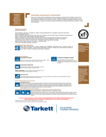Wykładziny Linoleum Instrukcja czyszczenia i konserwacji Veneto xf2 Silencio xf2 Style Elle xf2 Style Emme xf2 Allegro xf2 Etrusco xf2 Conductive/SD Nowoczesne metody codziennej pielęgnacji podłogi zmierzają do zmniejszenia ilości zabiegów czyszczenia na mokro poprzez zastąpienie ich czyszczeniem na sucho. Przykładem mogą być coraz częściej używane w tym celu odpowiednio zaimpregnowane mopy oraz maszyny. Dzięki nim praca ekip sprzątających jest dużo prostsza, bardziej efektywna, a wpływ na środowisko naturalne zminimalizowany. Mała ilość albo brak chemikaliów i czysta woda, wystarczą. Wskazówki ogólne Czyszczenie codzienne Czyść wykładzinę regularnie, ze względu na higienę i większą efektywność niż w przypadku czyszczenia okresowego. Zawsze przestrzegaj instrukcji Plamy z wykładziny należy natychmiast zetrzeć zaraz po ich pojawieniu się, ponieważ mogą one przebarwić jej powierzchnię. Niektóre rozpuszczalniki mogą uszkodzić wykładziny elastyczne Kółka z czarnej gumy lub gumowe zakończenia nóg mebli i sprzętów mogą spowodować odbarwienie wykładziny. Podkładki pod meble, stopy krzeseł powinny być wyposażone w miękkie podkładki lub wykonane z poliuretanu, zabezpieczając przed szorstkim powierzchniami i krawędziami które mogą uszkodzić podłogę. Należy stosować kółka krzeseł typu "W" zgodne z normą EN 12529. Jasne kolory wymagają częstszego czyszczenia. Zapobieganie zabrudzeniom Około 80% zanieczyszczeń, na które narażona jest wykładzina, przynoszone jest z zewnątrz. Można to zminimalizować, stosując matę wejściową odpowiednich rozmiarów. Mniejsza ilość zanieczyszczeń dostająca się przez wejście zmniejsza wymagania konserwacyjne wykładziny. Grupa produktów Linoleum to niezwykła oferta produktów, które cechuje unikalna powierzchnia pokryta bardzo twardym poliuretnem xf. Czyszczenie codzienne Czyszczenie na sucho Czyszczenie wilgotnym mopem Usuń kurz i brud przy pomocy suchego mopa z włókna lub mikrofibry. Można użyć również szczotki z miękkim, delikatnym włosiem. LUB Użyj mopa delikatnie zwilżonego wodą lub/i detergentem aby woda nie zostawiała na wykładzinie widocznego śladu. Podłoga powinna być sucha po 15-20 sekundach. Czyszczenie maszynowe By osiągnąć dobre rezultaty, należy czyścić podłogę przy użyciu maszyny czyszcząco-suszącej i szczotek lub pada. Środki czyszczące: Używaj neutralnego środka czyszczącego o pH 5-9 Uwaga! Zawsze stosuj się do zaleceń podanych na instrukcji . Usuwanie plam Plamy należy usuwać natychmiast. Czyścić miejscowo ręcznie za pomocą białego/czerwonego pada i neutralnego detergentu (nie należy używać rozpuszczalników). Następnie zmyć czystą wodą. Konserwacja/czyszczenie okresowe NIE MA KONIECZNOŚCI AKRYLOWANIA PODŁOGI ! Polerowanie na sucho: Gdy widoczne staną się oznaki zużycia, najbardziej efektywnym sposobem przywrócenia pierwotnego wyglądu powierzchni wykładziny jest polerowanie na sucho. Najlepiej przystąpić do polerowania na sucho zaraz po czyszczeniu maszynowym wykładziny. Polerowanie na sucho ogranicza ponowne zabrudzenie się wykładziny. Dla osiągnięcia najlepszych rezultatów należy polerować wykładzinę z prędkością 500-1000 obrotów na minutę za pomocą białego lub beżowego pada. Im wyższa prędkość, tym większy połysk. Częstotliwość polerowania na sucho zależy od szybkości zużycia. By odrestaurować zużyte miejsca można użyć miejscowo środka pielęgnującego wraz z nadaniem połysku. W przypadku mocnego zabrudzenia wykładziny i widocznych śladów użytkowania Szorowanie maszynowe + odkurzanie na mokro + polerowanie na sucho Nanieść roztwór środka czyszczącego ( pH 10-11, rozcieńczonego z wodą) na powierzchnię wykładziny i odczekać 5-10 minut. Wyczyścić podłogę za pomocą jednotarczowej maszyny szorującej i pada. Natychmiast zebrać brudną wodę odkurzaczem. Następnie zmyć czystą wodą. Pozostawić wykładzinę do wyschnięcia, a następnie wypolerować na sucho zgodnie z instrukcją powyżej. Linoleum xf2 SD i Conductive: NIGDY NIE WOLNO KONSERWOWAĆ WYKŁADZIN PRĄDOPRZEWODZĄCYCH I PRĄDOROZPRASZAJĄCYCH ŻADNYMI POLIMERAMI BO STRCĄ SWOJE WŁAŚCIWOŚCI. W razie pytań prosimy o kontakt z lokalnym Przedstawicielem firmy Tarkett. Powyższe informacje mogą ulec zmianie w przypadku prac nad ulepszeniem produktu. Czyszczenie wstępne Zawsze chroń swoją podłogę przykrywając ją grubym papierem, twardą tekturą lub podobnym materiałem do czasu ukończenia budowy. Czyszczenie wstępne jest rekomendowane zawsze przed rozpoczęciem użytkowania podłogi środkiem okwasowości pH 3-5.
