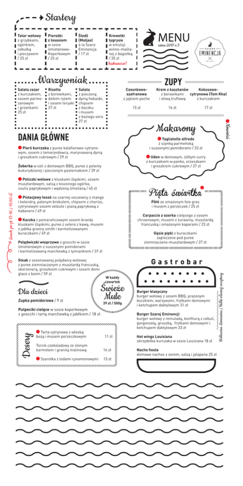 Startery Tatar wołowy z grzybkami, ogórkiem, cebulką i pieczywem / 25 zł Pierożki z łososiem w sosie śmietanowoKoperkowym / 25 zł Śledź (Matjas) à la Szara Eminencja / 17 zł MENU Krewetki tygrysie w emulsji winno-maślanej z bagietką / 35 zł zima 2017 v.3 habanero? Warzywniak Risotto z borowikami, dzikim ryżem i sosem teryaki 27 zł Czosnkowoszafranowa z jajkiem poche Sałata z pieczoną dynią hokaido, chipsem z boczku i musem z koziego sera 27 zł 15 zł Pâté ze smażonym foie gras i musem z porzeczek / 25 zł Carpaccio z ozorka cielęcego z sosem chrzanowym, musem z żurawiny, musztardą francuską i smażonymi kaparami / 23 zł Kaczka z pomarańczowym sosem brandy kluskami śląskimi, puree z selera z kawą, musem z jabłka granny smith i karmelizowanymi buraczkami / 49 zł Gęsie pipki z buraczkami zapieczone pod puree ziemniaczano-musztardowym / 27 zł Polędwiczki wieprzowe z gnocchi w sosie śmietanowym z suszonymi pomidorami i karmelizowaną marchewką z tymiankiem / 37 zł Gastrobar W każdy czwartek Świeże Mule 39 zł / 500g Pulpeciki cielęce w sosie koperkowym z gnocchi i tartą marchewką z jabłkiem / 18 zł Desery Lunch pn-pt 13-16 / 19,90 zł Piąta ćwiartka Pistacjowy łosoś na czarnej soczewicy z mango i kolendrą, palonym brokułem, chipsem z chorizo, cytrynowym sosem veloute i pianą paprykową z habanero / 49 zł Tarta cytrynowa z włoską bezą i musem porzeczkowym Torcik czekoladowy ze słonym karmelem i granitą malinową Szarotka z lodami cynamonowymi Nowości Udon w domowym, żółtym curry z kurczakiem w panko, orzeszkami i groszkiem cukrowym / 27 zł Policzki wołowe z kluskami śląskimi, sosem musztardowym, salsą z kiszonego ogórka, coulis paprykowym i wędzoną śmietaną / 45 zł Zupka pomidorowa / 9 zł 17 zł Tagliatelle alfredo z szynką parmeńską i suszonymi pomidorami / 33 zł Żeberka w coli z domowym BBQ, puree z polenty kukurydzianej i pieczonym pasternakiem / 39 zł Dla dzieci 16 zł Makarony Pierś kurczaka z puree kalafiorowo-cytrynowym, sosem z tamaryndowca, marynowaną dynią i groszkiem cukrowym / 29 zł Steak z sezonowanej polędwicy wołowej z puree ziemniaczanym z musztardą francuską, skorzonerą, groszkiem cukrowym i sosem demi glace z bzem / 59 zł Krem z kasztanów Kokosowoz borowikami cytrynowa (Tom Kha) i oliwą truflową z kurczakiem Burger klasyczny burger wołowy z sosem BBQ, prażonym boczkiem, warzywami, frytkami domowymi i ketchupem daktylowym 31 zł Burger Szarej Eminencji burger wołowy z remuladą, konfiturą z cebuli, gorgonzolą, gruszką, frytkami domowymi i ketchupem daktylowym 33 zł 11 zł 14 zł 13 zł Hot wings Louisiana skrzydełka kurczaka w sosie Louisiana 18 zł Nacho fiesta domowe nachos z serem, salsą i jalapeno 25 zł Wołowina Limousine / Bułki własnej receptury Sałata cezar z kurczakiem, sosem parmezanowym i grzankami 25 zł instagram.com/szaraem Cappuccino 10 zł Espresso 7 zł Espresso doppio 12 zł Cafe Latte 13 zł Herbata 9 zł Herbata zimowa 13 zł Napary: Rozmaryn-Amol 15 zł Imbir-pomarańcza 13 zł Lawenda-malina 15 zł Napoje zimne Kawa cold brew 7 zł Domowa Ice Tea 12 zł Lemoniady: klasyczna 12 zł cytrynowo-ogórkowa 14 zł gruszkowo-szafranowa 15 zł Sok z 1 kg pomarańczy 15 zł Karafka wody z cytryną 15 zł Pepsi 0,2 l 6 zł Pepsi Max 0,2 l 6 zł Mirinda 0,2 l 6 zł 7up 0,2 l 6 zł Schweppes tonic 0,2 l 6 zł Sok 0,2 l 6 zł Woda 0,3 l 6 zł Red Bull 0,25 l 12 zł Alkohole Piwo Wino Keg fizz y Tucher Pilsner (jasne) 0.3 l 8 zł 0.5 l 10 zł Tucher Hefe Weizen (pszeniczne) 0.3 l 9 zł 0.5 l 12 zł Lambrusco Castelvetro Righi 0.1 l 8 zł / 0.75 l 60 zł Cava Bach Extrisimo 10 zł / 0.75 l 75 zł Butelkowe 0.1 l Tucher Pils 0.5 l (jasne) 11 zł Tucher Doppelbock (ciemne) 0.5 l 14 zł Tucher Reifbrau (bezalkoholowe) 0.5 l 11 zł --Grzane piwo z kwasem chlebowym i pomarańczami 0.4 l 14 zł Prosecco Gancia 12 zł / 0.75 l 85 zł 0.1 l house białe: Chardonnay 7 zł / 16 zł / 31 zł / 45 zł / 59 zł 0.1 l / 0,25 l / 0,5 l / 0,75 l / 1 l Grzańce czerwone: Tempranilo 7 zł / 16 zł / 31 zł / 45 zł / 59 zł Czerwony 13 zł Biały 14 zł Hot Malibu Apple 15 zł Whisky/jabłko/syrop klonowy 15 zł 0.1 l / 0,25 l / 0,5 l / 0,75 l / 1 l białe Vernaccia Di San Gimignano Drinki Guicciardini Strozzi 0.1 l Klasyczne: Villa Belvedere Pinot Grigio Mojito 17 zł (Virgin 12 zł) 0.1 l (biały rum, limonka, cukier trzcinowy, mięta, woda gazowana) Chardannay Cuba Libre 16 zł 0.1 l - 10 zł / 0.75 l - 73 zł (ciemny rum, cola, limonka) Gourmet Mosel Riesling Whisky Sour 16 zł 0.1 l (whisky, limonka, syrop cukrowy) - 12 zł / 0.75 l - 84 zł Torres - Vina Esmeralda 0.1 l - 12 zł / 0.75 l - 84 zł Aperol Spritz 19 zł Santa Digna Cosmopolitan 23 zł Sauvignon Blanc (wódka, triple sec, sok żurawinowy 0.1 l - 12 zł / 0.75 l - 84 zł sok z limonki) czer wone Long Island Ice Tea 27 zł Mauro (gin, tequila, wódka, rum, triple sec, sour, coca-cola) Primitivo Lynchburg Lemonade 23 zł De Toro 0.1 l (whisky, triple sec, sweet, sour, Sprite) 0.1 l Nero d’Avola 0.1 l (rum, wódka, marakuja,mięta, biała czekolada, angostura bitters) (gin, prosecco, likier melonowy, tymianek, sweet, sour) Letnie Harce 19 zł (Passoa, wódka, maliny, sweet, sour, Sprite splash) Sangria 1l / 39zł (wino, rum, lemoniada, cytrusy) - 9 zł / 0.75 l - 64 zł Trivento Tribu Malbec Sen Ogrodnika 21 zł Zielony Skrzat 23 zł - 15 zł / 0.75 l - 110 zł Feudo Arancio / Caleo Fantazja Dziewicy 23 zł (Whisky, marakuja, ogórek) - 10 zł / 0.75 l - 73 zł Gran Sangre Autorskie: (biała lub czerwona) instagram.com/szaraem - 9 zł / 0.75 l - 64 zł Mauro (Aperol, Prosecco, woda gazowana) wódka Żubrówka biała 0,04 l 6 zł / 0,7 l 90 zł Żubrówka czarna 0,04 l 8 zł / 0,7 l 130 zł Russian Standard 0,04 l 9 zł / 0,7 l 150 zł Soplica (różne smaki) 0,04 l 6 zł whisky Grant’s 0,04 l 10 zł Jack Daniel’s 0,04 l 12 zł Wild Turkey 81 0,04 l 14 zł Tulamore Dew 0,04 l 14 zł Chivas Regal 12 y.o. 0,04 l 