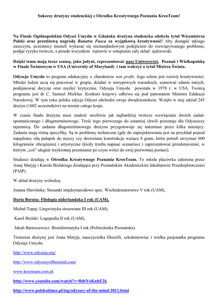 Sukcesy drużyny studenckiej z Ośrodka Kreatywnego Poznania KreoTeam! Na Finale Ogólnopolskim Odysei Umysłu w Gdańsku drużyna studencka zdobyła tytuł Wicemistrza Polski oraz prestiżową nagrodę Ranatra Fusca za wyjątkową kreatywność! Aby dostąpić takiego zaszczytu, uczestnicy musieli wykazać się niestandardowym podejściem do rozwiązywanego problemu, podjąć ryzyko twórcze, a przede wszystkim wprawić w osłupienie cały skład sędziowski. Dzięki temu mają teraz szansę, jako jedyni, reprezentować nasz Uniwersytet, Poznań i Wielkopolskę w Finale Światowym w USA (University of Maryland) i tam walczyć o tytuł Mistrza Świata. Odyseja Umysłu to program edukacyjny o charakterze non profit. Jego celem jest rozwój kreatywności. Młodzi ludzie uczą się pracować w grupie, działać w nietypowych warunkach, szanować zdanie innych, podejmować decyzje oraz myśleć krytycznie. Odyseja Umysłu powstała w 1978 r. w USA. Twórcą programu jest dr C. Samuel Micklus. Konkurs krajowy odbywa się pod patronatem Ministra Edukacji Narodowej. W tym roku polska edycja Odysei obchodzi swoje dwudziestolecie. Wzięło w niej udział 245 drużyn (1602 uczestników) na terenie całego kraju. W czasie finału drużyna musi znaleźć możliwie jak najbardziej twórcze rozwiązanie dwóch zadań: spontanicznego i długoterminowego. Treść tego pierwszego do ostatniej chwili pozostaje dla Odyseuszy tajemnicą. Do zadania długoterminowego drużyna przygotowuje się natomiast przez kilka miesięcy. Zadania mają różną specyfikę. Są to problemy techniczne (gdy do zaprojektowania jest na przykład pojazd napędzany siłą pułapek do myszy czy drewniana konstrukcja ważąca 8 gram, która potrafi utrzymać 600 kilogramów obciążenia) i artystyczne (kiedy trzeba napisać scenariusz i zaprezentować przedstawienie, w którym „coś” ulegnie trzykrotnej przemianie po czym wróci do swej pierwotnej postaci). Studenci działają w Ośrodku Kreatywnego Poznania KreoTeam. To młoda placówka założona przez Annę Matyję i Karola Bielskiego działająca przy Poznańskim Akademickim Inkubatorze Przedsiębiorczości (PAIP). W skład drużyny wchodzą: Joanna Sławińska: Stosunki międzynarodowe spec. Wschodoznawstwo V rok (UAM), Daria Boruta: Filologia niderlandzka I rok (UAM), Michał Tupaj: Lingwistyka stosowana III rok (UAM), Karol Bielski: Logopedia II rok (UAM), Jakub Bartoszewicz: Bioinformatyka I rok (Politechnika Poznańska). Trenerem drużyny jest Anna Matyja, nauczycielka filozofii, szkoleniowiec i wielka pasjonatka programu Odyseja Umysłu. http://www.odyseja.org/ http://www.odysseyofthemind.com/ www.kreoteam.com.pl. http://www.youtube.com/watch?v=BdtYoKnhE2k http://www.polskatimes.pl/tag/odyssey-of-the-mind-2011.html