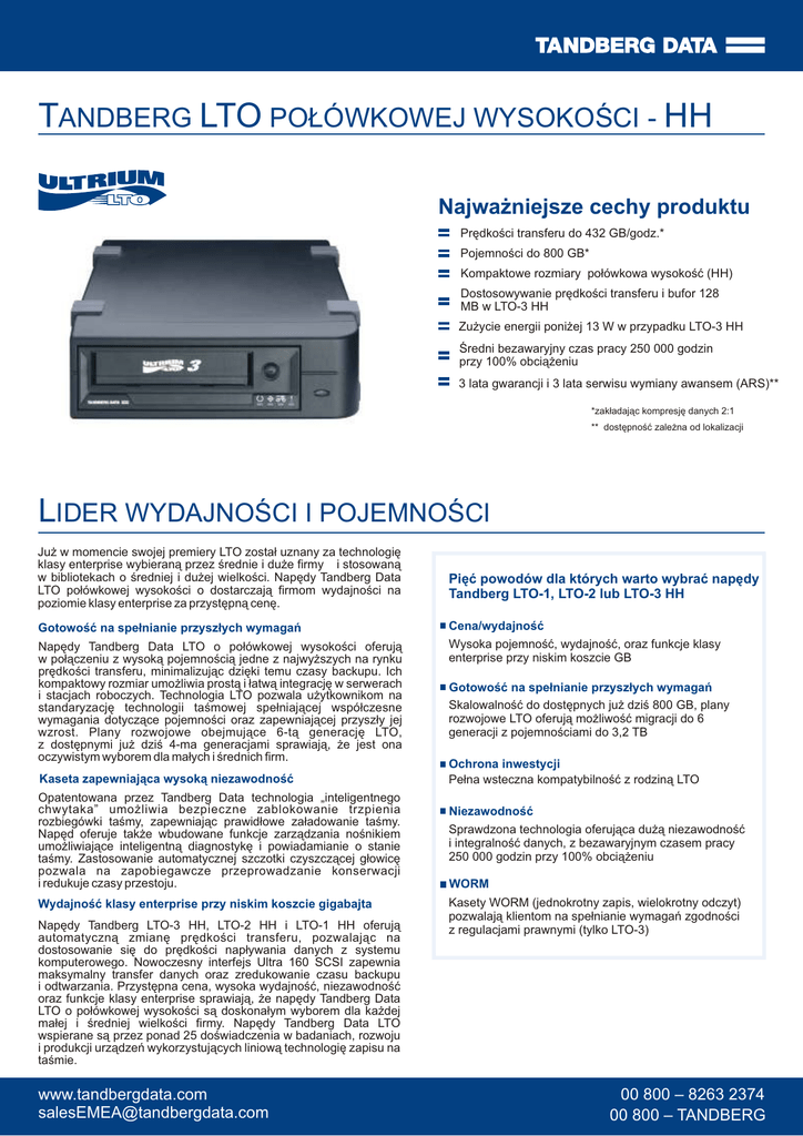 TANDBERG LTO POŁÓWKOWEJ WYSOKOŚCI - HH Najważniejsze cechy produktu Prędkości transferu do 432 GB/godz.* Pojemności do 800 GB* Kompaktowe rozmiary połówkowa wysokość (HH) Dostosowywanie prędkości transferu i bufor 128 MB w LTO-3 HH Zużycie energii poniżej 13 W w przypadku LTO-3 HH Średni bezawaryjny czas pracy 250 000 godzin przy 100% obciążeniu 3 lata gwarancji i 3 lata serwisu wymiany awansem (ARS)** *zakładając kompresję danych 2:1 ** dostępność zależna od lokalizacji LIDER WYDAJNOŚCI I POJEMNOŚCI Już w momencie swojej premiery LTO został uznany za technologię klasy enterprise wybieraną przez średnie i duże firmy i stosowaną w bibliotekach o średniej i dużej wielkości. Napędy Tandberg Data LTO połówkowej wysokości o dostarczają firmom wydajności na poziomie klasy enterprise za przystępną cenę. Pięć powodów dla których warto wybrać napędy Tandberg LTO-1, LTO-2 lub LTO-3 HH Gotowość na spełnianie przyszłych wymagań Cena/wydajność Napędy Tandberg Data LTO o połówkowej wysokości oferują w połączeniu z wysoką pojemnością jedne z najwyższych na rynku prędkości transferu, minimalizując dzięki temu czasy backupu. Ich kompaktowy rozmiar umożliwia prostą i łatwą integrację w serwerach i stacjach roboczych. Technologia LTO pozwala użytkownikom na standaryzację technologii taśmowej spełniającej współczesne wymagania dotyczące pojemności oraz zapewniającej przyszły jej wzrost. Plany rozwojowe obejmujące 6-tą generację LTO, z dostępnymi już dziś 4-ma generacjami sprawiają, że jest ona oczywistym wyborem dla małych i średnich firm. Wysoka pojemność, wydajność, oraz funkcje klasy enterprise przy niskim koszcie GB Kaseta zapewniająca wysoką niezawodność Opatentowana przez Tandberg Data technologia „inteligentnego chwytaka” umożliwia bezpieczne zablokowanie trzpienia rozbiegówki taśmy, zapewniając prawidłowe załadowanie taśmy. Napęd oferuje także wbudowane funkcje zarządzania nośnikiem umożliwiające inteligentną diagnostykę i powiadamianie o stanie taśmy. Zastosowanie automatycznej szczotki czyszczącej głowicę pozwala na zapobiegawcze przeprowadzanie konserwacji i redukuje czasy przestoju. Wydajność klasy enterprise przy niskim koszcie gigabajta Napędy Tandberg LTO-3 HH, LTO-2 HH i LTO-1 HH oferują automatyczną zmianę prędkości transferu, pozwalając na dostosowanie się do prędkości napływania danych z systemu komputerowego. Nowoczesny interfejs Ultra 160 SCSI zapewnia maksymalny transfer danych oraz zredukowanie czasu backupu i odtwarzania. Przystępna cena, wysoka wydajność, niezawodność oraz funkcje klasy enterprise sprawiają, że napędy Tandberg Data LTO o połówkowej wysokości są doskonałym wyborem dla każdej małej i średniej wielkości firmy. Napędy Tandberg Data LTO wspierane są przez ponad 25 doświadczenia w badaniach, rozwoju i produkcji urządzeń wykorzystujących liniową technologię zapisu na taśmie. www.tandbergdata.com [email protected] Gotowość na spełnianie przyszłych wymagań Skalowalność do dostępnych już dziś 800 GB, plany rozwojowe LTO oferują możliwość migracji do 6 generacji z pojemnościami do 3,2 TB Ochrona inwestycji Pełna wsteczna kompatybilność z rodziną LTO Niezawodność Sprawdzona technologia oferująca dużą niezawodność i integralność danych, z bezawaryjnym czasem pracy 250 000 godzin przy 100% obciążeniu WORM Kasety WORM (jednokrotny zapis, wielokrotny odczyt) pozwalają klientom na spełnianie wymagań zgodności z regulacjami prawnymi (tylko LTO-3) 00 800 – 8263 2374 00 800 – TANDBERG O firmie Tandberg Data Tandberg Data jest wiodącym światowym dostawcą i producentem napędów taśmowych, automatyki taśmowej oraz subsystemów dyskowych. Tandberg Data oferuje rozwiązania oparte o platformy technologii taśmowych LTO, SLR i VXA, oprogramowanie pamięci masowej, nośniki oraz pamięć masową z dyskami twardymi. Wszystkie rozwiązania zostały zaprojektowane w celu spełnienia wymagań związanych z rosnącą pamięcią masową w małych i średniej skali przedsiębiorstwach oferując skalowalność, niezawodność oraz wsteczną kompatybilność zapewniające niskie koszty eksploatacji oraz długoterminową ochronę inwestycji. Tandberg Data jest dumny z ponad 25-cio letniego dostarczania produktów i usług swoim klientom. Specyfikacja Napęd taśmowy Technologia: Pojemność (bez kopmpr.): Pojemność (z kompr.)*: Prędkość transferu (bez kompr.): Prędkość transferu (z kompr.)*: Transfer szczytowy Czas dostępu do pliku Rozmiar bufora danych: Kompresja danych: Tandberg LTO-3 HH LTO Ultrium 3 połówkowej wysokości 400 GB 800 GB 60 MB/s 120 MB/s 160 MB/s 76 sek. 128 MB w locie Interfejs: Kaseta na dane: Format zapisu: Liczba ścieżek: Kompatybilność z Tape Alert: Przesuw taśmy Prędkość taśmy odczyt / zapis: Prędkość przewijania: Niezawodność MTBF: Niekorygowalne błędy odczytu: Żywotność głowicy: Wbudowane funkcje diagnostyki: Mechanizm ładowania nośnika: Wymiary Napęd wewn. (Wys x Szer x Głęb): Waga: Napęd zewn. (Wys x Szer x Głęb): Włącznie z gumowymi nóżkami Waga: Warunki otoczenia Temperatura pracy: Temperatura przechowywania: Wilgotność względna pracy: Wilgotność wzgl. przechowywania: Wskaźnik obciążenia termicznego: Wymagania dotyczące zasilania Pobór mocy: Napęd wewnętrzny silnik pracujący/bezczynny): Napęd zewnętrzny: Certyfikaty Gwarancja i wsparcie Ultra 160 SCSI LVD LTO-3 LTO-3 704 ścieżki z danymi (LTO-3) Tak Tandberg LTO-2 HH LTO Ultrium 2 połówkowej wysokości 200 GB 400 GB* 24 MB/s 48 MB/s* 160 MB/s 76 sek. 64 MB LTO-DC (rozszerzona wersja ALDC), sprzętowa kompresja w locie Ultra 160 SCSI LVD LTO-2 LTO-2 512 ścieżek z danymi (LTO-2) Tak Tandberg LTO-1 HH LTO Ultrium 1 połówkowej wysokości 100 GB 200 GB* 16 MB/s 32 MB/s* 160 MB/s 76 sek. 64 MB LTO-DC (rozszerzona wersja ALDC), sprzętowa kompresja w loci