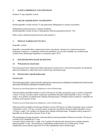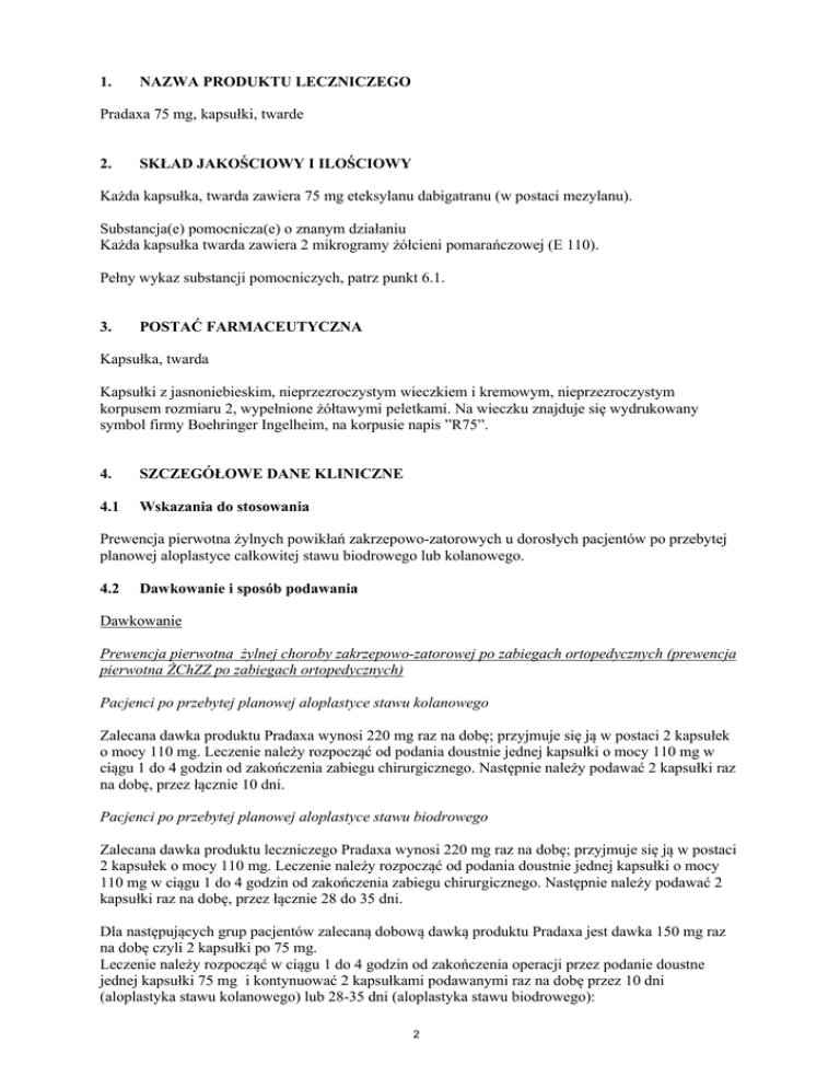 1. NAZWA PRODUKTU LECZNICZEGO Pradaxa 75 mg, kapsułki, twarde 2. SKŁAD JAKOŚCIOWY I ILOŚCIOWY Każda kapsułka, twarda zawiera 75 mg eteksylanu dabigatranu (w postaci mezylanu). Substancja(e) pomocnicza(e) o znanym działaniu Każda kapsułka twarda zawiera 2 mikrogramy żółcieni pomarańczowej (E 110). Pełny wykaz substancji pomocniczych, patrz punkt 6.1. 3. POSTAĆ FARMACEUTYCZNA Kapsułka, twarda Kapsułki z jasnoniebieskim, nieprzezroczystym wieczkiem i kremowym, nieprzezroczystym korpusem rozmiaru 2, wypełnione żółtawymi peletkami. Na wieczku znajduje się wydrukowany symbol firmy Boehringer Ingelheim, na korpusie napis ”R75”. 4. SZCZEGÓŁOWE DANE KLINICZNE 4.1 Wskazania do stosowania Prewencja pierwotna żylnych powikłań zakrzepowo-zatorowych u dorosłych pacjentów po przebytej planowej aloplastyce całkowitej stawu biodrowego lub kolanowego. 4.2 Dawkowanie i sposób podawania Dawkowanie Prewencja pierwotna żylnej choroby zakrzepowo-zatorowej po zabiegach ortopedycznych (prewencja pierwotna ŻChZZ po zabiegach ortopedycznych) Pacjenci po przebytej planowej aloplastyce stawu kolanowego Zalecana dawka produktu Pradaxa wynosi 220 mg raz na dobę; przyjmuje się ją w postaci 2 kapsułek o mocy 110 mg. Leczenie należy rozpocząć od podania doustnie jednej kapsułki o mocy 110 mg w ciągu 1 do 4 godzin od zakończenia zabiegu chirurgicznego. Następnie należy podawać 2 kapsułki raz na dobę, przez łącznie 10 dni. Pacjenci po przebytej planowej aloplastyce stawu biodrowego Zalecana dawka produktu leczniczego Pradaxa wynosi 220 mg raz na dobę; przyjmuje się ją w postaci 2 kapsułek o mocy 110 mg. Leczenie należy rozpocząć od podania doustnie jednej kapsułki o mocy 110 mg w ciągu 1 do 4 godzin od zakończenia zabiegu chirurgicznego. Następnie należy podawać 2 kapsułki raz na dobę, przez łącznie 28 do 35 dni. Dla następujących grup pacjentów zalecaną dobową dawką produktu Pradaxa jest dawka 150 mg raz na dobę czyli 2 kapsułki po 75 mg. Leczenie należy rozpocząć w ciągu 1 do 4 godzin od zakończenia operacji przez podanie doustne jednej kapsułki 75 mg i kontynuować 2 kapsułkami podawanymi raz na dobę przez 10 dni (aloplastyka stawu kolanowego) lub 28-35 dni (aloplastyka stawu biodrowego): 2 Pacjenci z umiarkowanymi zaburzeniami czynności nerek (klirens kreatyniny, CrCL 30-50 mL/min) [patrz Zaburzenia czynności nerek (prewencja pierwotna ŻChZZ po zabiegach ortopedycznych )] Pacjenci jednocześnie przyjmujący werapamil, amiodaron, chinidynę [patrz Stosowanie produktu Pradaxa jednocześnie ze słabo/umiarkowanie działającymi inhibitorami Pglikoproteiny (P-gp), tj. amiodaronem, chinidyną, werapamilem (prewencja pierwotna ŻChZZ po zabiegach ortopedycznych )] Pacjenci w wieku 75 lat lub starsi [patrz Pacjenci w podeszłym wieku (prewencja pierwotna ŻChZZ po zabiegach ortopedycznych )] W przypadku obu zabiegów chirurgicznych należy odsunąć w czasie rozpoczęcie leczenia, jeżeli nie zostanie zapewniona pełna hemostaza. Jeżeli leczenie nie zostanie rozpoczęte w dniu zabiegu chirurgicznego, wówczas należy je rozpocząć od podania 2 kapsułek raz na dobę. Ocena czynności nerek (prewencja pierwotna ŻChZZ po zabiegach ortopedycznych ): U wszystkich pacjentów: Przed rozpoczęciem leczenia produktem leczniczym Pradaxa należy ocenić czynność nerek poprzez obliczenie klirensu kreatyniny (CrCL), w celu wykluczenia pacjentów z ciężkim zaburzeniem czynności nerek (np. CrCL<30 mL/min) (patrz punkty 4.3, 4.4 i 5.2). Produkt Pradaxa jest przeciwwskazany u pacjentów z ciężkim zaburzeniem czynności nerek Czynność nerek należy ocenić gdy podejrzewa się pogorszenie czynności nerek podczas leczenia (np. hipowolemia, odwodnienie oraz w przypadku jednoczesnego stosowania wybranych produktów leczniczych) Do oceny czynności nerek (CrCL w mL/min) w sytuacjach klinicznych została użyta metoda Cockcroft-Gault. Wzór jak poniżej: Dla stężenia kreatyniny wyrażonej w mol/L: 1,23 (140-wiek[lata]) masa ciała [kg] ( 0,85 dla kobiet) stężęnie kreatyniny w surowicy krwi [mol/L] Dla stężenia kreatyniny wyrażonej w mg/dL: (140-wiek[lata]) masa ciała [kg] ( 0,85 dla kobiet) 72 x stężęnie kreatyniny w surowicy krwi [mg/dL] Metoda ta jest zalecana do oceny klirensu kreatyniny CrCL pacjentów przed i w trakcie leczenia produktem Pradaxa. Szczególne grupy pacjentów Zaburzenia czynności nerek (prewencja pierwotna ŻChZZ po zabiegach ortopedycznych ) Stosowanie produktu leczniczego Pradaxa u pacjentów z ciężkim zaburzeniem czynności nerek (CrCL < 30 mL/min) jest przeciwwskazane (patrz punkt 4.3). Istnieje ograniczone doświadczenie kliniczne dotyczące stosowania produktu leczniczego u pacjentów z umiarkowanym zaburzeniem czynności nerek (CrCL 30-50 mL/min). Podczas leczenia tych pacjentów należy zachować ostrożność. Zalecana dawka wynosi 150 mg, podawana raz na dobę w 2 kapsułkach po 75 mg (patrz punkty 4.4 i 5.1). 3 Stosowanie produktu leczniczego Pradaxa jednocześnie ze słabo/umiarkowanie działającymi inhibitorami P- glikoproteiny (P-gp), np. amiodaronem, chinidyną lub werapamilem (prewencja pierwotna ŻChZZ po zabiegach ortopedycznych ) U pacjentów stosujących eteksylan dabigatranu w skojarzeniu z amiodaronem, chinidyną lub werapamilem, dawkę produktu leczniczego Pradaxa należy zmniejszyć do 150 mg, podawaną raz na dobę w 2 kapsułkach po 75 mg (patrz punkty 4.4 i 4.5). W takim przypadku produkt leczniczy Pradaxa oraz inne produkty lecznicze powinny być przyjmowane jednocześnie. U pacjentów z umiarkowanym zaburzeniem czynności nerek jednocześnie leczonych eteksylanem dabigatranu i werapamilem należy rozważyć zmniejszenie dawki produktu leczniczego Pradaxa do 75 mg na dobę (patrz punkty 4.4 i 4.5). Pacjenci w podeszłym wieku (prewencja pierwotna ŻChZZ po zabiegach ortopedycznych ) Istnieje ograniczone doświadczenie kliniczne dotyczące stosowania produktu leczniczego u pacjentów 