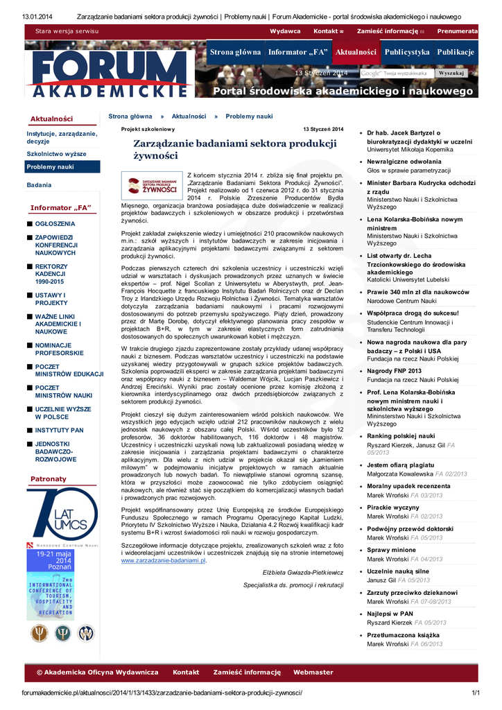 13.01.2014 Zarządzanie badaniami sektora produkcji żywności | Problemy nauki | Forum Akademickie - portal środowiska akademickiego i naukowego Stara wersja serwisu Wydawca Kontakt ☎ Zamieść informację ✉ Strona główna Informator „FA” Aktualności Prenumerata Publicystyka Publikacje 13 Styczeń 2014 Wysz ukaj Portal środowiska akademickiego i naukowego Aktualności Instytucje, zarządzanie, decyzje Szkolnictwo wyższe Strona główna » Aktualności » Problemy nauki Projekt szkoleniow y 13 Styczeń 2014 Zarządzanie badaniami sektora produkcji żywności Problemy nauki Badania Informator „FA” OGŁOSZENIA ZAPOWIEDZI KONFERENCJI NAUKOWYCH REKTORZY KADENCJI 1990-2015 USTAWY I PROJEKTY WAŻNE LINKI AKADEMICKIE I NAUKOWE NOMINACJE PROFESORSKIE POCZET MINISTRÓW EDUKACJI POCZET MINISTRÓW NAUKI UCZELNIE WYŻSZE W POLSCE INSTYTUTY PAN JEDNOSTKI BADAWCZOROZWOJOWE Patronaty Z końcem stycznia 2014 r. zbliża się finał projektu pn. „Zarządzanie Badaniami Sektora Produkcji Żywności”. Projekt realizowało od 1 czerwca 2012 r. do 31 stycznia 2014 r. Polskie Zrzeszenie Producentów Bydła Mięsnego, organizacja branżowa posiadająca duże doświadczenie w realizacji projektów badawczych i szkoleniowych w obszarze produkcji i przetwórstwa żywności. Projekt zakładał zwiększenie wiedzy i umiejętności 210 pracowników naukowych m.in.: szkół wyższych i instytutów badawczych w zakresie inicjowania i zarządzania aplikacyjnymi projektami badawczymi związanymi z sektorem produkcji żywności. Podczas pierwszych czterech dni szkolenia uczestnicy i uczestniczki wzięli udział w warsztatach i dyskusjach prowadzonych przez uznanych w świecie ekspertów – prof. Nigel Scollan z Uniwersytetu w Aberystwyth, prof. JeanFrançois Hocquette z francuskiego Instytutu Badań Rolniczych oraz dr Declan Troy z Irlandzkiego Urzędu Rozwoju Rolnictwa i Żywności. Tematyka warsztatów dotyczyła zarządzania badaniami naukowymi i pracami rozwojowymi dostosowanymi do potrzeb przemysłu spożywczego. Piąty dzień, prowadzony przez dr Martę Dorobę, dotyczył efektywnego planowania pracy zespołów w projektach B+R, w tym w zakresie elastycznych form zatrudniania dostosowanych do społecznych uwarunkowań kobiet i mężczyzn. W trakcie drugiego zjazdu zaprezentowane zostały przykłady udanej współpracy nauki z biznesem. Podczas warsztatów uczestnicy i uczestniczki na podstawie uzyskanej wiedzy przygotowywali w grupach szkice projektów badawczych. Szkolenia poprowadzili eksperci w zakresie zarządzania projektami badawczymi oraz współpracy nauki z biznesem – Waldemar Wójcik, Lucjan Paszkiewicz i Andrzej Ereciński. Wyniki prac zostały ocenione przez komisję złożoną z kierownika interdyscyplinarnego oraz dwóch przedsiębiorców związanych z sektorem produkcji żywności. Projekt cieszył się dużym zainteresowaniem wśród polskich naukowców. We wszystkich jego edycjach wzięło udział 212 pracowników naukowych z wielu jednostek naukowych z obszaru całej Polski. Wśród uczestników było 12 profesorów, 36 doktorów habilitowanych, 116 doktorów i 48 magistrów. Uczestnicy i uczestniczki uzyskali nową lub zaktualizowali posiadaną wiedzę w zakresie inicjowania i zarządzania projektami badawczymi o charakterze aplikacyjnym. Dla wielu z nich udział w projekcie okazał się „kamieniem milowym” w podejmowaniu inicjatyw projektowych w ramach aktualnie prowadzonych lub nowych badań. To niewątpliwie stanowi ogromną szansę, która w przyszłości może zaowocować nie tylko zdobyciem osiągnięć naukowych, ale również stać się początkiem do komercjalizacji własnych badań i prowadzonych prac rozwojowych. Projekt współfinansowany przez Unię Europejską ze środków Europejskiego Funduszu Społecznego w ramach Programu Operacyjnego Kapitał Ludzki, Priorytetu IV Szkolnictwo Wyższe i Nauka, Działania 4.2 Rozwój kwalifikacji kadr systemu B+R i wzrost świadomości roli nauki w rozwoju gospodarczym. Szczegółowe informacje dotyczące projektu, zrealizowanych szkoleń wraz z foto i wideorelacjami uczestników i uczestniczek znajdują się na stronie internetowej www.zarzadzanie-badaniami.pl. Elżbieta Gwiazda-Pietk iewicz Specjalistk a ds. promocji i rek rutacji Dr hab. Jacek Bartyzel o biurokratyzacji dydaktyki w uczelni Uniwersytet Mikołaja Kopernika Newralgiczne odwołania Głos w sprawie parametryzacji Minister Barbara Kudrycka odchodzi z rządu Ministerstwo Nauki i Szkolnictwa Wyższego Lena Kolarska-Bobińska nowym ministrem Ministerstwo Nauki i Szkolnictwa Wyższego List otwarty dr. Lecha Trzcionkowskiego do środowiska akademickiego Katolicki Uniwersytet Lubelski Prawie 340 mln zł dla naukowców Narodowe Centrum Nauki Współpraca drogą do sukcesu! Studenckie Centrum Innowacji i Transferu Technologii Nowa nagroda naukowa dla pary badaczy – z Polski i USA Fundacja na rzecz Nauki Polskiej Nagrody FNP 2013 Fundacja na rzecz Nauki Polskiej Prof. Lena Kolarska-Bobińska nowym ministrem nauki i szkolnictwa wyższego Mininsterstwo Nauki i Szkolnictwa Wyższego Ranking polskiej nauki Ryszard Kierzek, Janusz Gil FA 05/2013 Jestem ofiarą plagiatu Małgorzata Kowalewska FA 02/2013 Moralny upadek recenzenta Marek Wroński FA 03/2013 Pirackie wyczyny Marek Wroński FA 02/2013 Podwójny przewód doktorski Marek Wroński FA 05/2013 Sprawy minione Marek Wroński FA 04/2013 Uczelnie nauką silne Janusz Gil FA 05/2013 Zarzuty przeciwko dziekanowi Marek Wroński FA 07-08/2013 Najlepsi w PAN Ryszard Kierzek FA 05/2013 Przetłumaczona książka Marek Wroński FA 06/2013 © Akademicka Oficyna Wydawnicza Kontakt Zamieść informację Webmaster forumakademickie.pl/aktualnosci/2014/1/13/1433/zarzadzanie-badaniami-sektora-produkcji-zywnosci/ 1/1