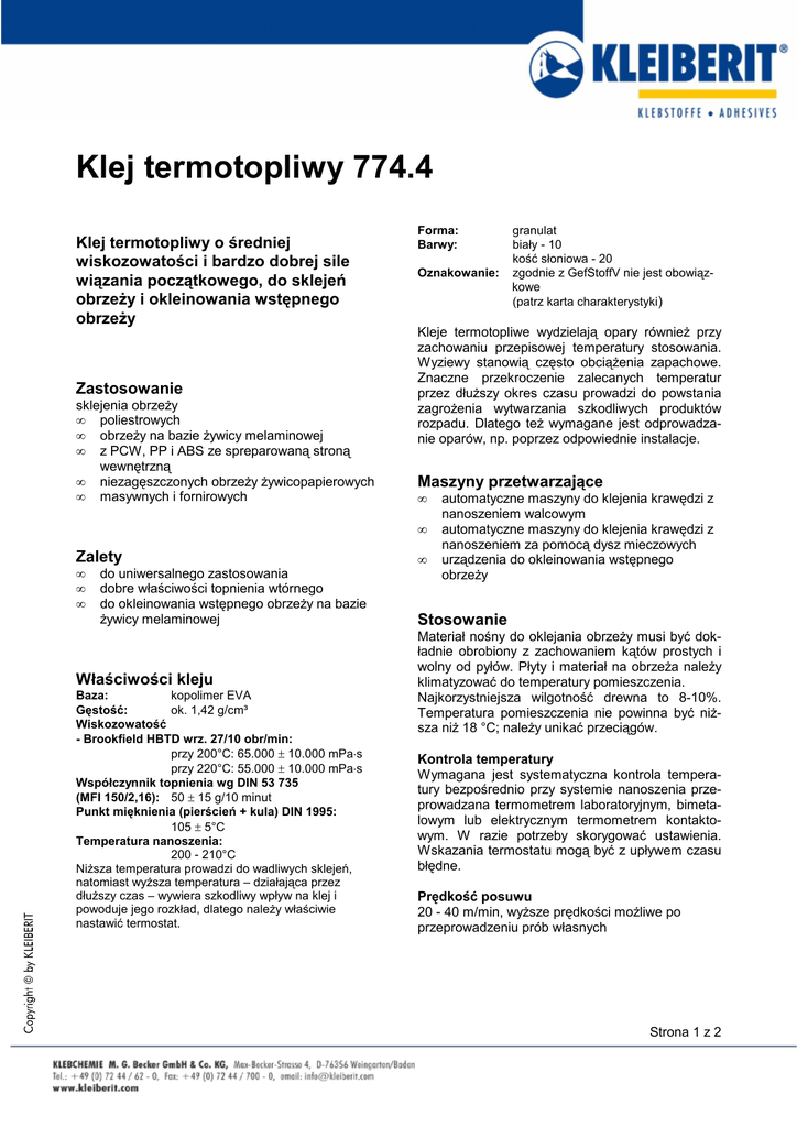 Klej termotopliwy 774.4 Klej termotopliwy o średniej wiskozowatości i bardzo dobrej sile wiązania początkowego, do sklejeń obrzeży i okleinowania wstępnego obrzeży Zastosowanie sklejenia obrzeży • poliestrowych • obrzeży na bazie żywicy melaminowej • z PCW, PP i ABS ze spreparowaną stroną wewnętrzną • niezagęszczonych obrzeży żywicopapierowych • masywnych i fornirowych Forma: Barwy: Oznakowanie: Kleje termotopliwe wydzielają opary również przy zachowaniu przepisowej temperatury stosowania. Wyziewy stanowią często obciążenia zapachowe. Znaczne przekroczenie zalecanych temperatur przez dłuższy okres czasu prowadzi do powstania zagrożenia wytwarzania szkodliwych produktów rozpadu. Dlatego też wymagane jest odprowadzanie oparów, np. poprzez odpowiednie instalacje. Maszyny przetwarzające • • Zalety • • • do uniwersalnego zastosowania dobre właściwości topnienia wtórnego do okleinowania wstępnego obrzeży na bazie żywicy melaminowej Właściwości kleju Baza: kopolimer EVA Gęstość: ok. 1,42 g/cm³ Wiskozowatość - Brookfield HBTD wrz. 27/10 obr/min: przy 200°C: 65.000 ± 10.000 mPa⋅s przy 220°C: 55.000 ± 10.000 mPa⋅s Współczynnik topnienia wg DIN 53 735 (MFI 150/2,16): 50 ± 15 g/10 minut Punkt mięknienia (pierścień + kula) DIN 1995: 105 ± 5°C Temperatura nanoszenia: 200 - 210°C Niższa temperatura prowadzi do wadliwych sklejeń, natomiast wyższa temperatura – działająca przez dłuższy czas – wywiera szkodliwy wpływ na klej i powoduje jego rozkład, dlatego należy właściwie nastawić termostat. granulat biały - 10 kość słoniowa - 20 zgodnie z GefStoffV nie jest obowiązkowe (patrz karta charakterystyki) • automatyczne maszyny do klejenia krawędzi z nanoszeniem walcowym automatyczne maszyny do klejenia krawędzi z nanoszeniem za pomocą dysz mieczowych urządzenia do okleinowania wstępnego obrzeży Stosowanie Materiał nośny do oklejania obrzeży musi być dokładnie obrobiony z zachowaniem kątów prostych i wolny od pyłów. Płyty i materiał na obrzeża należy klimatyzować do temperatury pomieszczenia. Najkorzystniejsza wilgotność drewna to 8-10%. Temperatura pomieszczenia nie powinna być niższa niż 18 °C; należy unikać przeciągów. Kontrola temperatury Wymagana jest systematyczna kontrola temperatury bezpośrednio przy systemie nanoszenia przeprowadzana termometrem laboratoryjnym, bimetalowym lub elektrycznym termometrem kontaktowym. W razie potrzeby skorygować ustawienia. Wskazania termostatu mogą być z upływem czasu błędne. Prędkość posuwu 20 - 40 m/min, wyższe prędkości możliwe po przeprowadzeniu prób własnych Strona 1 z 2 Schmelzkleber 774.4 Ilość nanoszenia Ilość nanoszonego kleju należy ustawić tak, aby nadwyżka stopionego kleju była lekko widoczna na brzegach sklejenia. W celu sprawdzenia, czy utworzył się zamknięty film klejowy, można zastosować transparentne, twarde paski PCV. Zużycie (okleinowanie wstępne obrzeży): 80 - 100 g/m² Obróbka wtórna Sklejone elementy można poddać dalszej obróbce bezpośrednio po sklejeniu (piłowanie, frezowanie, heblowanie itp.). Czyszczenie Urządzenia do klejenia klejem termotopliwym mogą być czyszczone czyściwem KLEIBERIT 827.0. Wielkości opakowań KLEIBERIT SK 774.4: worek 25,0 kg netto KLEIBERIT czyściwo 827.0: kanister metalowy 4,5 kg netto Składowanie KLEIBERIT SK 774.4 można składować przez okre 2 lat, w suchym i chłodnym miejscu. Stan jm 0910; zastępuje wcześniejsze wydania Utylizacja odpadów kleju i opakowań Wg klucza 080410 Nasze opakowania są z materiału nadającego się do recyclingu. Dokładnie opróżnione i oczyszczone opakowania można użyć ponownie. Serwis: Do Państwa dyspozycji oddajemy działające całą dobę służby technicznodoradcze, które mogą służyć radą w zakresie stosowania naszych produktów. Podane przez nas dane bazują na naszych dotychczasowych doświadczeniach i nie stanowią zapewnień dotyczących właściwości w rozumieniu Federalnej Ustawy Handlowej. Prosimy we własnym zakresie zbadać przydatność naszego produktu do zamierzonych przez Państwa celów. Przejęcie odpowiedzialności za wartość danego produktu wykraczającą poza wyżej wymienione informacje nie jest możliwe, nawet jeśli skorzystali Państwo z naszej bezpłatnej i nieobowiązująco pracującej służby doradczej. Strona 2 z 2