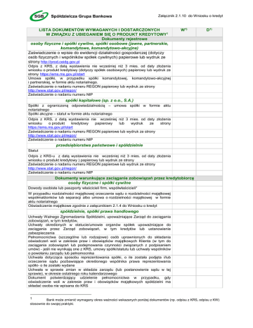 Załącznik 2.1.10 do Wniosku o kredyt LISTA DOKUMENTÓW WYMAGANYCH I DOSTARCZONYCH W ZWIĄZKU Z UBIEGANIEM SIĘ O PRODUKT KREDYTOWY1 Dokumenty rejestrowe osoby fizyczne i spółki cywilne, spółki osobowe (jawne, partnerskie, komandytowe, komandytowo-akcyjne) Zaświadczenie o wpisie do ewidencji działalności gospodarczej (dotyczy osób fizycznych i wspólników spółek cywilnych) papierowe lub wydruk ze strony http://prod.ceidg.gov.pl W1) D1) Odpis z KRS, z datą wystawienia nie wcześniej niż 3 mies. od daty złożenia wniosku o produkt kredytowy (dotyczy spółek osobowych) papierowy lub wydruk ze strony https://ems.ms.gov.pl/start Umowa spółki, w przypadku spółki komandytowej, komandytowo-akcyjnej i partnerskiej, w formie aktu notarialnego. Zaświadczenie o nadaniu numeru REGON papierowy lub wydruk ze strony http://www.stat.gov.pl/regon/ Zaświadczenie o nadaniu numeru NIP spółki kapitałowe (sp. z o.o., S.A.) Spółki z ograniczoną odpowiedzialnością – umowa spółki w formie aktu notarialnego Spółki akcyjne – statut w formie aktu notarialnego Odpis z KRS, z datą wystawienia nie wcześniej niż 3 mies. od daty złożenia wniosku o produkt kredytowy papierowy lub wydruk ze strony https://ems.ms.gov.pl/start Zaświadczenie o nadaniu numeru REGON papierowe lub wydruk ze strony http://www.stat.gov.pl/regon/ Zaświadczenie o nadaniu numeru NIP przedsiębiorstwa państwowe i spółdzielnie Statut Odpis z KRS-u z datą wystawienia nie wcześniej niż 3 mies. od daty złożenia wniosku o produkt kredytowy ) papierowy lub wydruk ze strony Zaświadczenie o nadaniu numeru REGON papierowe lub wydruk ze strony http://www.stat.gov.pl/regon/ Zaświadczenie o nadaniu numeru NIP Dokumenty warunkujące zaciąganie zobowiązań przez kredytobiorcę osoby fizyczne i spółki cywilne Dowody osobiste lub paszporty właścicieli firm, współwłaścicieli* W przypadku rozdzielności majątkowej orzeczenie sądu o rozdzielności majątkowej współmałżonków lub separacji albo umowa o rozdzielności majątkowej w formie aktu notarialnego Oświadczenie majątkowe zgodnie z załącznikiem 2.1.4 do Wniosku o kredyt spółdzielnie, spółki prawa handlowego Uchwały Walnego Zgromadzenia Spółdzielni, upoważniające Zarząd do zaciągania zobowiązań, w tym kredytów, Uchwały określonych w statucie/umowie organów spółek upoważniające do zaciągania przez Zarząd zobowiązań, w tym kredytów lub ustanowienie zabezpieczenia Pełnomocnictwa (szczególne lub rodzajowe) osób uprawnionych do składania oświadczeń woli w zakresie praw i obowiązków majątkowych Klienta (w tym do zaciągania zobowiązań lub podejmowania czynności związanych z podpisaniem umów) - jeśli nie wynikają one z KRS, umowy spółki/statutu lub uchwały wspólników o powołaniu zarządu lub pełnomocnika Uchwała dotycząca sposobu reprezentowania spółki, o ile została podjęta i/lub orzeczenie sądu pozbawiające określonego wspólnika prawa reprezentowania spółki- o ile zostało wydane Uchwała w sprawie zmian w składzie zarządu (lub postanowienie sądu w tej sprawie), w okresie ostatniego roku kalendarzowego Dokument potwierdzający udzielenie pełnomocnictwa w przypadku, gdy oświadczenie woli w zakresie praw i obowiązków majątkowych spółdzielni ma składać osoba nie wpisana do KRS 1 Bank może zmienić wymagany okres ważności wskazanych poniżej dokumentów (np. odpisu z KRS, odpisu z KW) stosownie do swojej praktyki. Uchwała Walnego Zgromadzenia Spółdzielni określająca najwyższą sumę zobowiązań, jaką spółdzielnia może zaciągnąć lub oświadczenie członków zarządu o braku takich ograniczeń spółki giełdowe Prospekty emisyjne spółek giełdowych, Dokumenty z Urzędu Skarbowego/ Urzędu Gminy/ Dokumenty z ZUS/KRUS z datą wystawienia nie wcześniej niż 1 mies. od daty złożenia wniosku o produkt kredytowy* Zaświadczenie/Oświadczenie o nie zaleganiu z podatkami, nie prowadzeniu egzekucji skarbowej lub uzyskanych odroczeniach i umorzeniach Zaświadczenie/Oświadczenie o nie zaleganiu z podatkiem rolnym Zaświadczenie/Oświadczenie o nie zaleganiu ze składkami na ZUS/KRUS przy spółkach osobowych są to zaświadczenia/oświadczenia dotyczące spółki oraz każdego ze wspólników spółki Dokumenty dotyczące prowadzonej działalności Koncesja/Zezwolenia/ Licencja (o ile prowadzona działalność gospodarcza tego wymaga) Dokument uprawniający do wykonywania zawodu w przypadku wolnych zawodów Dokumenty potwierdzające stosunek prawny wnioskodawcy do zajmowanych pomieszczeń i posiadanego majątku trwałego (dowody własności lub umowy dzierżawy) Umowy sprzedaży – istotne dla działalności firmy (potwierdzenie zbytu) Kontrakty (m.in. jako podstawa udzielenia gwarancji) Umowy o realizację robót inwestycyjnych Prospekty informacyjne, oferty sprzedaży, foldery, itp. Posiadane certyfikaty, wyróżnienia Dokumenty z innych banków i instytucji finansowych Zaświadczenie/Oświadczenie o posiadaniu rachunków bankowych, wielkości obrotów Zaświadczenie/Oświadczenie o zadłużeniu w innych bankach i innych instytucjach finansowych Kopie umów kredytowych/leasingowych/innych Opinia bankowa (o ile jest wymagana) Dokumenty dot. powiązań z innymi podmiotami gospodarczymi lub grup kapitałowych Oświadczenie o powiązaniach kapitałowych, (rodzinnych), załącznik 2.1.1 do Wniosku o kredyt Struktura organizacyjna grupy organizacyjnych, personalnych Liczba posiadanych udziałów i udział w głosach w innych podmiotach Sprawozdanie skonsolidowane grupy kapitałowej, o ile jest wymagane przez Ustawę o Rachunkowości Wyniki finansowe podmiotów powiązanych Zestawienie transakcji wzajemnych (zakupy/sprzedaż) z podmiotami powiązanymi, o ile mają istotny wpływ na wyniki grupy Umowy spółek i innych podmiotów – podmioty zależne, nadrzędne Wzajemne zobowiązania (np. poręczenia. gwarancje, pożyczki) Dokumenty finansowe pełna księgowość Sprawozd