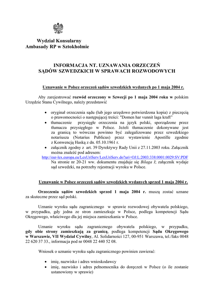 Wydział Konsularny Ambasady RP w Sztokholmie INFORMACJA NT. UZNAWANIA ORZECZEŃ SĄDÓW SZWEDZKICH W SPRAWACH ROZWODOWYCH Uznawanie w Polsce orzeczeń sądów szwedzkich wydanych po 1 maja 2004 r. Aby zarejestrować rozwód orzeczony w Szwecji po 1 maja 2004 roku w polskim Urzędzie Stanu Cywilnego, należy przedstawić • oryginał orzeczenia sądu (lub jego urzędowo potwierdzona kopia) z pieczęcią o prawomocności o następującej treści: "Domen har vunnit laga kraft” • tłumaczenie przysięgłe orzeczenia na język polski, sporządzone przez tłumacza przysięgłego w Polsce. Jeżeli tłumaczenie dokonywane jest za granicą to wówczas powinno być zalegalizowane przez szwedzkiego notariusza (Notarius Publicus) przez wystawienie Apostille zgodnie z Konwencją Haską z dn. 05.10.1961 r. • załącznik zgodny z art. 39 Dyrektywy Rady Unii z 27.11.2003 roku. Załącznik można znaleźć pod adresem: http://eur-lex.europa.eu/LexUriServ/LexUriServ.do?uri=OJ:L:2003:338:0001:0029:SV:PDF Na stronie nr 20-21 ww. dokumentu znajduje się Bilaga I; załącznik wydaje sąd szwedzki, na potrzeby rejestracji wyroku w Polsce. Uznawanie w Polsce orzeczeń sądów szwedzkich wydanych sprzed 1 maja 2004 r. Orzeczenia sądów szwedzkich sprzed 1 maja 2004 r. muszą zostać uznane za skuteczne przez sąd polski. Uznanie wyroku sądu zagranicznego w sprawie rozwodowej obywatela polskiego, w przypadku, gdy jedna ze stron zamieszkuje w Polsce, podlega kompetencji Sądu Okręgowego, właściwego dla jej miejsca zamieszkania w Polsce. Uznanie wyroku sądu zagranicznego obywatela polskiego, w przypadku, gdy obie strony zamieszkują za granicą, podlega kompetencji Sądu Okręgowego w Warszawie, VII Wydział Cywilny, Al. Solidarności 127, 00-951 Warszawa, tel./faks 0048 22 620 37 33., informacja pod nr 0048 22 440 52 08. Wniosek o uznanie wyroku sądu zagranicznego powinien zawierać: • imię, nazwisko i adres wnioskodawcy • imię, nazwisko i adres pełnomocnika do doręczeń w Polsce (o ile zostanie ustanowiony w sprawie) • imię, nazwisko i adres uczestnika postępowania (była żona, były mąż). Jeżeli aktualny adres jest nieznany, należy podać ostatni znany adres lub zaświadczenie właściwego organu państwa ostatniego miejsca zamieszkania, o fakcie, ze adres ten nie jest znany • datę i miejsce zawarcia związku małżeńskiego (jeżeli związek małżeński zawarty był za granicą) • obywatelstwo, jakie posiadali małżonkowie w dniu wniesienia pozwu o rozwód oraz jakie obywatelstwo posiadają obecnie • uzasadnienie interesu prawnego zadania uznania wyroku (do czego potrzebne jest wnioskodawcy uznanie wyroku) • wyjaśnienie, czy w Polsce toczyła się sprawa o rozwód. Do wniosku w sprawie rozwodowej należy dołączyć: • wyrok rozwodowy w oryginale (lub jego urzędowo potwierdzona kopia) z pieczęcią o prawomocności następującej treści: "Domen har vunnit laga kraft." • tłumaczenie wyroku rozwodowego na język polski, sporządzone przez tłumacza przysięgłego w Polsce. Jeżeli tłumaczenie dokonywane jest za granicą to wówczas powinno być zalegalizowane przez szwedzkiego notariusza (Notarius Publicus) przez wystawienie Apostille zgodnie z Konwencją Haską z dn. 05.10.1961 r. • odpis aktu małżeństwa z Urzędu Stanu Cywilnego w Polsce - gdy małżeństwo było zawarte w Polsce lub zarejestrowane w polskich księgach stanu cywilnego. Wszystkie wyżej wymienione dokumenty w 4 egzemplarzach wnioskodawca składa osobiście w Biurze Podawczym właściwego terytorialnie Sądu Okręgowego w Polsce lub przesyła listem poleconym na adres właściwego terytorialnie Sądu Okręgowego w Polsce. Wnioskodawca składając wniosek o uznanie wyroku sądu zagranicznego zobowiązany jest do uiszczenia opłaty za przyjęcie wniosku do rozpatrzenia (wysokość opłaty należy ustalić bezpośrednio z właściwym terytorialnie Sądem Okręgowym). Decyzje w sprawie terminu posiedzenia Sądu, wysokości opłat za postępowanie sądowe, złożenie ewentualnie dodatkowych dokumentów lub wyjaśnień należą do kompetencji właściwego terytorialnie Sądu Okręgowego w Polsce.