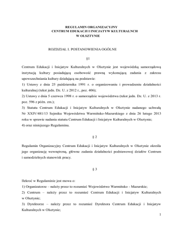 REGULAMIN ORGANIZACYJNY CENTRUM EDUKACJI I INICJATYW KULTURALNCH W OLSZTYNIE ROZDZIAŁ I. POSTANOWIENIA OGÓLNE §1 Centrum Edukacji i Inicjatyw Kulturalnych w Olsztynie jest wojewódzką samorządową instytucją kultury posiadającą osobowość prawną wykonującą zadania z zakresu upowszechniania kultury działającą na podstawie: 1) Ustawy z dnia 25 października 1991 r. o organizowaniu i prowadzeniu działalności kulturalnej (tekst jedn. Dz. U. z 2012 r., poz. 406); 2) Ustawy z dnia 5 czerwca 1998 r. o samorządzie województwa (tekst jedn. Dz. U. z 2013 r. poz. 596 z późn. zm.); 3) Statutu Centrum Edukacji i Inicjatyw Kulturalnych w Olsztynie nadanego uchwałą Nr XXIV/481/13 Sejmiku Województwa Warmińsko-Mazurskiego z dnia 26 lutego 2013 roku w sprawie nadania statutu Centrum Edukacji i Inicjatyw Kulturalnych w Olsztynie; 4) oraz niniejszego Regulaminu. §2 Regulamin Organizacyjny Centrum Edukacji i Inicjatyw Kulturalnych w Olsztynie określa jego organizację wewnętrzną, główne zadania działalności podstawowej działów Centrum i samodzielnych stanowisk pracy. §3 Ilekroć w Regulaminie jest mowa o: 1) Organizatorze – należy przez to rozumieć Województwo Warmińsko - Mazurskie; 2) Centrum – należy przez to rozumieć Centrum Edukacji i Inicjatyw Kulturalnych w Olsztynie; 3) Dyrektorze – należy przez to rozumieć Dyrektora Centrum Edukacji i Inicjatyw Kulturalnych w Olsztynie; 1 4) Zastępcy Dyrektora – należy przez to rozumieć Zastępcę Dyrektora Centrum Edukacji i Inicjatyw Kulturalnych w Olsztynie; 5) Komórkach organizacyjnych – należy przez to rozumieć : Ośrodek Animacji Kultury Czynnej, Dział Organizacji Imprez i Promocji, Dział Administracyjny, Dział Finansowo Księgowy i Kadr, Samodzielne stanowiska pracy: Instruktor ds. projektów realizowanych przez CEiIK, Instruktor ds. archiwum i sprawozdawczości, Sekretarka wchodzące w skład Centrum Edukacji i Inicjatyw Kulturalnych w Olsztynie. ROZDZIAŁ II. ORGANY ZARZĄDZAJĄCE I DORADCZE §4 Centrum zarządzane jest przez Dyrektora. §5 1. Dyrektor zarządza całokształtem działalności Centrum i reprezentuje Centrum na zewnątrz. Jest odpowiedzialny za prawidłową działalność merytoryczną, finansową i gospodarczą instytucji. 2. Dyrektor przedstawia organizatorowi plany, sprawozdania, raporty, analizy związane z zakresem działalności. 3. Dyrektora zastępuje zastępca. 4. Zastępca Dyrektora jest upoważniony do dokonywania czynności związanych z reprezentowaniem i zarządzaniem Centrum na podstawie powierzonego przez Dyrektora szczegółowego zakresu obowiązków. §6 1. Dyrektor może powoływać Radę Programową. 2 2. Do zakresu prac Rady powołanej przez dyrektora Centrum należy: 1) opiniowanie kierunków działalności programowej Centrum; 2) opiniowanie rocznych planów pracy i sprawozdań Centrum; 3) opiniowanie przedstawionych przez dyrektora Centrum dokumentów programowych dotyczących spraw społecznego ruchu kulturalnego i animacji kultury, a także wyrażanie opinii w trybie konsultacji w innych sprawach. 3. Skład osobowy i tryb pracy Rady określa dyrektor, po zasięgnięciu opinii kierowników komórek organizacyjnych i współpracujących z Centrum organizacji pozarządowych. 4. Tryb pracy Rady określa Dyrektor. ROZDZIAŁ III. STRUKTURA ORGANIZACYJNA CENTRUM §7 1.W skład Centrum wchodzą następujące komórki organizacyjne: 1) Ośrodek Animacji Kultury Czynnej - OAK, 2) Dział Organizacji Imprez i Promocji - DIP, 3) Dział Administracyjny - DA, 4) Dział Finansowo - Księgowy i Kadr - DFK, 5) Samodzielne stanowiska pracy: Instruktor ds. projektów realizowanych przez CEiIK, Instruktor ds. archiwum i sprawozdawczości, Sekretarka. 2. Schemat struktury organizacyjnej Centrum stanowi Załącznik do niniejszego Regulaminu. §8 1. W komórkach organizacyjnych, mogą być tworzone stanowiska samodzielnych instruktorów. 2. Dział Administracyjny, Dział Finansowo - Księgowy i Kadr, Dział Organizacji Imprez i Promocji oraz Samodzielne Stanowiska Pracy podlegają bezpośrednio Dyrektorowi. 3. Ośrodek Animacji Kultury Czynnej podlega Zastępcy Dyrektora. 3 § 9 Do wykonywania zadań złożonych mogą być doraźnie tworzone zespoły zadaniowe koordynowane przez kierowników lub pracowników wyznaczonych przez Dyrektora. ROZDZIAŁ IV. ZADANIA KOMÓREK ORGANIZACYJNYCH § 10 1. Ośrodkiem Animacji Kultury Czynnej kieruje kierownik. 2. Do zadań Ośrodka Animacji Kultury Czynnej należy: 1) projektowanie, realizacja i upowszechnianie programów kulturalnych i społecznych, mających na celu: a) eksplorację i promocję nowych form i obszarów uczestnictwa w kulturze; b) zwiększanie aktywności społecznej szczególnie w środowiskach wiejskich, defaworyzowanych i zagrożonych marginalizacją; c) rozwijanie i budowanie tożsamości społeczności lokalnej w oparciu o dziedzictwo przeszłości. 2) wspieranie organizacji pozarządowych działających w sferze kultury w zakresie wyznaczonym przez Organizatora, ze szczególnym uwzględnieniem: a) tworzenia systemu wsparcia dla organizacji pozarządowych zgodnie z wytycznymi i pod nadzorem Organizatora; b) monitoringu i ewaluacji projektów dotyczących kultury i wzmacniania niektórych kompetencji społecznych, realizowanych przez organizacje pozarządowe dzięki wsparciu Organizatora; c) budowania innowacyjnych projektów sieciowych z organizacjami pozarządowymi, ośrodkami kultury oraz ośrodkami badawczymi. 3) stymulowanie procesu samoorganizacji ruchu kulturalnego oraz wspomaganie liderów środowiskowych w aktywizowaniu społeczności lokalnych poprzez: a) szkolenia; 4 b) warsztaty; c) prowadzenie innych form doskonalenia zawodowego. 4) opracowywanie analiz dotyczących stanu organizacji i infrastruktury służącej działalności kulturalnej oraz formułowanie i przedstawianie diagnoz i propozycji zmian w tym zakresie; 5) utrzymywanie ścisłych kontaktów z innymi ośrodkami kultury w kraju i regionie, organizo