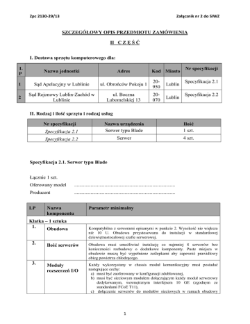 Zpc 2130-29/13 Załącznik nr 2 do SIWZ SZCZEGÓŁOWY OPIS PRZEDMIOTU ZAMÓWIENIA II C Z Ę Ś Ć I. Dostawa sprzętu komputerowego dla: L P Nazwa jednostki Adres 1 Sąd Apelacyjny w Lublinie ul. Obrońców Pokoju 1 20950 Lublin 2 Sąd Rejonowy Lublin-Zachód w Lublinie ul. Boczna Lubomelskiej 13 20070 Lublin Kod Miasto Nr specyfikacji Specyfikacja 2.1 Specyfikacja 2.2 II. Rodzaj i ilość sprzętu i rodzaj usług Specyfikacja 2.1 Nazwa urządzenia Serwer typu Blade Ilość 1 szt. Specyfikacja 2.2 Serwer 4 szt. Nr specyfikacji Specyfikacja 2.1. Serwer typu Blade Łącznie 1 szt. Oferowany model ................................................................................ Producent ................................................................................ LP Nazwa komponentu Klatka – 1 sztuka 1. Obudowa Parametr minimalny Kompatybilna z serwerami opisanymi w punkcie 2. Wysokość nie większa niż 10 U. Obudowa przystosowana do instalacji w standardowej dziewiętnastocalowej szafie serwerowej. 2. Ilość serwerów Obudowa musi umożliwiać instalację co najmniej 8 serwerów bez konieczności rozbudowy o dodatkowe komponenty. Puste miejsca w obudowie muszą być wypełnione zaślepkami aby zapewnić prawidłowy obieg powietrza chłodzącego. 3. Moduły rozszerzeń I/O Każdy wykorzystany w chassis moduł komunikacyjny musi posiadać następujące cechy: a) musi być zaoferowany w konfiguracji zdublowanej, b) musi być sieciowym modułem dołączającym każdy moduł serwerowy dedykowanym, wewnętrznym interfejsem 10 GE (zgodnym ze standardami FCoE T11), c) dołączenie serwerów do modułów sieciowych w ramach obudowy 1 Zpc 2130-29/13 Załącznik nr 2 do SIWZ (backplane) musi być realizowane, w sposób niewymagający użycia zewnętrznych kabli. Jeśli do spełnienia pozostałych warunków specyfikacji jest to wymagane, dopuszcza się zastosowanie w chassis większej - niż jeden, redundantny - ilości takich modułów. Komponenty zawarte w różnych obudowach tego samego producenta muszą komunikować się ze sobą wyłącznie poprzez centralny system przełączający Dopuszcza się zastosowanie rozwiązania, gdzie moduł przełączający i zarządzający znajduje się na osobnym urządzeniu, pod warunkiem, że łączna liczba portów fc będzie nie mniejsza niż 12 a portów 10G 16. Wewnętrznie każdy serwer powinien zapewniać polaczenie przynajmniej 40Gbit/s do systemu przełączającego. 4. Przełączniki Ethernet 10Gb - Redundantny zespół przełączający musi spełniać następujące wymagania: a) Scentralizowany i wspólny system przełączania 10GE, wirespeed. b) Centralny zespół przełączający musi posiadać architekturę nieblokującą; c) Dołączanie kolejnych obudów serwerowych do systemu przełączania poprzez umieszczone w obudowach zintegrowane sieciowe moduły rozszerzające 10GE; d) Możliwość dołączenia pojedynczej obudowy serwerowej poprzez min. 2 x 4 interfejsy 10GE (lub połączenie o równoważnej wydajności).; e) Dostęp do sieci LAN oraz do sieci SAN powinien być realizowany na wspólnych portach, w oparciu o protokół FCoE (FibreChannel over Ethernet) zgodnie ze specyfikacją ANSI T11; f) Aby nie ograniczać możliwości złożenia oferty dostawcom, którzy nie w pełni zaadoptowali standard FCoE, na potrzeby komunikacji SAN, dopuszczalne jest rozwiązanie, w którym pojedyncza obudowa serwerowa dołączana będzie do sieci SAN poprzez interfejsy FC. W takim wypadku centralny system przełączający nadal musi wspierać technologię FCoE, a pojedyncza obudowa musi być dołączona do centralnego systemu przełączającego za pomocą min. 2 x 2 interfejsów FCx2/4/8G (lub połączenia o równoważnej wydajności). Jako centralny system przełączający należy zaoferować urządzenia pozwalające dołączyć zewnętrzną macierz minimum 4-rema portami 10GE/FCoE W warstwie sieciowej system przełączający musi obsługiwać a) ramki jumbo (9000B), b) obsługę VLANów 802.1Q (min. 1000 sieci VLAN), c) obsługę agregacji 802.3ad (LACP), d) obsługę mechanizmów QoS (802.1p, minimum cztery kolejki sprzętowe per interfejs, obsługa kolejki priorytetowej), e) obsługę IEEE Data Center Bridging (802.1Qbb PFC, 802.1AB, 802.1Qaz Enhanced Transmission Selection), f) wszystkie porty modułu przełączającego konfigurowane jako 1/10 Gigabit Ethernet lub 1/2/4/8Gbps Fibre Channel Wszystkie wykorzystane urządzenia muszą mieć wbudowane minimum 32 porty. Dopuszczalne są przełączniki zewnętrzne przy zastosowaniu pasywnych modułów 10Gb Ethernet passthrough w obudowie blade. Zamawiający wymaga dostarczenia co najmniej 8 modułów SFP + 10Gb SR ze złączem LC do połączenia z posiadaną przez Zamawiającego siecią LAN 5. Zarządzanie Zespół zarządzający musi spełniać następujące wymagania: a) Możliwość wspólnego zarządzania, co najmniej 10-ma obudowami serwerowymi wyposażonymi w maksymalną dozwoloną w konfiguracji ilość serwerów, z wykorzystaniem wymienionych poniżej funkcjonalności. b) Zespół zarządzający może składać się z wielu komponentów oprogramowania. Jeśli oprogramowanie wymaga osobnych serwerów, 2 Zpc 2130-29/13 Załącznik nr 2 do SIWZ należy dostarczyć je razem z odpowiednimi licencjami. Każdy z komponentów musi być zainstalowany wg. zaleceń producenta. Jeśli komponenty oprogramowania zarządzającego będą instalowane w środowisku zwirtualizowanym, nie dopuszczalne jest instalowanie komponentów podstawowego oraz zapasowego na tym samym serwerze fizycznym. W wypadku instalacji komponentów zarządzających na maszynach wirtualnych, należy dostarczyć osobno serwery pod te wirtualne maszyny wg zaleceń producenta oraz licencje na platformę wirtualizacyjną w wersji wymaganej przez klienta; c) System musi zarządzać jednocześnie obudowami producenta, jako pojedynczym środowiskiem; d) System musi posiadać zdalną konsolę kvm dla każdego z serwerów. Konsola musi być zaimplemento