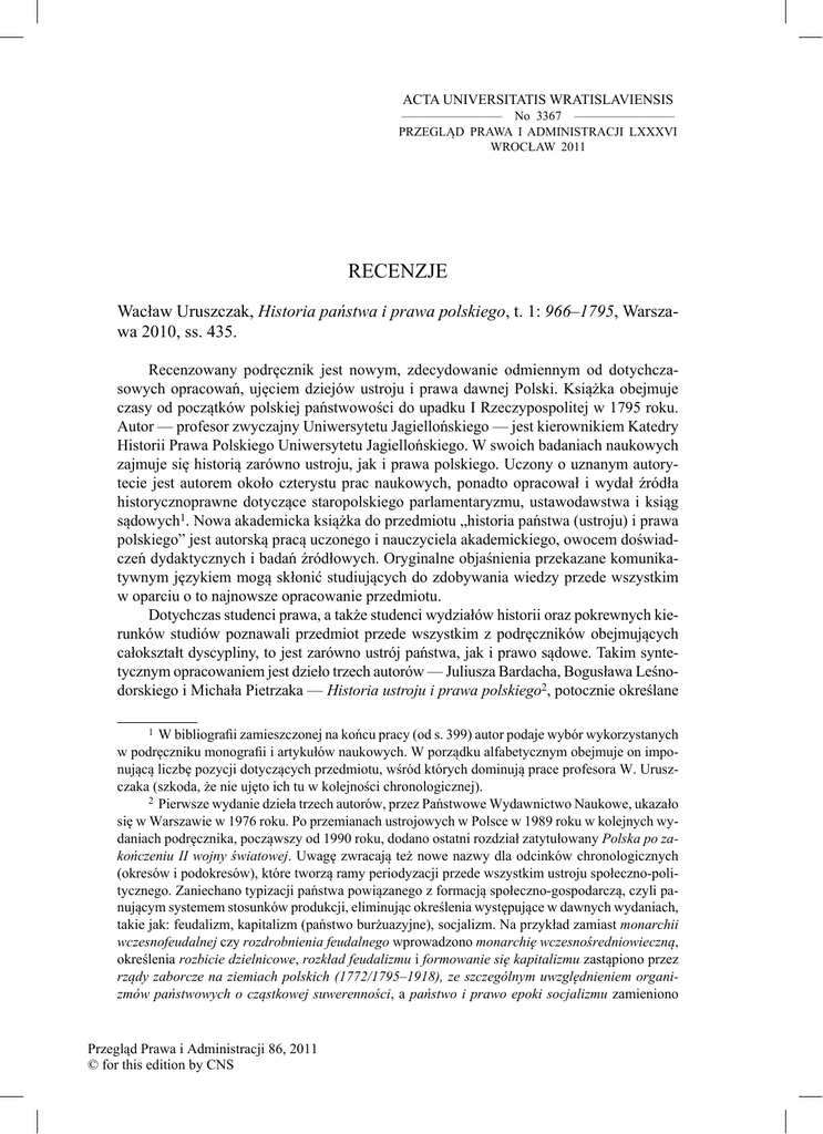 ACTA UNIVERSITATIS WRATISLAVIENSIS ———————— No 3367 ———————— PRZEGLĄD PRAWA I ADMINISTRACJI LXXXVI WROCŁAW 2011 RECENZJE Wacław Uruszczak, Historia państwa i prawa polskiego, t. 1: 966–1795, Warszawa 2010, ss. 435. Recenzowany podręcznik jest nowym, zdecydowanie odmiennym od dotychczasowych opracowań, ujęciem dziejów ustroju i prawa dawnej Polski. Książka obejmuje czasy od początków polskiej państwowości do upadku I Rzeczypospolitej w 1795 roku. Autor — profesor zwyczajny Uniwersytetu Jagiellońskiego — jest kierownikiem Katedry Historii Prawa Polskiego Uniwersytetu Jagiellońskiego. W swoich badaniach naukowych zajmuje się historią zarówno ustroju, jak i prawa polskiego. Uczony o uznanym autorytecie jest autorem około czterystu prac naukowych, ponadto opracował i wydał źródła historycznoprawne dotyczące staropolskiego parlamentaryzmu, ustawodawstwa i ksiąg sądowych1. Nowa akademicka książka do przedmiotu „historia państwa (ustroju) i prawa polskiego” jest autorską pracą uczonego i nauczyciela akademickiego, owocem doświadczeń dydaktycznych i badań źródłowych. Oryginalne objaśnienia przekazane komunikatywnym językiem mogą skłonić studiujących do zdobywania wiedzy przede wszystkim w oparciu o to najnowsze opracowanie przedmiotu. Dotychczas studenci prawa, a także studenci wydziałów historii oraz pokrewnych kierunków studiów poznawali przedmiot przede wszystkim z podręczników obejmujących całokształt dyscypliny, to jest zarówno ustrój państwa, jak i prawo sądowe. Takim syntetycznym opracowaniem jest dzieło trzech autorów — Juliusza Bardacha, Bogusława Leśnodorskiego i Michała Pietrzaka — Historia ustroju i prawa polskiego2, potocznie określane 1 W bibliografii zamieszczonej na końcu pracy (od s. 399) autor podaje wybór wykorzystanych w podręczniku monografii i artykułów naukowych. W porządku alfabetycznym obejmuje on imponującą liczbę pozycji dotyczących przedmiotu, wśród których dominują prace profesora W. Uruszczaka (szkoda, że nie ujęto ich tu w kolejności chronologicznej). 2 Pierwsze wydanie dzieła trzech autorów, przez Państwowe Wydawnictwo Naukowe, ukazało się w Warszawie w 1976 roku. Po przemianach ustrojowych w Polsce w 1989 roku w kolejnych wydaniach podręcznika, począwszy od 1990 roku, dodano ostatni rozdział zatytułowany Polska po zakończeniu II wojny światowej. Uwagę zwracają też nowe nazwy dla odcinków chronologicznych (okresów i podokresów), które tworzą ramy periodyzacji przede wszystkim ustroju społeczno-politycznego. Zaniechano typizacji państwa powiązanego z formacją społeczno-gospodarczą, czyli panującym systemem stosunków produkcji, eliminując określenia występujące w dawnych wydaniach, takie jak: feudalizm, kapitalizm (państwo burżuazyjne), socjalizm. Na przykład zamiast monarchii wczesnofeudalnej czy rozdrobnienia feudalnego wprowadzono monarchię wczesnośredniowieczną, określenia rozbicie dzielnicowe, rozkład feudalizmu i formowanie się kapitalizmu zastąpiono przez rządy zaborcze na ziemiach polskich (1772/1795–1918), ze szczególnym uwzględnieniem organizmów państwowych o cząstkowej suwerenności, a państwo i prawo epoki socjalizmu zamieniono Przegląd Prawa i Administracji 86, 2011 © for this edition by CNS 332 RECENZJE mianem trojaczków. Drugim fundamentalnym podręcznikiem obejmującym całość dyscypliny jest praca Tadeusza Maciejewskiego, profesora Uniwersytetu Gdańskiego, Historia ustroju i prawa sądowego Polski3. Zarysem wykładu obejmującego dzieje polskiego państwa i prawa sądowego jest praca poznańskich uczonych4 oraz bardzo przydatne dwutomowe dzieło Stanisława Płazy5 dotyczące zarówno historii ustroju, jak i prawa, doprowadzone jednak tylko do początków II Rzeczypospolitej. Większość podręczników nie obejmuje całości dyscypliny historii państwa i prawa polskiego. Prace te albo dotyczą wyodrębnionego okresu z dziejów naszego państwa, na przykład Polski Ludowej,6 albo ograniczają się do omówienia ustroju bądź prawa sądowego, i to często tylko w wybranym okresie7. Studiowaniu dyscypliny mogą ponadto służyć liczne syntezy naukowe z historii Polski i historii państwa oraz prawa polskiego, monografie, podręczniki, artykuły naukowe, wydawnictwa dydaktyczne, wybory tekstów źródłowych. Niewątpliwie najbardziej przydatne opracowanie winno obejmować całość dyscypliny, zatem dzieje ustroju i prawa sądowego od początków polskiej państwowości po współczesność, która w Polsce rozpoczyna się wraz z przemianami ustrojowymi 1989 roku. Wówczas to stworzono podwaliny demokratycznego państwa prawa, co uznaje się umownie za cezurę w historii polskiego ustroju i prawa; jest to kres Polskiej Rzeczypospolitej Ludowej. Zatem powojenne dzieje państwa i prawa stały się zamkniętym rozdziałem naszej narodowej historii. W każdym państwie historia ustroju i prawa jest przede wszystkim historią narodową, a zwornikiem państwa jest władza. Polska historia jest szczególnie bogata i żaden okres w dziejach naszego państwa i prawa nie może być pomijany. Podręcznik ma także swoje pryncypia. Przede wszystkim powinien być książką przydatną, opracowaniem niezbędnym w przyswojeniu przedmiotu, wręcz elementarnym, w którym zawiera się całościowy zbiór podstawowych wiadomości z danej dyscypliny. Sposób przedstawienia tych wiadomości powinien być jasny i przejrzysty. Podręcznik akademicki nie musi zatem zawierać wszystkich wiadomości, jednak rzeczy istotne, które zostały w nim ujęte, powinny być uporządkowane i doprowadzone do końca historycznego już okresu Polski Ludowej. Opracowanie ma służyć studiującemu do ustalenia najpotrzebniejszych informacji. W nowym podręczniku, idąc w sukurs czytelnikowi, zamieszczono na marginesach przydatne hasła przedmiotowe wskazujące na treść poszczególnych akapitów. Warto wspo
