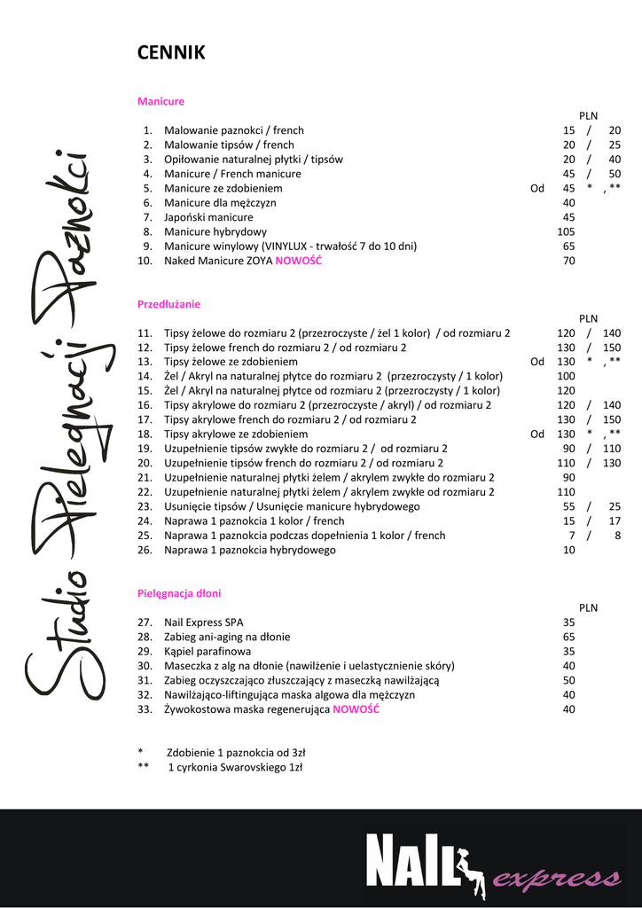 CENNIK Manicure 1. 2. 3. 4. 5. 6. 7. 8. 9. 10. Malowanie paznokci / french Malowanie tipsów / french Opiłowanie naturalnej płytki / tipsów Manicure / French manicure Manicure ze zdobieniem Manicure dla mężczyzn Japoński manicure Manicure hybrydowy Manicure winylowy (VINYLUX - trwałość 7 do 10 dni) Naked Manicure ZOYA NOWOŚĆ Od 15 20 20 45 45 40 45 105 65 70 PLN / / / / * 20 25 40 50 , ** Przedłużanie 11. 12. 13. 14. 15. 16. 17. 18. 19. 20. 21. 22. 23. 24. 25. 26. Tipsy żelowe do rozmiaru 2 (przezroczyste / żel 1 kolor) / od rozmiaru 2 Tipsy żelowe french do rozmiaru 2 / od rozmiaru 2 Tipsy żelowe ze zdobieniem Żel / Akryl na naturalnej płytce do rozmiaru 2 (przezroczysty / 1 kolor) Żel / Akryl na naturalnej płytce od rozmiaru 2 (przezroczysty / 1 kolor) Tipsy akrylowe do rozmiaru 2 (przezroczyste / akryl) / od rozmiaru 2 Tipsy akrylowe french do rozmiaru 2 / od rozmiaru 2 Tipsy akrylowe ze zdobieniem Uzupełnienie tipsów zwykłe do rozmiaru 2 / od rozmiaru 2 Uzupełnienie tipsów french do rozmiaru 2 / od rozmiaru 2 Uzupełnienie naturalnej płytki żelem / akrylem zwykłe do rozmiaru 2 Uzupełnienie naturalnej płytki żelem / akrylem zwykłe od rozmiaru 2 Usunięcie tipsów / Usunięcie manicure hybrydowego Naprawa 1 paznokcia 1 kolor / french Naprawa 1 paznokcia podczas dopełnienia 1 kolor / french Naprawa 1 paznokcia hybrydowego Od Od PLN 120 / 140 130 / 150 130 * , ** 100 120 120 / 140 130 / 150 130 * , ** 90 / 110 110 / 130 90 110 55 / 25 15 / 17 7 / 8 10 Pielęgnacja dłoni PLN 27. 28. 29. 30. 31. 32. 33. Nail Express SPA Zabieg ani-aging na dłonie Kąpiel parafinowa Maseczka z alg na dłonie (nawilżenie i uelastycznienie skóry) Zabieg oczyszczająco złuszczający z maseczką nawilżającą Nawilżająco-liftingująca maska algowa dla mężczyzn Żywokostowa maska regenerująca NOWOŚĆ * ** Zdobienie 1 paznokcia od 3zł 1 cyrkonia Swarovskiego 1zł 35 65 35 40 50 40 40