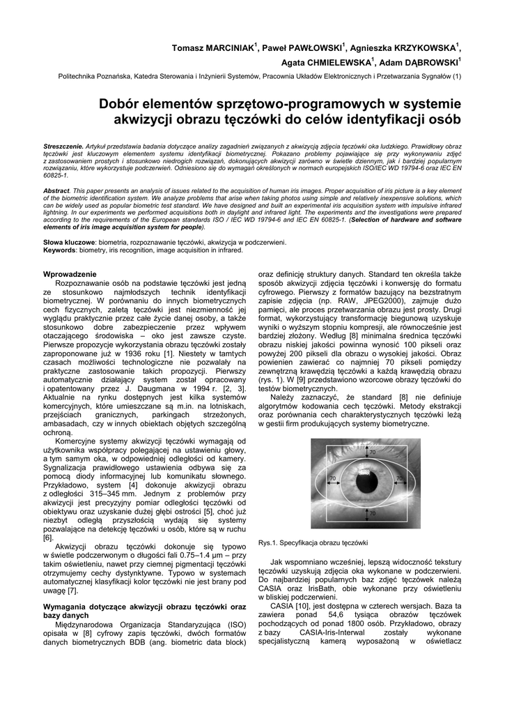 1 1 1 Tomasz MARCINIAK , Paweł PAWŁOWSKI , Agnieszka KRZYKOWSKA , 1 Agata CHMIELEWSKA , Adam DĄBROWSKI 1 Politechnika Poznańska, Katedra Sterowania i Inżynierii Systemów, Pracownia Układów Elektronicznych i Przetwarzania Sygnałów (1) Dobór elementów sprzętowo-programowych w systemie akwizycji obrazu tęczówki do celów identyfikacji osób Streszczenie. Artykuł przedstawia badania dotyczące analizy zagadnień związanych z akwizycją zdjęcia tęczówki oka ludzkiego. Prawidłowy obraz tęczówki jest kluczowym elementem systemu identyfikacji biometrycznej. Pokazano problemy pojawiające się przy wykonywaniu zdjęć z zastosowaniem prostych i stosunkowo niedrogich rozwiązań, dokonujących akwizycji zarówno w świetle dziennym, jak i bardziej popularnym rozwiązaniu, które wykorzystuje podczerwień. Odniesiono się do wymagań określonych w normach europejskich ISO/IEC WD 19794-6 oraz IEC EN 60825-1. Abstract. This paper presents an analysis of issues related to the acquisition of human iris images. Proper acquisition of iris picture is a key element of the biometric identification system. We analyze problems that arise when taking photos using simple and relatively inexpensive solutions, which can be widely used as popular biometric test standard. We have designed and built an experimental iris acquisition system with impulsive infrared lightning. In our experiments we performed acquisitions both in daylight and infrared light. The experiments and the investigations were prepared according to the requirements of the European standards ISO / IEC WD 19794-6 and IEC EN 60825-1. (Selection of hardware and software elements of iris image acquisition system for people). Słowa kluczowe: biometria, rozpoznawanie tęczówki, akwizycja w podczerwieni. Keywords: biometry, iris recognition, image acquisition in infrared. Wprowadzenie Rozpoznawanie osób na podstawie tęczówki jest jedną ze stosunkowo najmłodszych technik identyfikacji biometrycznej. W porównaniu do innych biometrycznych cech fizycznych, zaletą tęczówki jest niezmienność jej wyglądu praktycznie przez całe życie danej osoby, a także stosunkowo dobre zabezpieczenie przez wpływem otaczającego środowiska – oko jest zawsze czyste. Pierwsze propozycje wykorzystania obrazu tęczówki zostały zaproponowane już w 1936 roku [1]. Niestety w tamtych czasach możliwości technologiczne nie pozwalały na praktyczne zastosowanie takich propozycji. Pierwszy automatycznie działający system został opracowany i opatentowany przez J. Daugmana w 1994 r. [2, 3]. Aktualnie na rynku dostępnych jest kilka systemów komercyjnych, które umieszczane są m.in. na lotniskach, przejściach granicznych, parkingach strzeżonych, ambasadach, czy w innych obiektach objętych szczególną ochroną. Komercyjne systemy akwizycji tęczówki wymagają od użytkownika współpracy polegającej na ustawieniu głowy, a tym samym oka, w odpowiedniej odległości od kamery. Sygnalizacja prawidłowego ustawienia odbywa się za pomocą diody informacyjnej lub komunikatu słownego. Przykładowo, system [4] dokonuje akwizycji obrazu z odległości 315–345 mm. Jednym z problemów przy akwizycji jest precyzyjny pomiar odległości tęczówki od obiektywu oraz uzyskanie dużej głębi ostrości [5], choć już niezbyt odległą przyszłością wydają się systemy pozwalające na detekcję tęczówki u osób, które są w ruchu [6]. Akwizycji obrazu tęczówki dokonuje się typowo w świetle podczerwonym o długości fali 0.75–1.4 µm – przy takim oświetleniu, nawet przy ciemnej pigmentacji tęczówki otrzymujemy cechy dystynktywne. Typowo w systemach automatycznej klasyfikacji kolor tęczówki nie jest brany pod uwagę [7]. Wymagania dotyczące akwizycji obrazu tęczówki oraz bazy danych Międzynarodowa Organizacja Standaryzująca (ISO) opisała w [8] cyfrowy zapis tęczówki, dwóch formatów danych biometrycznych BDB (ang. biometric data block) oraz definicję struktury danych. Standard ten określa także sposób akwizycji zdjęcia tęczówki i konwersję do formatu cyfrowego. Pierwszy z formatów bazujący na bezstratnym zapisie zdjęcia (np. RAW, JPEG2000), zajmuje dużo pamięci, ale proces przetwarzania obrazu jest prosty. Drugi format, wykorzystujący transformację biegunową uzyskuje wyniki o wyższym stopniu kompresji, ale równocześnie jest bardziej złożony. Według [8] minimalna średnica tęczówki obrazu niskiej jakości powinna wynosić 100 pikseli oraz powyżej 200 pikseli dla obrazu o wysokiej jakości. Obraz powienien zawierać co najmniej 70 pikseli pomiędzy zewnętrzną krawędzią tęczówki a każdą krawędzią obrazu (rys. 1). W [9] przedstawiono wzorcowe obrazy tęczówki do testów biometrycznych. Należy zaznaczyć, że standard [8] nie definiuje algorytmów kodowania cech tęczówki. Metody ekstrakcji oraz porównania cech charakterystycznych tęczówki leżą w gestii firm produkujących systemy biometryczne. Rys.1. Specyfikacja obrazu tęczówki Jak wspomniano wcześniej, lepszą widoczność tekstury tęczówki uzyskują zdjęcia oka wykonane w podczerwieni. Do najbardziej popularnych baz zdjęć tęczówek należą CASIA oraz IrisBath, obie wykonane przy oświetleniu w bliskiej podczerwieni. CASIA [10], jest dostępna w czterech wersjach. Baza ta zawiera ponad 54,6 tysiąca obrazów tęczówek pochodzących od ponad 1800 osób. Przykładowo, obrazy z bazy CASIA-Iris-Interwal zostały wykonane specjalistyczną kamerą wyposażoną w oświetlacz w kształcie koła z bardzo jasnych diod NIR (ang. Near InfraRed). Zdjęcia oka są wykonywane z rozdzielczością 320x280 w bardzo bliskiej odległości od oka w warunkach wewnętrznych. W bazie CASIA-Iris-Distance akwizycja obu oczu i wzorca twarzy odbywa się z odległości 3 metrów za pomocą kamery o wysokiej rozdzielczości (2352x1728). Kolejną bazą zawierającą zdjęcia oczu w podczerwieni jest IrisBath [11]. Baza danych zawiera po 20 zdjęć 