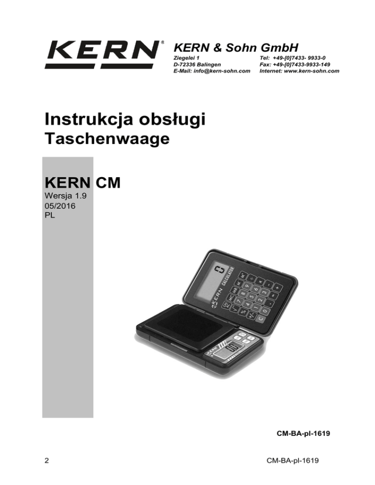KERN & Sohn GmbH Ziegelei 1 D-72336 Balingen E-Mail: [email protected] Tel: +49-[0]7433- 9933-0 Fax: +49-[0]7433-9933-149 Internet: www.kern-sohn.com Instrukcja obsługi Taschenwaage KERN CM Wersja 1.9 05/2016 PL CM-BA-pl-1619 2 CM-BA-pl-1619 PL KERN CM Wersja 1.9 05/2016 Instrukcja obsługi Waga kieszonkowa Spis treści 1 Dane tec hnic zne ............................................................................................ 4 2 Deklarac ja zgodnoś c i .................................................................................... 5 3 W s kazówki pods tawowe (informac je ogólne) ............................................. 6 3.1 3.2 3.3 3.4 Zastosowanie zgodnie z przeznaczeniem .................................................................. 6 Zastosowanie niezgodne z przeznaczeniem .............................................................. 6 Gwarancja ................................................................................................................. 6 Nadzór nad środkami kontrolnymi.............................................................................. 6 4 P ods tawowe ws kazówki bezpiec zeńs twa ................................................... 7 4.1 4.2 Przestrzeganie wskazówek zawartych w instrukcji obsługi ........................................ 7 Przeszkolenie personelu ............................................................................................ 7 5 T rans port i s kładowanie ................................................................................ 7 5.1 5.2 Kontrola przy odbiorze ............................................................................................... 7 Opakowanie ............................................................................................................... 7 6 R ozpakowanie, us tawienie i uruc homienie ................................................. 8 6.1 6.2 Miejsce ustawienia, miejsce eksploatacji ................................................................... 8 Rozpakowanie ........................................................................................................... 8 6.2.1 6.2.2 Ustawianie .................................................................................................................................. 8 Zakres dostawy........................................................................................................................... 9 6.3 6.4 6.5 6.6 6.7 Praca z zasilaniem akumulatorowym i wymiana akumulatorów ................................. 9 Osłona przeciwwiatrowa + szalka wagi (CM 50-C2N, CM 500-GN1) ......................... 9 Pierwsze uruchomienie .............................................................................................10 Justowanie ................................................................................................................10 Justowanie ................................................................................................................10 7 E ks ploatac ja ................................................................................................. 11 Widok wskaźnika CM 60-2N / CM 150-1N / CM 320-1N / CM 1K1N .........................11 Widok wskaźnika CM 50-C2N ..................................................................................11 Widok wskaźnika CM 500-GN1 ................................................................................11 Obsługa ....................................................................................................................11 7.1 7.2 7.3 7.4 7.4.1 7.4.2 7.4.3 7.4.4 7.4.5 Ważenie .................................................................................................................................... 11 Tarowanie ................................................................................................................................. 12 Ważenie plus/minus ................................................................................................................. 12 Ważenie netto-ogółem .............................................................................................................. 12 Obce jednostki wagowe ............................................................................................................ 13 7.5 7.6 Podświetlenie wskaźnika ..........................................................................................14 Funkcje kalkulatora kieszonkowego..........................................................................15 8 K ons erwac ja, utrzymywanie w s tanie s prawnoś c i, utylizac ja ................. 15 8.1 8.2 8.3 Czyszczenie..............................................................................................................15 Konserwacja, utrzymywanie w stanie sprawności .....................................................15 Utylizacja ..................................................................................................................15 9 P omoc w przypadku drobnyc h awarii ........................................................ 16 CM-BA-pl-1619 3 1 Dane techniczne KERN Dokł. odczytu (d) CM 60-2N CM150-1N CM 320-1N CM 1K1N 0,01 g 0,1 g 0,1 g 1g Zakres ważenia (maks.) 60 g 150 g 320 g 1000 g Zakres tary (subtraktywny) 60 g 150 g 320 g 1000 g Zalecana masa kalibracyjna, niedodana (klasa) 50 g (M2) 100 g (M3) 200 g (M3) 1000 g (M3) Temperatura pracy 18 – 25°C Jednostki wagowe g / tol / tlt Dopuszczalna względna wilgotność powietrza < 85% (bez kondensacji) Płytka wagi mm 70 x 80 Cała waga (S x W x G) mm KERN Dokł. odczytu (d) 85 x 130 x 25 CM 50-C2N CM 500-GN1 0,01 ct 0,002 g 0,1 gn 0,01 g Zakres ważenia (maks.) 50 ct 10 g 500 gn 32 g Zakres tary (subtraktywny) 50 ct 10 g 500 gn 32 g Odważnik wzorcowy dodany Jednostki wagowe Temperatura pracy Dopuszczalna względna wilgotność powietrza Płytka wagi mm Cała waga (S x W x G) mm 4 5 g (M1) 10 g (M2) ct / g g / gn 18 – 25°C < 85% (bez konden