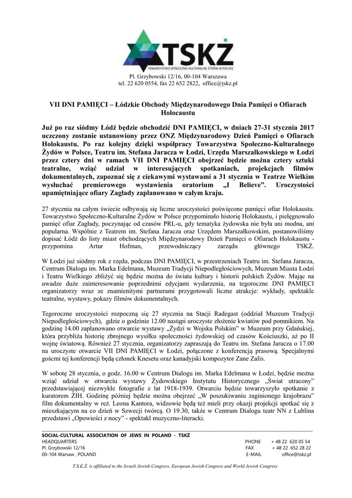 Pl. Grzybowski 12/16, 00-104 Warszawa tel. 22 620 0554, fax 22 652 2822, [email protected] VII DNI PAMIĘCI – Łódzkie Obchody Międzynarodowego Dnia Pamięci o Ofiarach Holocaustu Już po raz siódmy Łódź będzie obchodzić DNI PAMIĘCI, w dniach 27-31 stycznia 2017 uczczony zostanie ustanowiony przez ONZ Międzynarodowy Dzień Pamięci o Ofiarach Holokaustu. Po raz kolejny dzięki współpracy Towarzystwa Społeczno-Kulturalnego Żydów w Polsce, Teatru im. Stefana Jaracza w Łodzi, Urzędu Marszałkowskiego w Łodzi przez cztery dni w ramach VII DNI PAMIĘCI obejrzeć będzie można cztery sztuki teatralne, wziąć udział w interesujących spotkaniach, projekcjach filmów dokumentalnych, zapoznać się z ciekawymi wystawami a 31 stycznia w Teatrze Wielkim wysłuchać premierowego wystawienia oratorium „I Believe”. Uroczystości upamiętniające ofiary Zagłady zaplanowano w całym kraju. 27 stycznia na całym świecie odbywają się liczne uroczystości poświęcone pamięci ofiar Holokaustu. Towarzystwo Społeczno-Kulturalne Żydów w Polsce przypominało historię Holokaustu, i pielęgnowało pamięć ofiar Zagłady, poczynając od czasów PRL-u, gdy tematyka żydowska nie była ani modna, ani popularna. Wspólnie z Teatrem im. Stefana Jaracza oraz Urzędem Marszałkowskim, postanowiliśmy dopisać Łódź do listy miast obchodzących Międzynarodowy Dzień Pamięci o Ofiarach Holokaustu przypomina Artur Hofman, przewodniczący zarządu głównego TSKŻ. W Łodzi już siódmy rok z rzędu, podczas DNI PAMIĘCI, w przestrzeniach Teatru im. Stefana Jaracza, Centrum Dialogu im. Marka Edelmana, Muzeum Tradycji Niepodległościowych, Muzeum Miasta Łodzi i Teatru Wielkiego zbliżyć się będzie można do świata kultury i historii polskich Żydów. Mając na uwadze duże zainteresowanie poprzednimi edycjami wydarzenia, na tegoroczne DNI PAMIĘCI organizatorzy wraz ze znamienitymi partnerami przygotowali liczne atrakcje: wykłady, spektakle teatralne, wystawy, pokazy filmów dokumentalnych. Tegoroczne uroczystości rozpoczną się 27 stycznia na Stacji Radegast (oddział Muzeum Tradycji Niepodległościowych), gdzie o godzinie 12.00 nastąpi uroczyste złożenie kwiatów pod pomnikiem. Na godzinę 14.00 zaplanowano otwarcie wystawy „Żydzi w Wojsku Polskim” w Muzeum przy Gdańskiej, która przybliża historię zbrojnego wysiłku społeczności żydowskiej od czasów Kościuszki, aż po II wojnę światową. Również 27 stycznia, organizatorzy zapraszają do Teatru im. Stefana Jaracza o 17.00 na uroczyste otwarcie VII DNI PAMIĘCI w Łodzi, połączone z konferencją prasową. Specjalnymi goścmi tej konferencji będą członek Knesetu oraz kanadyjski kompozytor Zane Zalis. W sobotę 28 stycznia, o godz. 16.00 w Centrum Dialogu im. Marka Edelmana w Łodzi, będzie można wziąć udział w otwarciu wystawy Żydowskiego Instytutu Historycznego „Świat utracony” przedstawiającej niezwykłe fotografie z lat 1918-1939. Otwarciu będzie towarzyszyło spotkanie z kuratorem ŻIH. Godzinę później będzie można obejrzeć „W poszukiwaniu zaginionego krajobrazu” film dokumentalny w reż. Leona Kantora, widzowie będą też mieli przy okazji projekcji spotkać się z mieszkającym na co dzień w Szwecji twórcą. O 19.30, także w Centrum Dialogu teatr NN z Lublina przedstawi „Opowieści z nocy” - spektakl muzyczno-literacki. __________________________________________________________________________________________________________________________________________ SOCIAL-CULTURAL ASSOCIATION OF JEWS IN POLAND - TSKŻ HEADQUARTERS PHONE + 48 22 620 05 54 Pl. Grzybowski 12/16 FAX + 48 22 652 28 22 00-104 Warsaw , POLAND E-MAIL [email protected] T.S.K.Ż. is affiliated to the Israeli Jewish Congress, European Jewish Congress and World Jewish Congress W niedzielę 28 stycznia, Teatr Jaracza zaprasza najmłodszych widzów na spektakl „Opowieść o Golemie”. O 12.30 dla dorosłych w Muzeum Miasta Łodzi będzie możńa wysłuchać wykładu „Tożsamość Żydowska w twórczości braci Hirszenbergów”. O 13.00 można też wybrać się na oprowadzanie po wystawie „Atlas nowoczesności” w Muzeum Sztuki. O 17.00 w Teatrze Jaracza wysłuchać będzie można „Pieśni o zamordowanym narodzie” - spektaklu opartego na poezji i wspomnieniach z czasów wojny. W poniedziałek 30 stycznia w Teatrze Jaracza zaprezentowany zostanie film dokumentalny wyświetlany podczas ostatniego festiwalu Żydowskie Motywy. Wcześniej młodzież szkolna będzie mogła skorzystać ze specjalnie przygotowanego pakietu edukacyjnego. O 19.00 będzie można obejrzeć spektakl „Irena Sendler – sprawiedliwa” w reż. Tomasza Bednarka. Na wtorek organizatorzy zapraszają młodzież na spotkanie z ambasador Izraela Anną Azari w Centrum Dialogu. Tegoroczne DNI PAMIĘCI zakończy premierowe wystawienie w Teatrze Wielkim oratorium „I Believe” kanadyjskiego twórcy Zane’a Zalisa. „I Believe” to dzieło koncertowe o Holokauście. Przy użyciu środków muzyki i słowa, przedstawia opowieść o nienawiści, przetrwaniu i nadziei z perspektywy ofiar i sprawców. Oratorium wykona stu osobowy chór ze Stuttgartu Solitude, soliści, orkiestra Teatru Wielkiego w Łodzi oraz chór dziecięcy pod batutą Klausa Breuningera. Organizatorzy DNI PAMIĘCI z roku na rok rozszerzają ofertę o nowe elementy. Wychodząc naprzeciw oczekiwaniom naszych odbiorców stworzyliśmy specjalny PAKIET EDUKACYJNY dla szkół i grup zorganizowanych, zawierający spotkania i warsztaty oraz spektakl dla dzieci, dzięki którym młodzież będzie miała okazję bliżej zapoznać się z kulturą i historią polskich żydów jak i z historią drugiej wojny światowej. W pakiecie zaoferowaliśmy specjalny warsztat dotyczący Braci Hirszenberg który poprowadzi Anna Łagodzińska z Muzeum Miasta Łodzi oraz spektakl dla najmłodszych „Opowieść o Golemie”. Kolejnym, niezwykle ciekawym punktem tego pakietu jest warsztat